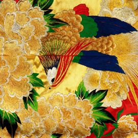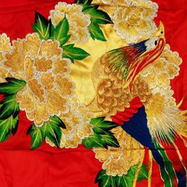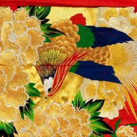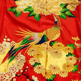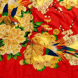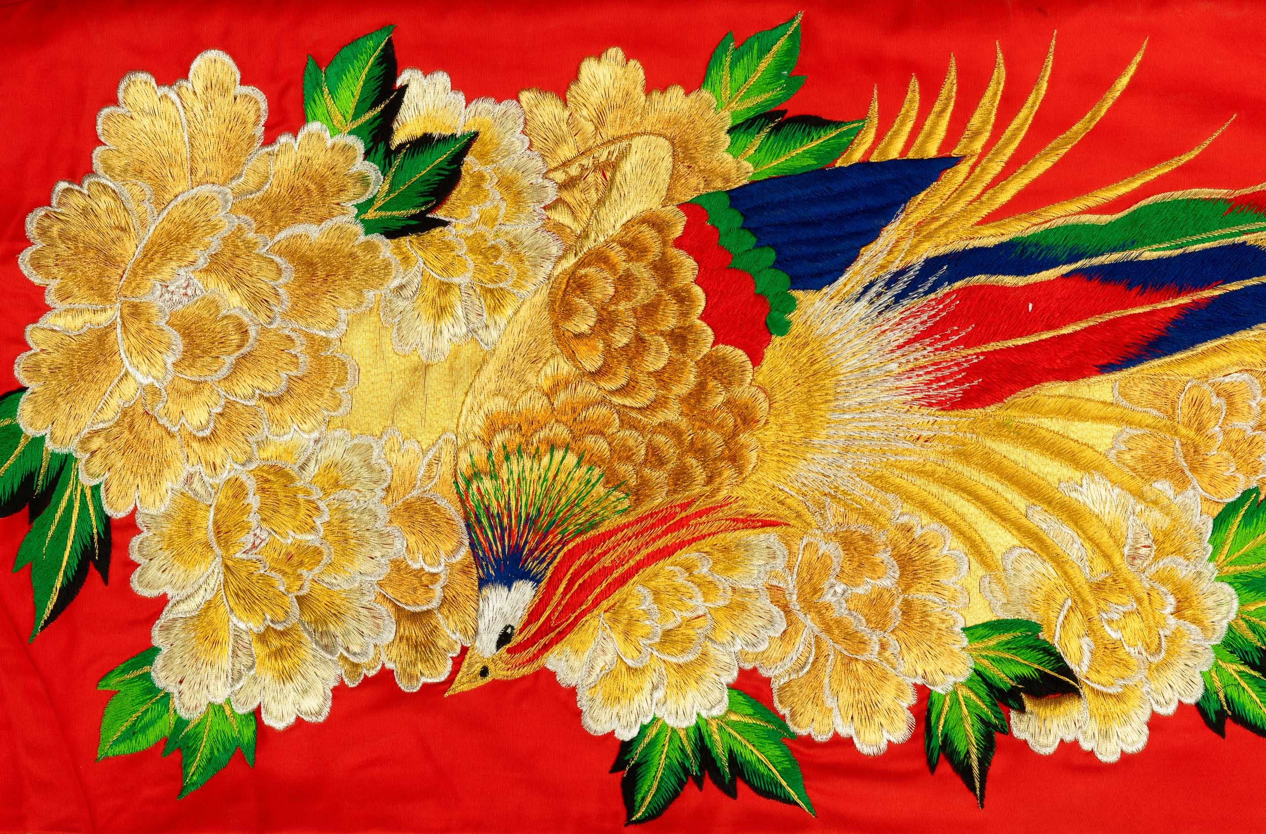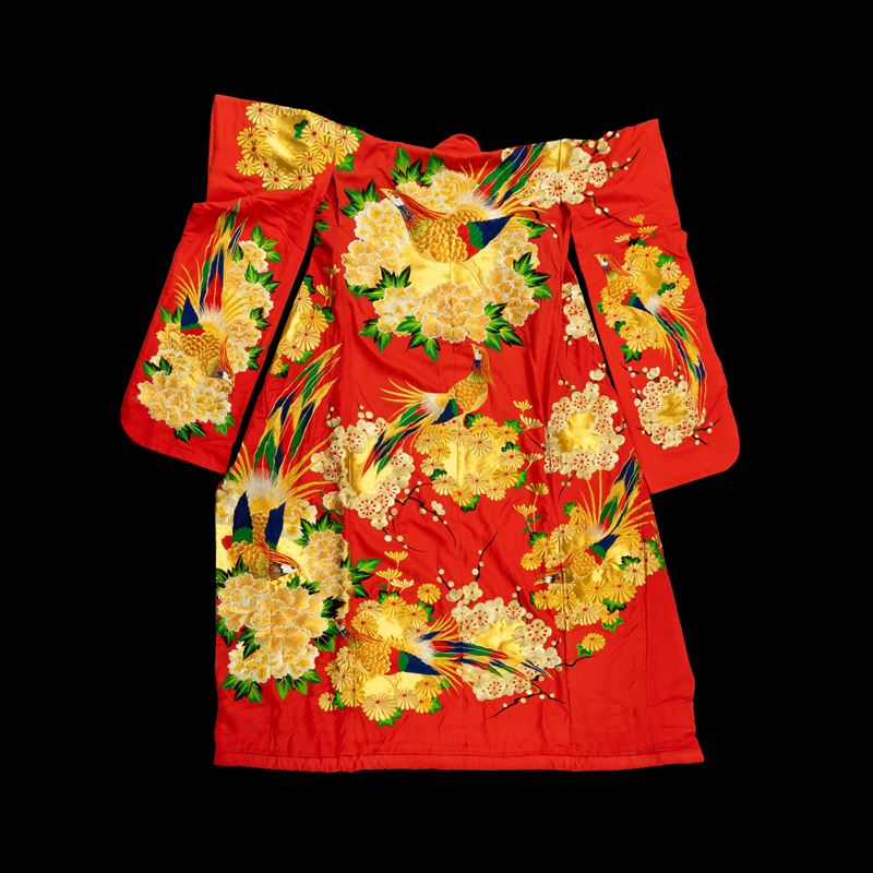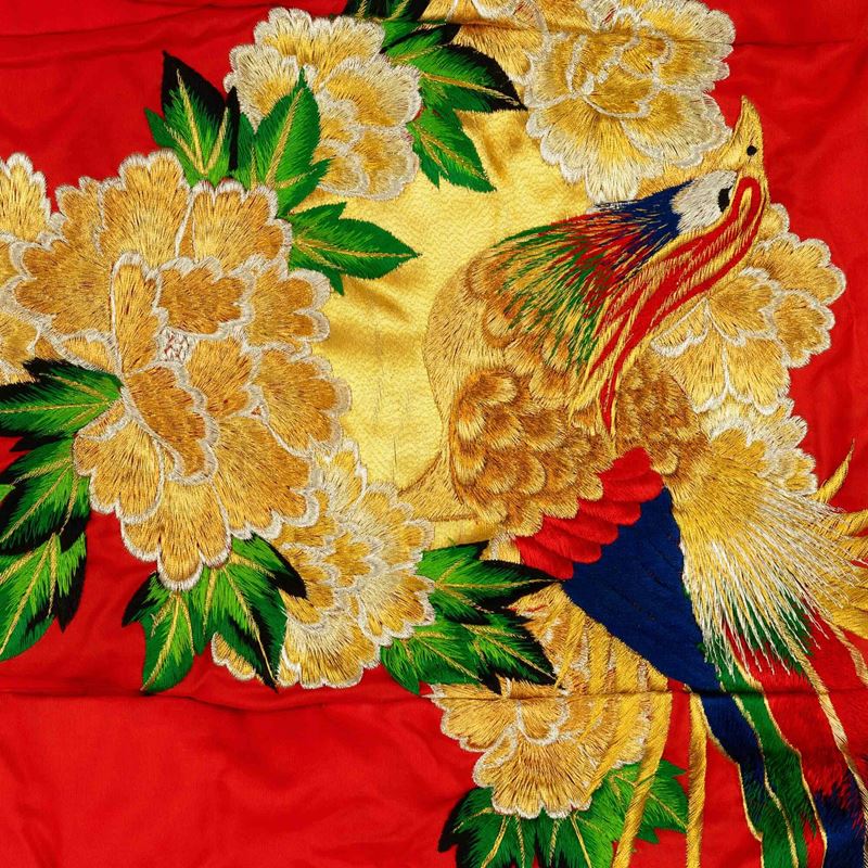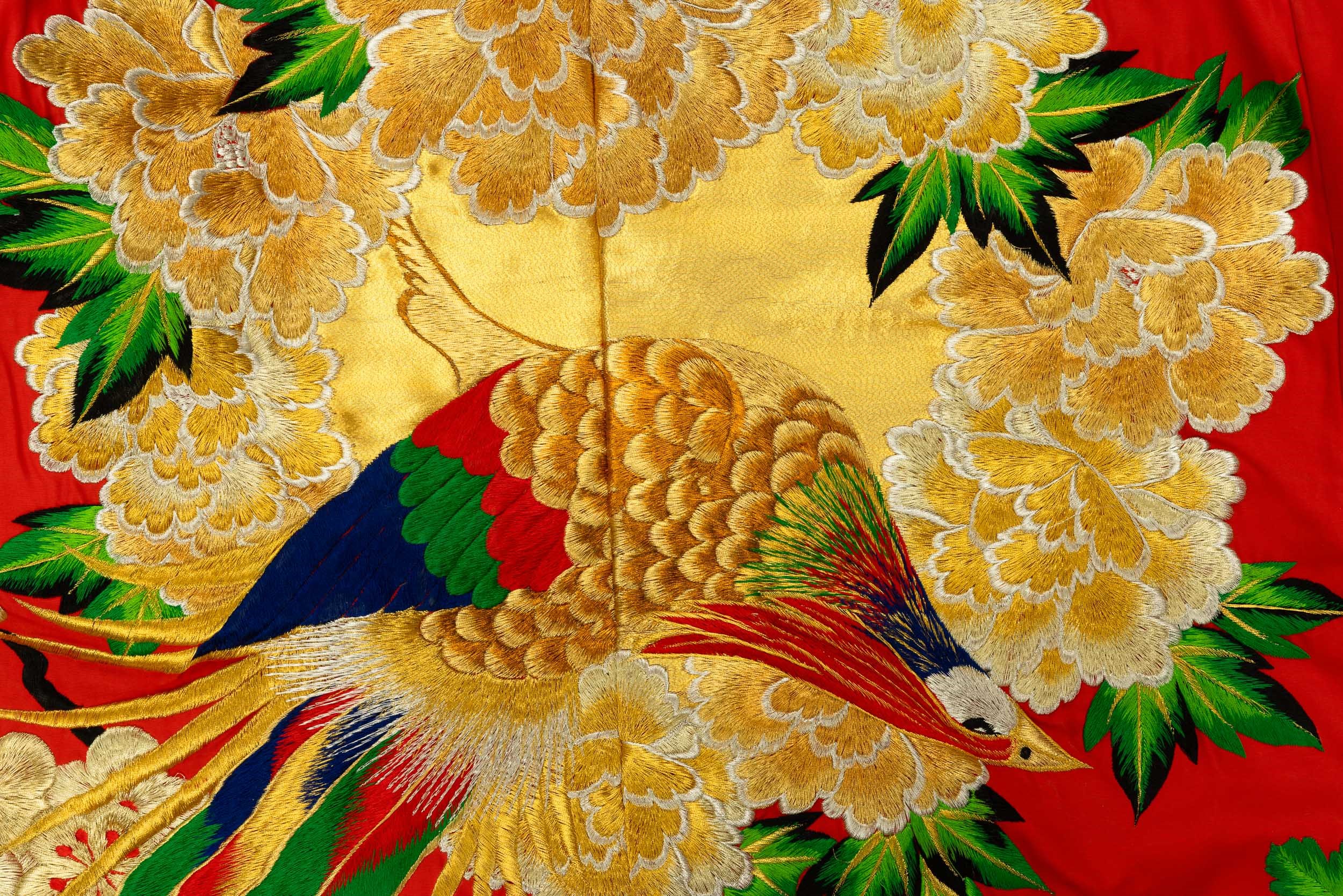Kimono cerimoniale in seta rossa ricamato a motivi naturalistici, Giappone, XX secolo