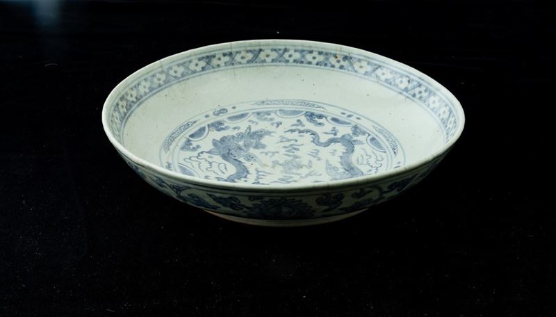 Piatto in porcellana bianca e blu a decoro di draghi, Cina, Dinastia Qing, XVIII secolo