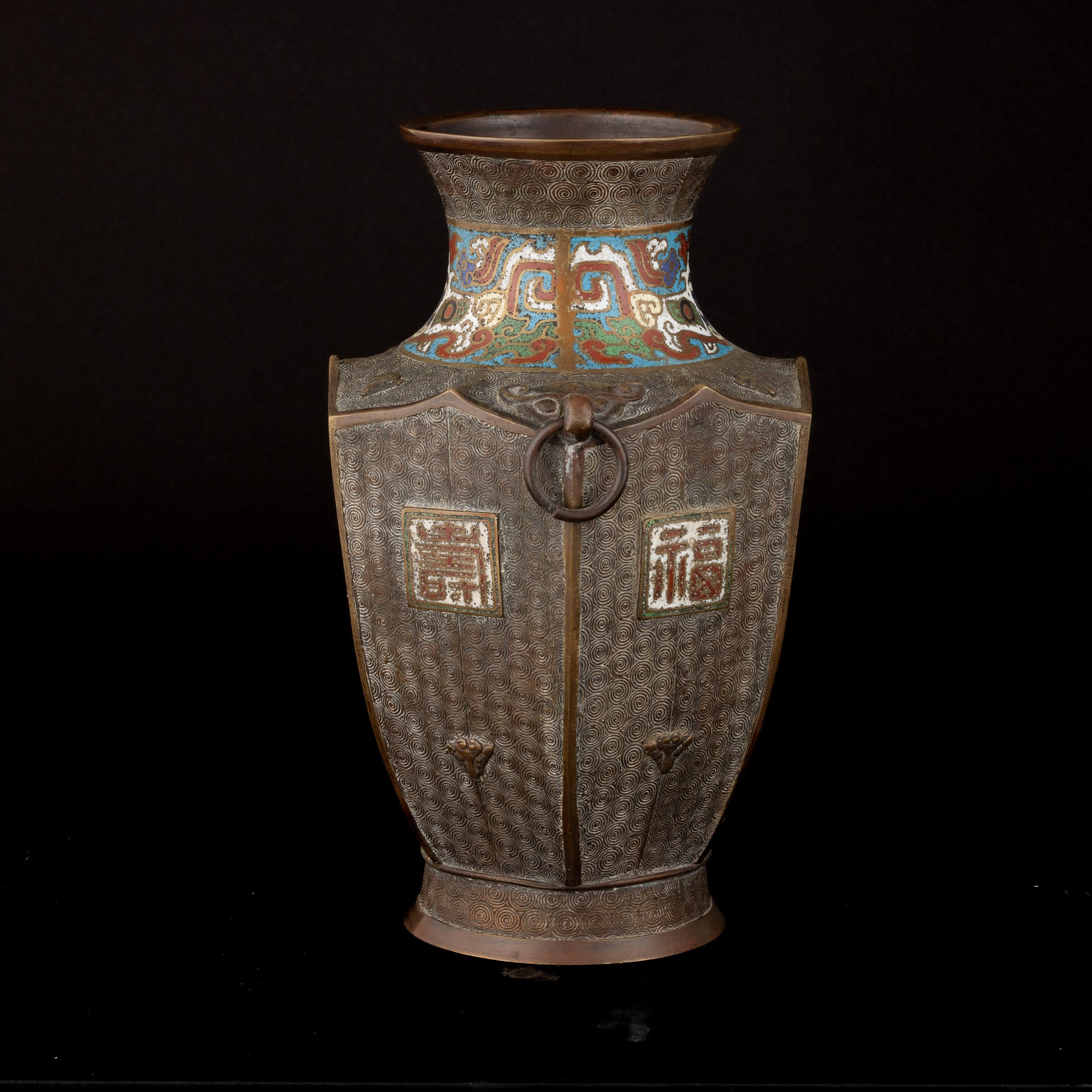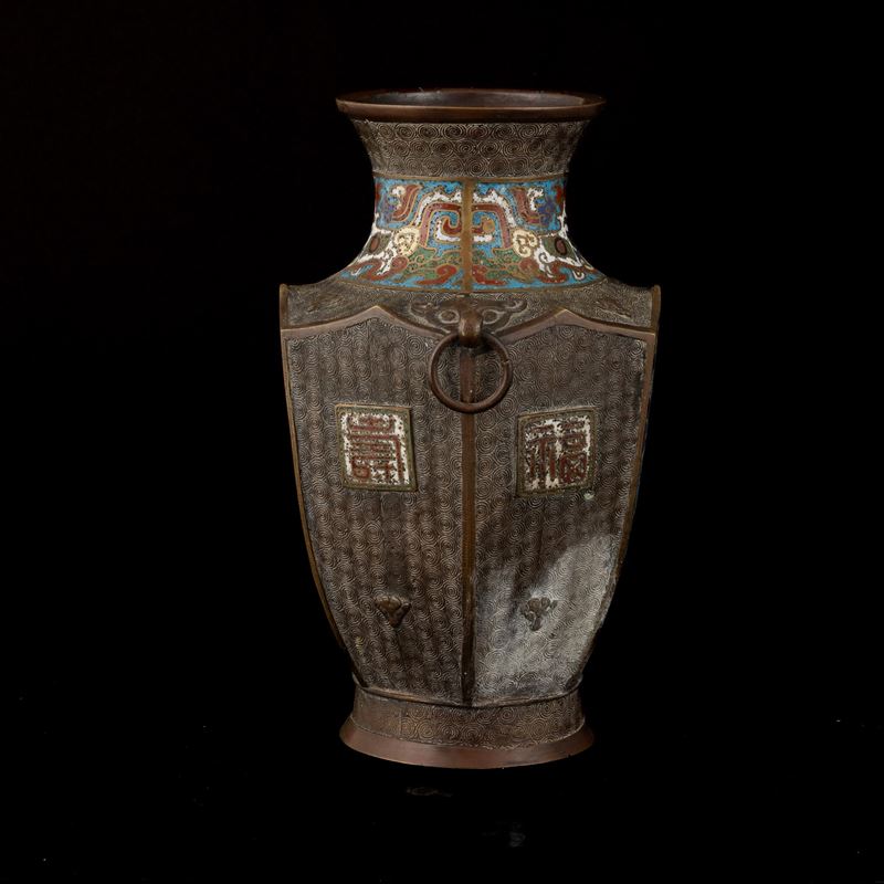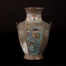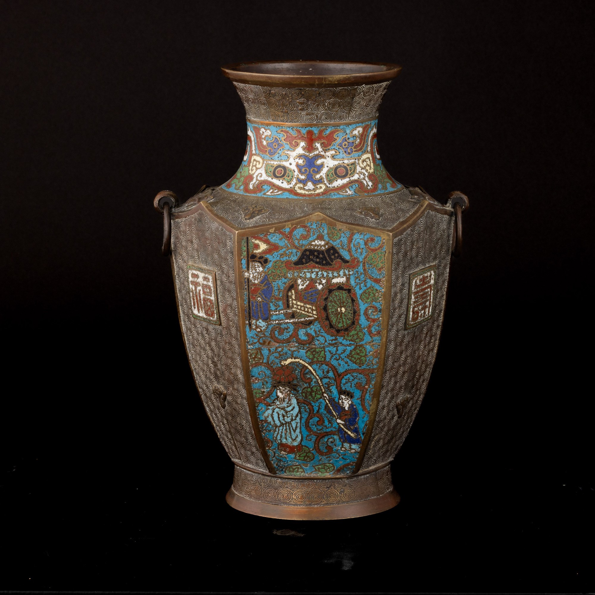 Vaso a smalti cloisonnè con manici ad anello raffigurante scena di vita comune e iscrizioni, Giappone, XIX secolo