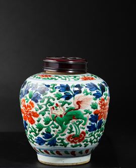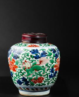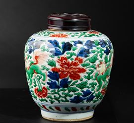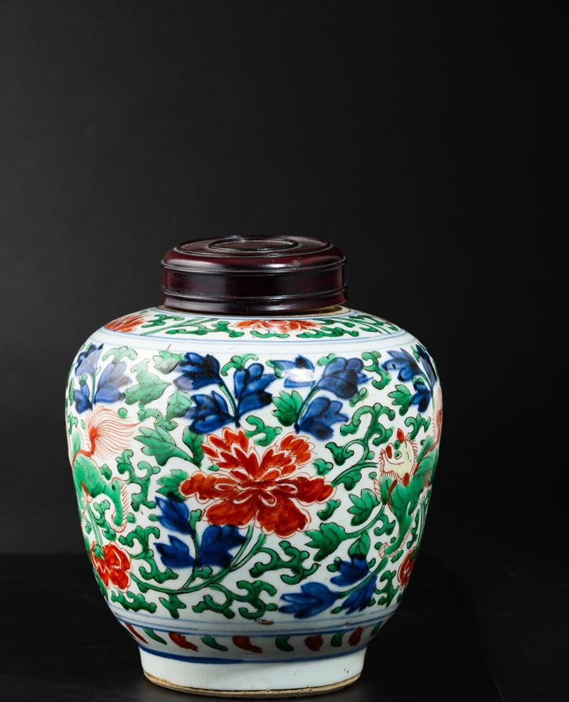 Vaso in porcellana con coperchio a decoro floreale, Famiglia Verde, Cina, Dinastia Qing, XIX secolo