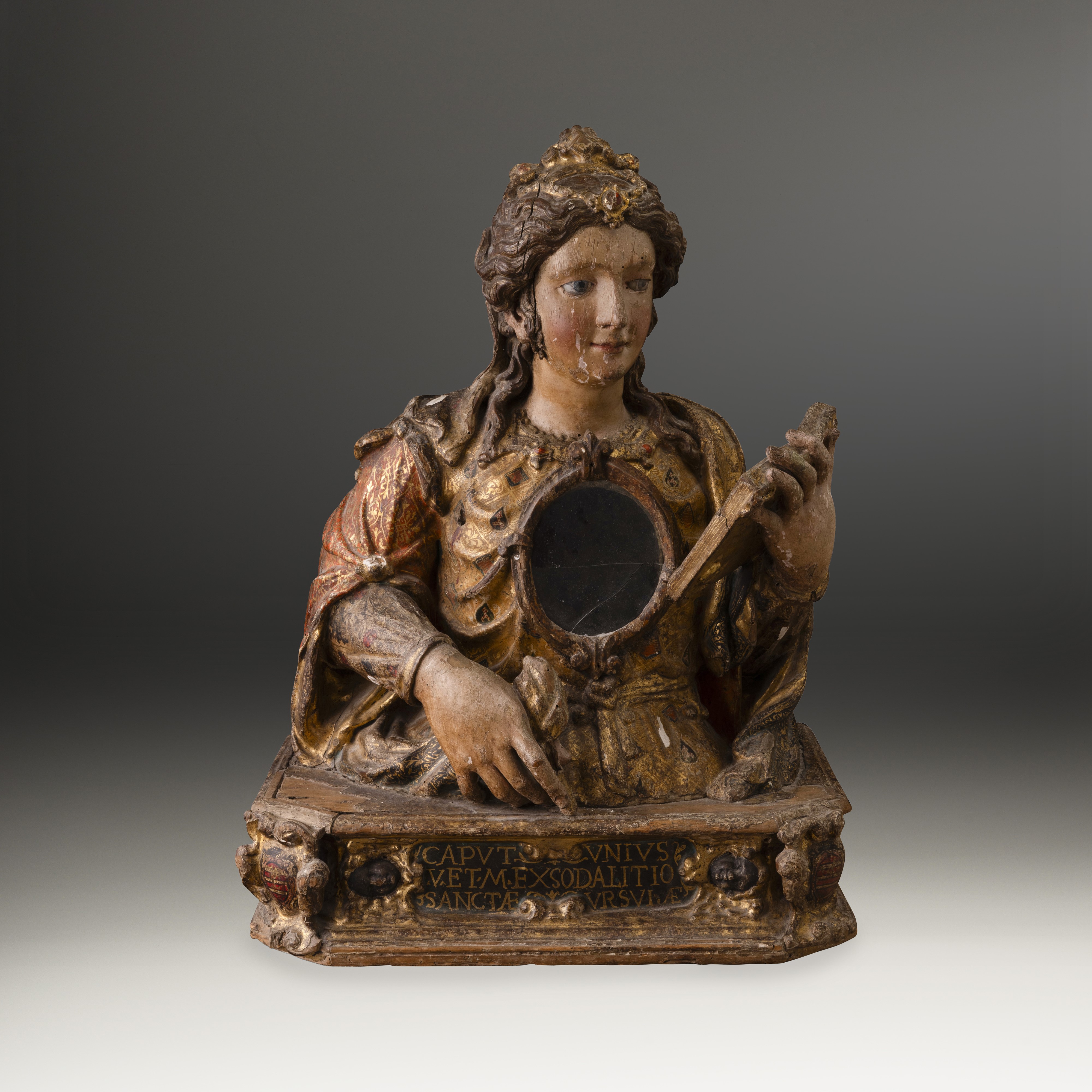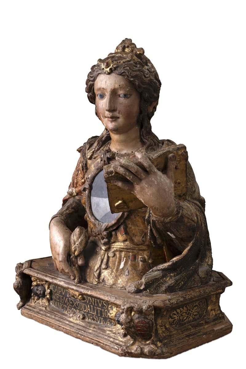 La maestosità della Santa, sviluppata come un prezioso reliquiario, finissimamente scolpito e riccamente dipinto e dorato, ben esprime il rango di principessa della martire, stilisticamente si identifica nei modelli del primo barocco napoletano, riecheggianti di influenze spagnole come nell'uso della tecnica del esto fados, portata in terra partenopea dalle numerose colonie di artisti lombardi e spagnoli, già presenti dal primo Cinquecento. Ci aiutano nella datazione dell'opera una delle due iscrizioni che si trovano nel basamento, incorniciate da eleganti riserve a volute, in particolare quella sul verso che recita "D-PETRUS ALOYSIUS-CARAFA-EPISCOPUS-TRICARICENSIS" che fa chiaramente riferimento all'episcopato nella città lucana di Tricarico del vescovo Pier Luigi Carafa Senior che resse la diocesi dal 1624 al 1645. Nato a Napoli nel 1581, figlio del marchese Ottavio Carafa della Stadera e da Costanza Carafa dei conti di Policastro, proveniva da una delle maggiori casate del Regno di Napoli. Formatosi negli studi presso i gesuiti conseguendo la laurea in giurisprudenza civile e canonica, si trasferì a Roma nel 1607 dove Papa Paolo V lo nominò, nel 1614, vice legato a Ferrara e governatore di Fermo. Dopo l'elezione a vescovo di Tricarico, Papa Urbano VIII gli affidò l'importante incarico di Nunzio Apostolico nella Germania meridionale per rafforzare le posizioni cattoliche dalle correnti scismatiche calviniste e protestanti. Fu proprio nella città di Colonia, che aveva dato i natali a Sant'Orsola, che Carafa svolse con grande capacità, apprezzamento e sostegno dalla nobiltà locale, la sua opera politica e religiosa. Fu proprio questo importante risultato che fece sì che venisse celebrato dal vescovo Carafa con la realizzazione di questa preziosa testimonianza di fede dedicata alla santa martire di Colonia di cui probabilmente aveva ricevuto in dono dei sacri resti.
