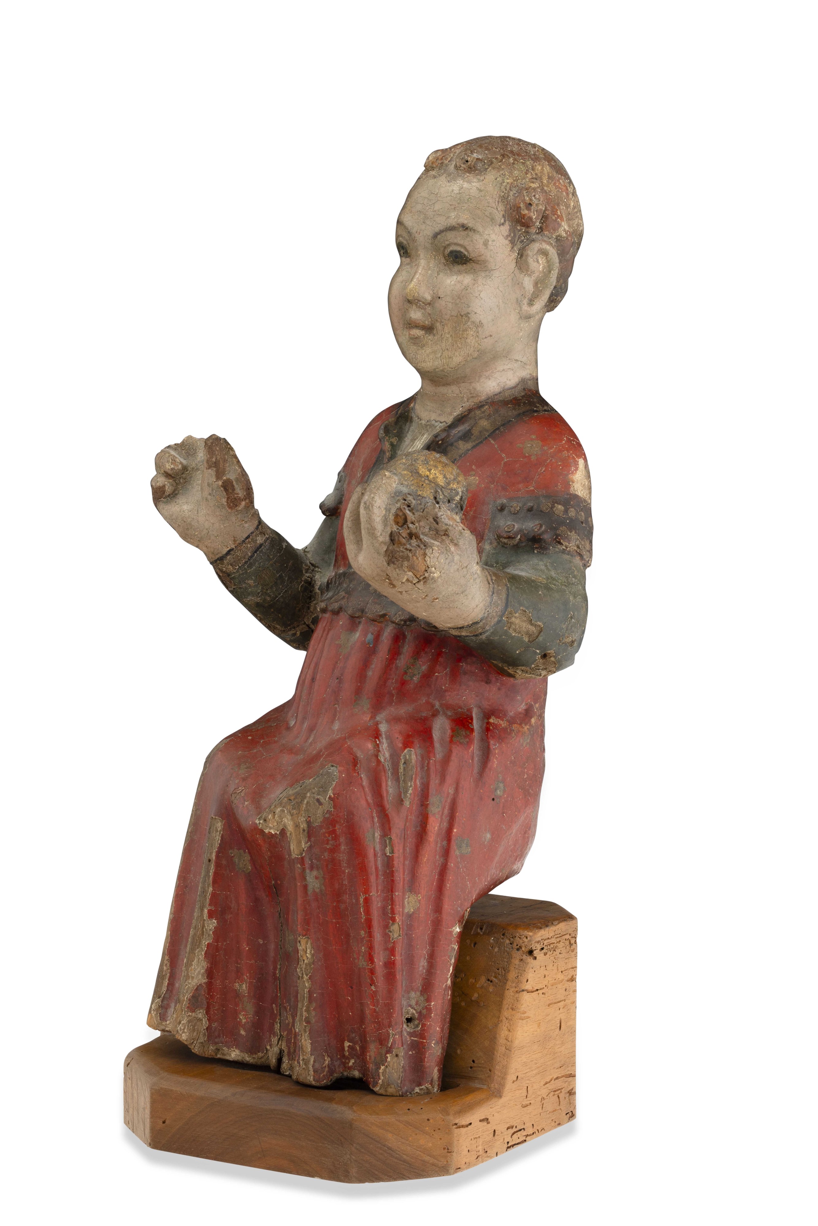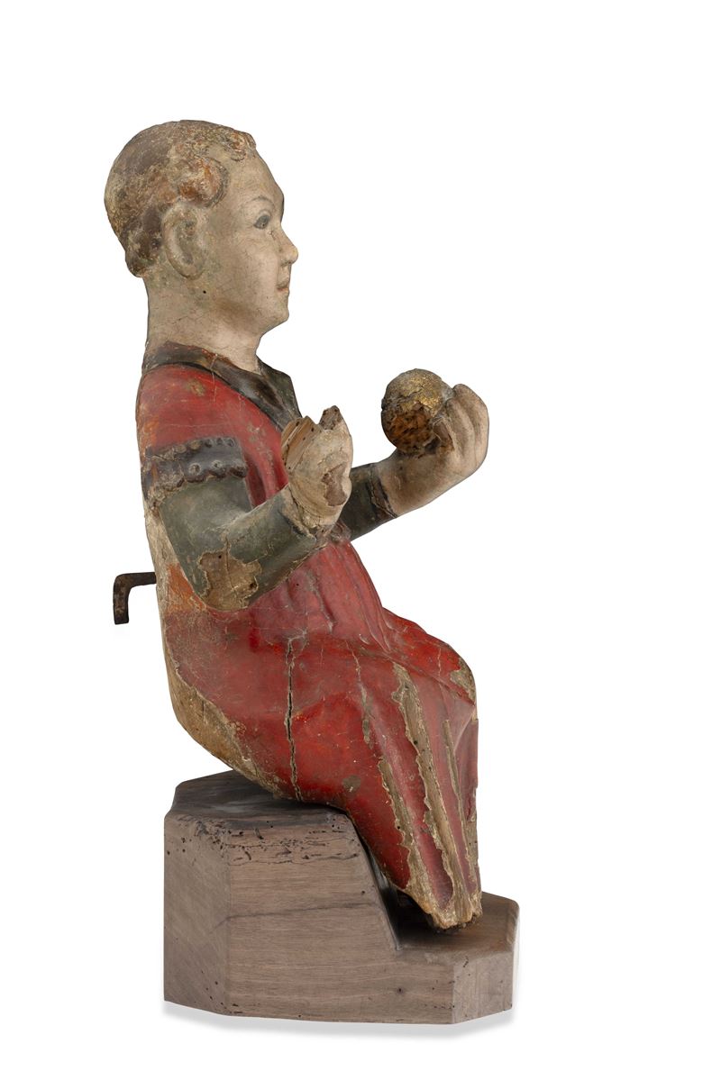 La raffinata scultura, sicuramente parte di una grande Maestà, dove il Gesù bambino è rappresentato assiso e vestito di una lunga tunica ad ampie pieghe, tipica reminiscenza della classicità antica, mentre sorridente benedice i fedeli, stringendo nell'altra mano il globus cruciger, può essere ascritta all'importante produzione di Maestà lignee policrome trecentesche, sviluppatasi nelle regioni dell'Italia centrale tra la Toscana e l'Abruzzo, caratterizzate da un elegante e vivido naturalismo espressivo.