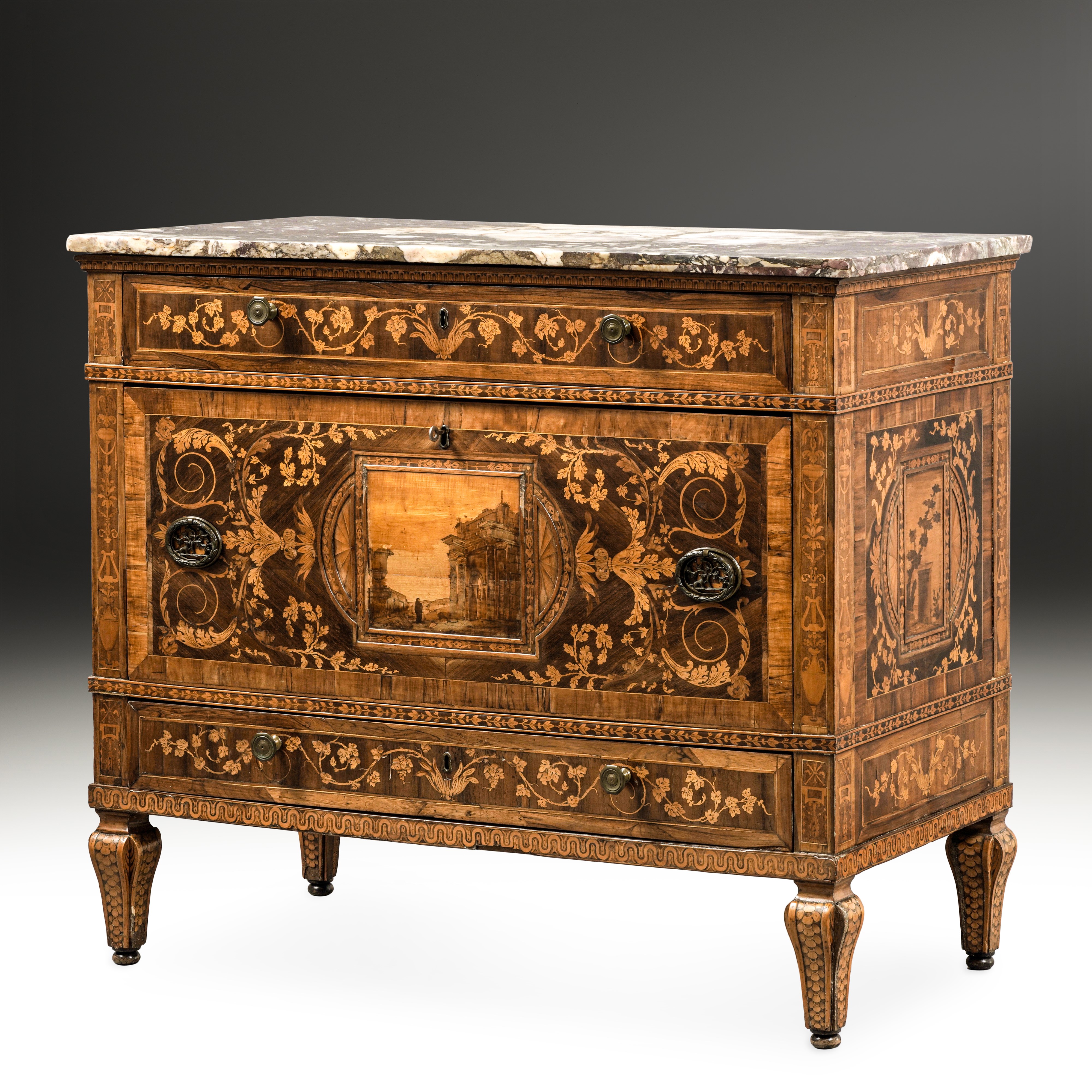 Lastronato e intarsiato in noce, palissandro, acero, ciliegio e legno tinto. Fronte a tre cassetti di cui il mediano di dimensioni più grandi. Fronte e fianchi centrati da riserve in rilievo che contengono intarsi di foglie susseguenti e di raggiere e che incorniciano paesaggi con rovine architettoniche e figure; sul lastrone di palissandro si stagliano fitti intarsi chiari di girali e racemi fogliati. I cassetti più piccoli, delimitati da fasce intarsiate a foglie e modanature, sono arricchiti da vaso centrale da cui si dipartono tralci di vite. Candelabra angolari sia sul fronte che sui fianchi. Piedi sagomati e intarsiati a fiori concatenati. Piano in marmo.