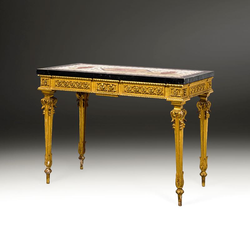 Consolle in legno intagliato e dorato con decori neoclassici di ovoli, fiori, dentelli nella fascia sottopiano, foglie d'acanto nelle alte gambe rastremate.