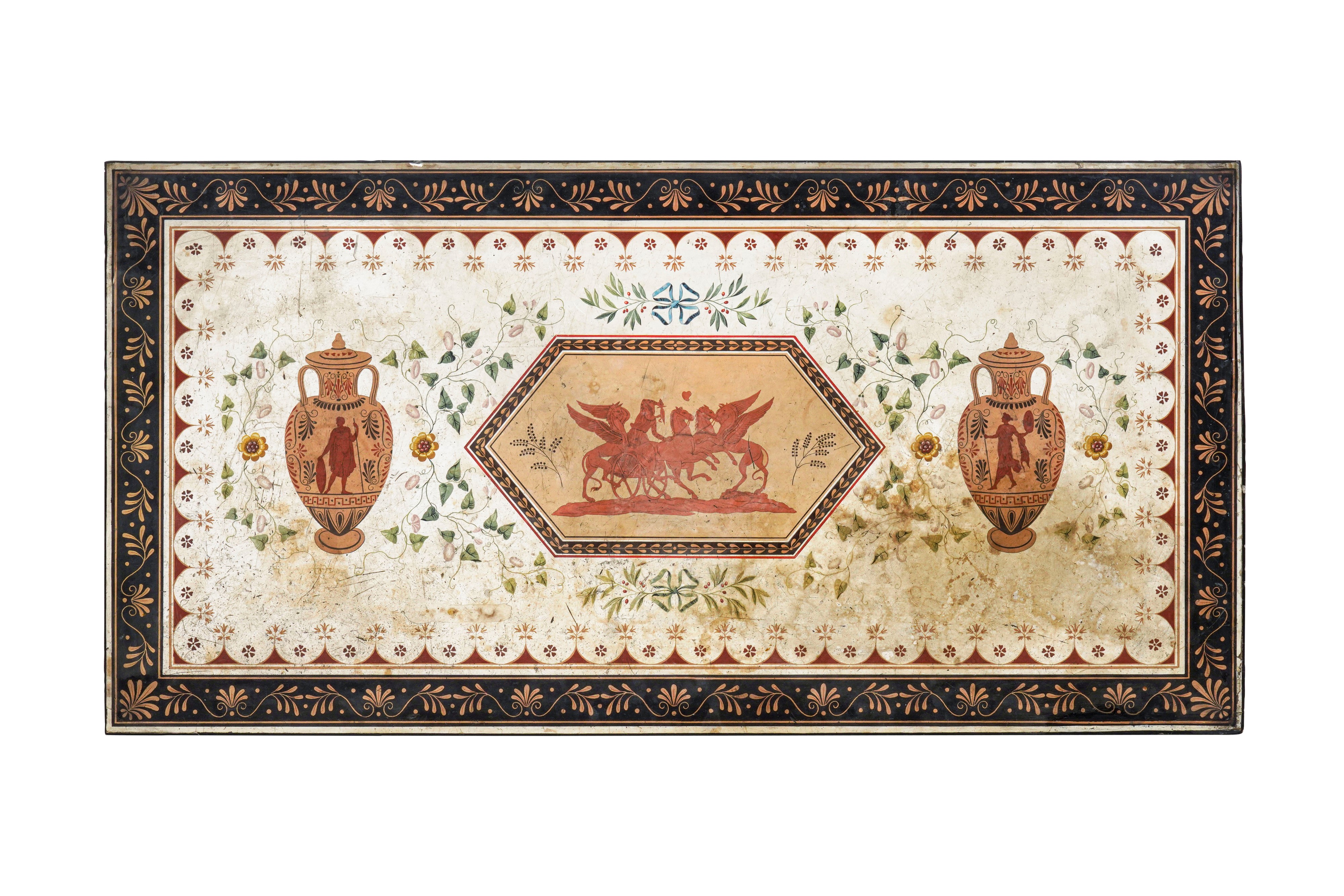 Il bel ripiano di gusto archeologico presenta un vasto campo bianco incorniciato da un marcato fregio con volute e palmette rosse su fondo nero, cui segue un più fine motivo ad archetti ed elementi floreali stilizzati.