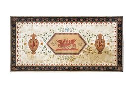 Il soggetto del raffinato medaglione centrale è tratto dalla mitologia classica e raffigura la biga di un Arimaspo assalita da due Grifoni: nel VII libro della sua Naturalis Historia Plinio cita la popolazione degli Arimaspi, leggendari individui originari della Scizia, dotati probabilmente di un solo occhio e in costante lotta contro i Grifoni per il possesso dell’oro delle miniere di cui queste creature alate erano custodi.