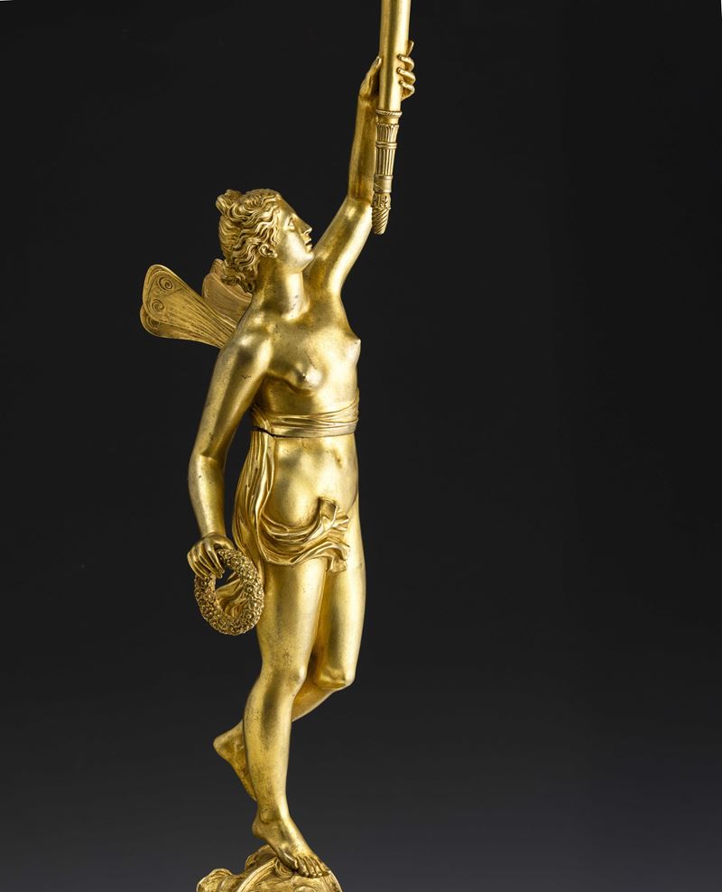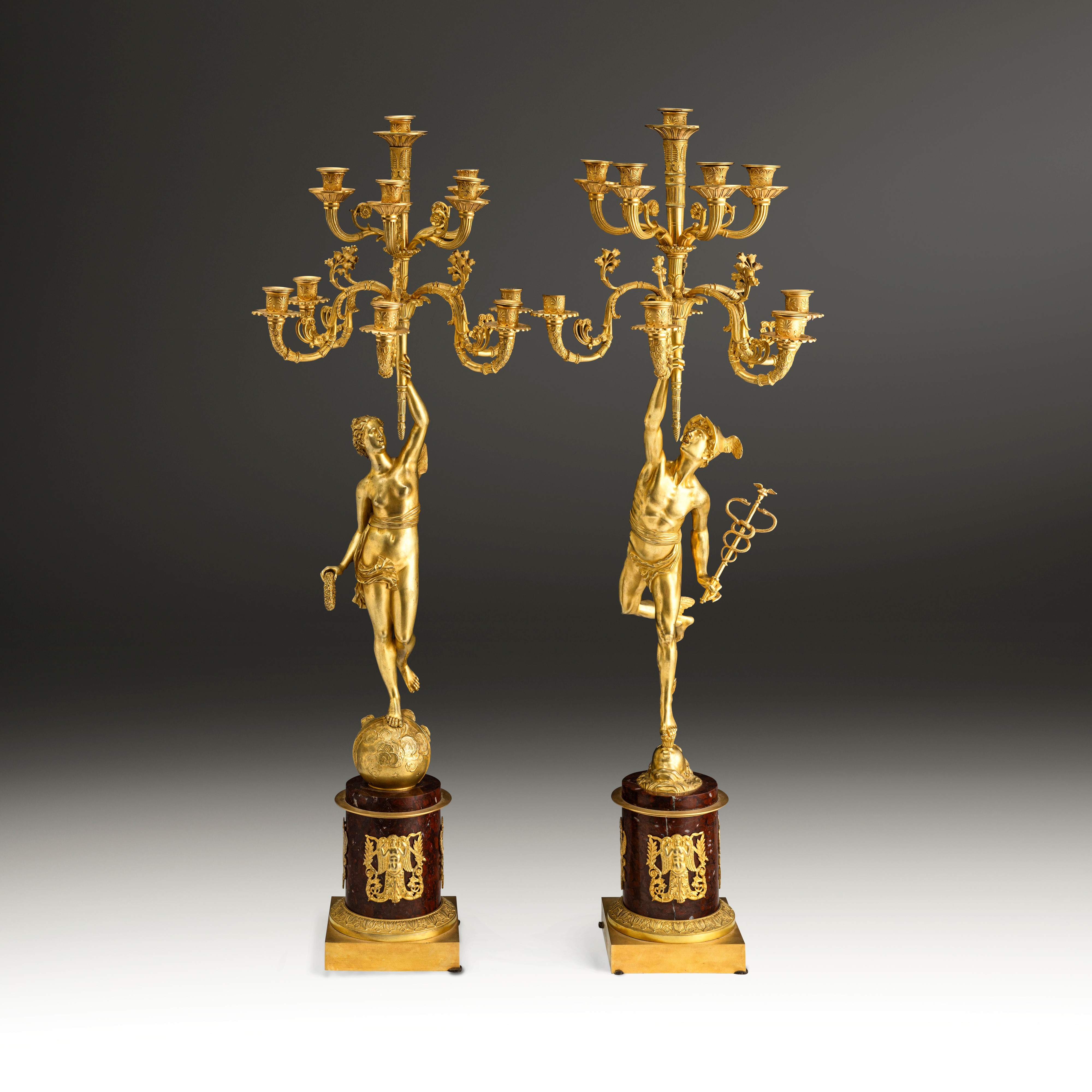 Le due figure di Psiche e Mercurio, rispettivamente poggianti su sfera celeste e volto di Eolo, ispirato al modello di Giambologna, reggono un’alta torcia da cui si dipartono dieci bracci mossi, cesellati con motivi di palmette, riccioli e fiori. Basi cilindriche in marmo decorato con applicazioni in bronzo dorato raffiguranti allegorie e torcia alata.