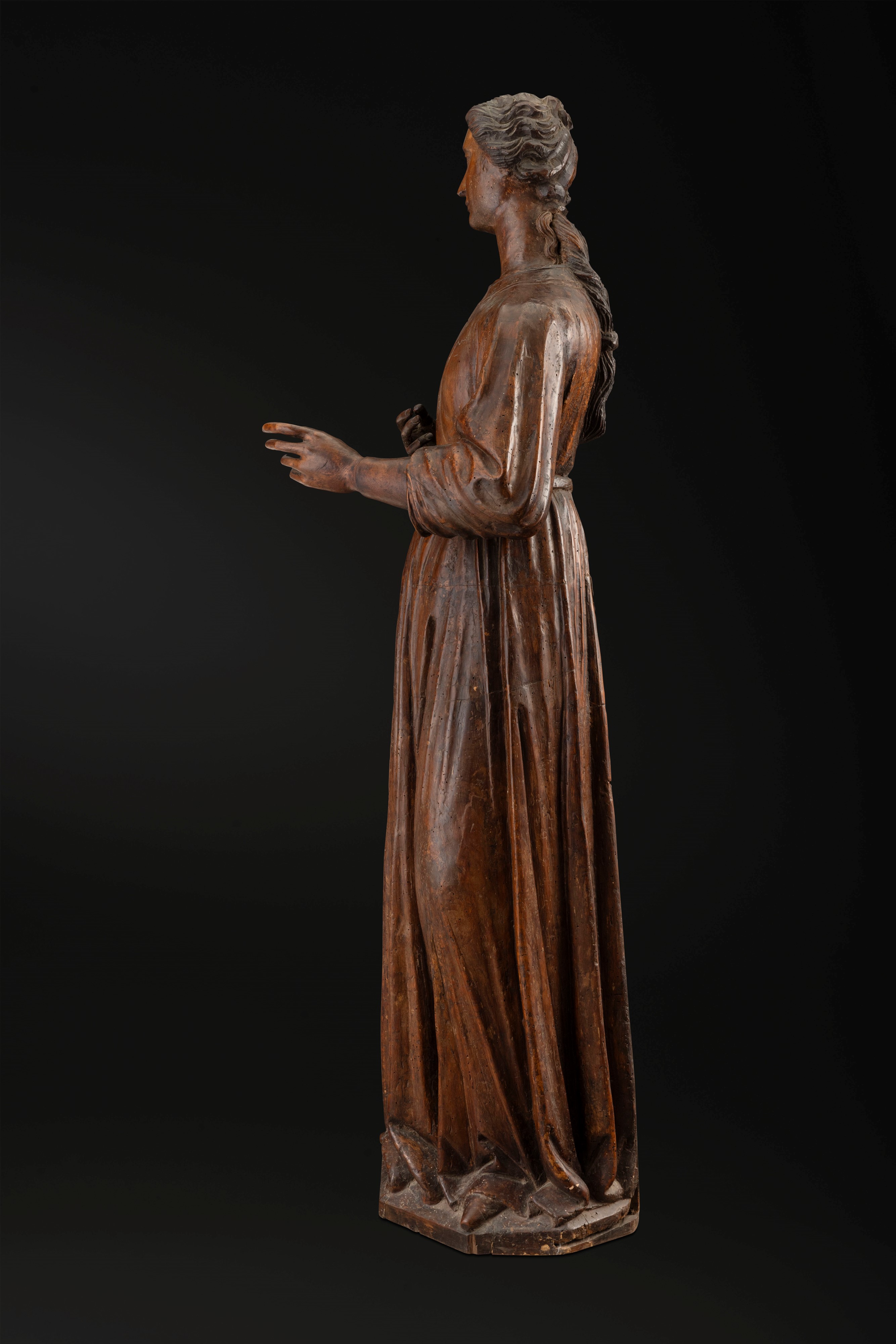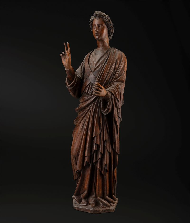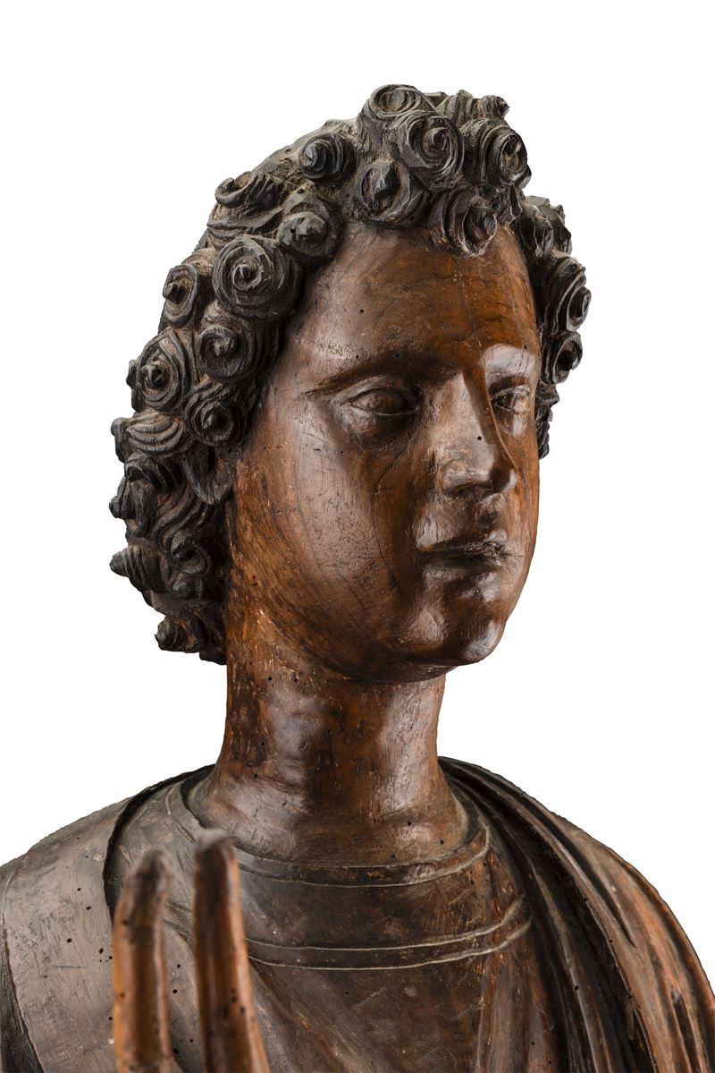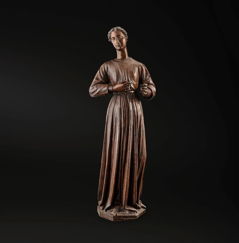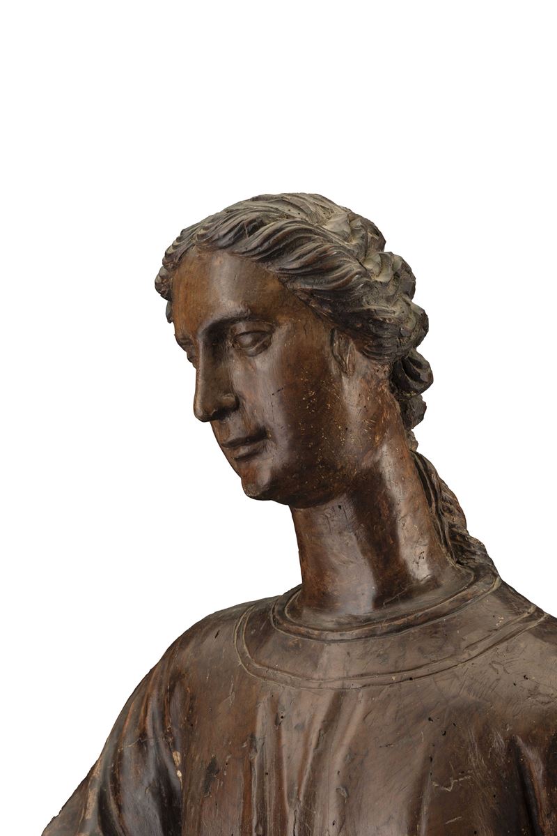 L'importante gruppo scultoreo, rara testimonianza di Annunciazione lignea senese tra Gotico e Rinascimento, ancora conservato in collezione privata, è documentato dall'immediato dopoguerra nelle collezioni della celebre dinastia di antiquari fiorentini Volterra che lo presentarono alla Prima Mostra Nazionale Antiquaria di Palazzo Strozzi in Firenze tra il Luglio e l'Agosto del 1953. Inizialmente attribuito a Francesco di Valdambrini (Siena 1375-1435) viene in seguito riconosciuto da Carlo del Bravo come opera di Domenico di Niccolò, eseguita tra il terzo e il quarto decennio del '400. La Vergine Annunciata dal volto incorniciato da capelli raccolti in una lunga coda che scende dietro la schiena, vestita da una semplice tunica allacciata in vita da cui si dipartono dritte e profonde pieghe fino ai piedi, sembra muoversi con un lieve inarcamento del corpo quasi in una sorta di dialogo verso l'angelo che, stante, vestito da un manto poggiante sulla spalla che scende a larghe pieghe, la benedice con la mano destra fissandola con lo sguardo. Le due figure, ispirate da uno ieratico e fermo senso di sospensione temporale, racchiudono in loro i dettami della scultura tardo gotica senese, cristallizzata in un elegante e trasfigurato astrattismo di profana classicità.