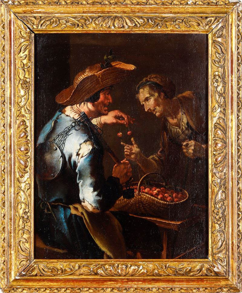 Questa brillante composizione raffigura un vivace scambio tra due figure popolari, un venditore ambulante e un cliente, intenti nella contrattazione di un grappolo di ciliegie. L’opera esemplifica il gusto tipico di Giacomo Francesco Cipper, noto come il Todeschini, per le scene di genere animate da figure grottesche e gesti teatrali.