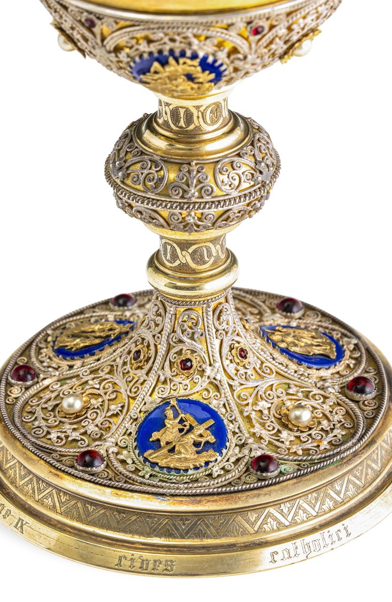 Questa importante opera di oreficeria, probabilmente un dono inviato al pontefice Pio IX a un anno dalla sua morte dai fedeli cattolici della città bavarese di Wurzburg allora sede vescovile vacante, magistralmente eseguito in stile neo rinascimentale don finissime applicazioni traforate a racemi e volute che racchiudono entro riserve circolari scene della Passione di Cristo su sfondo in smalto blu e vedono incastonate sul piede e nel sottocoppa molteplici perle naturali e granati cabochon, reca incisa sulla base un'iscrizione in lettere gotiche e la data 1877. La pregevole opera aveva probabilmente la funzione di "prezioso" memorandum per il Santo Padre di testimonianza della fedeltà offerta dalla comunità cristiana della città bavarese dopo la fine del potere temporale della Chiesa avvenuta con la presa di Roma da parte dei bersaglieri e dei fanti dell'esercito regio d'Italia il 20 Settembre del 1870 che segnò la fine dello Stato Pontificio ed il conseguente ritiro del pontefice, definitosi prigioniero politico, all'interno delle mura vaticane ma forse svolgeva anche il compito di velato invito nel provvedere alla nomina di una nuova figura episcopale per la sede vescovile vacante già ormai da due anni, forse considerati troppi per la città che era stata nel passato sede dei Vescovi Principi.