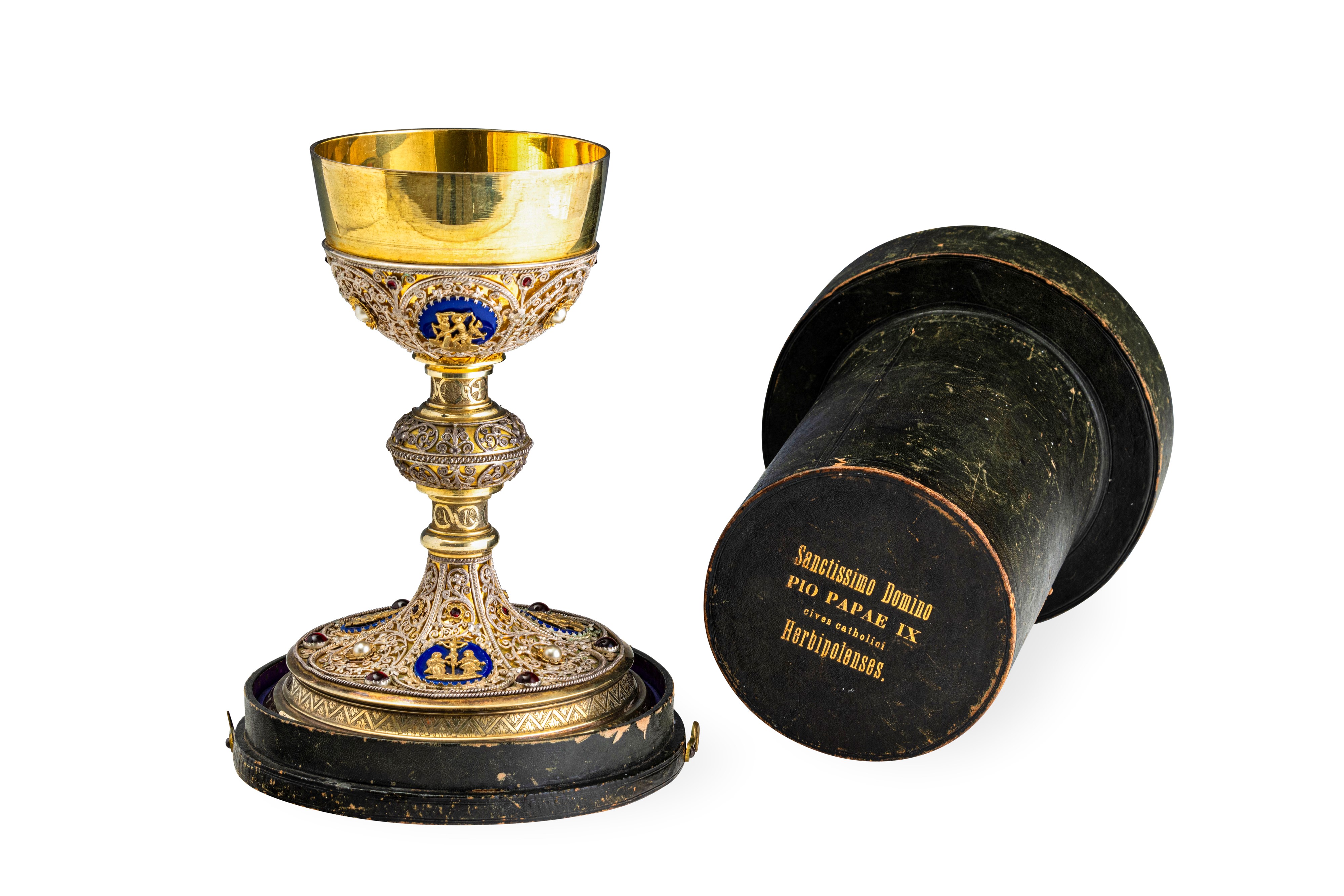 Custodia originale con dedica latina impressa in oro "Sanctissimo Domino Pio Papae IX cives catholici Herbipolenses" Calice eucaristico