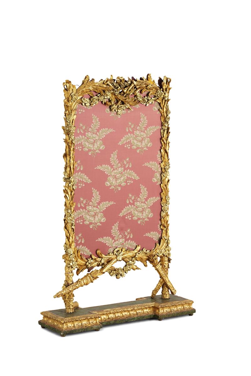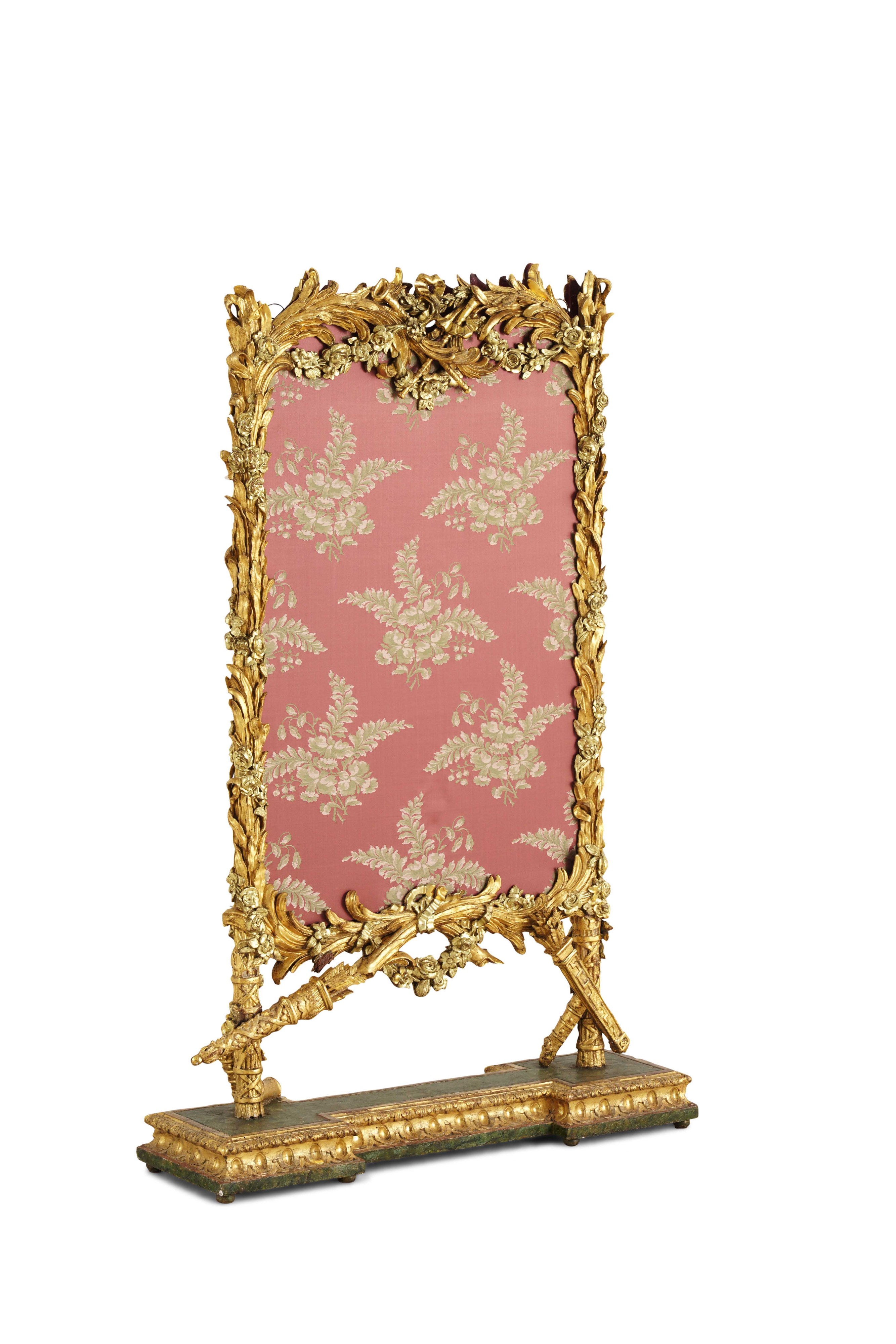 Legno intagliato e dorato a racemi di foglie e fiori che culminano in alto con panoplia musicale e nastro. Sostegni arricchiti da faretre scolpite a tutto tondo, base sagomata e modanata laccata a finto marmo. Pannello estraibile rivestito in seta.
