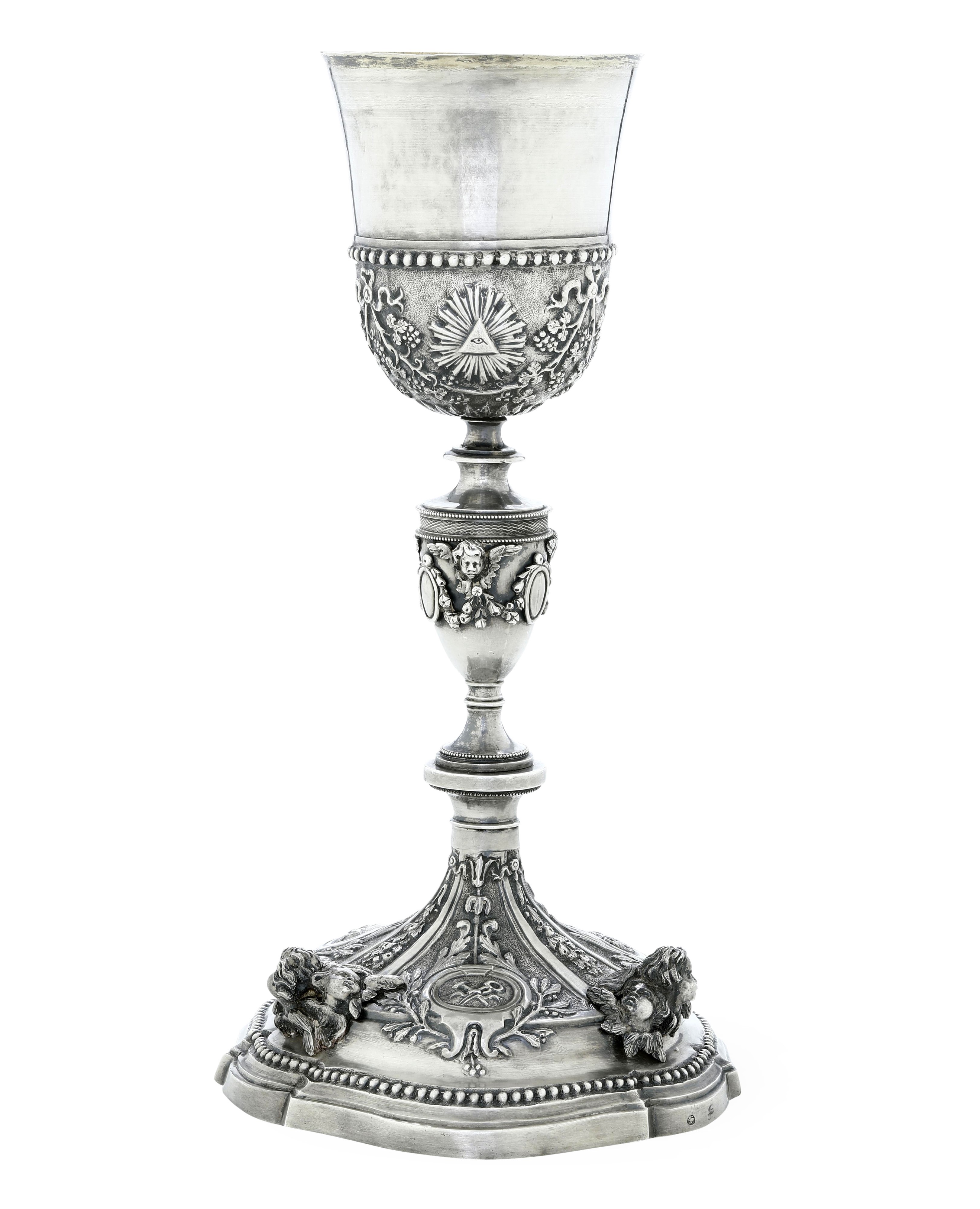 Roma, XIX secolo. Marchio camerale della città di Roma in uso dal 1815 al 1872 e marchio dell'argentiere entro losanga consunto di difficile lettura Calice eucaristico