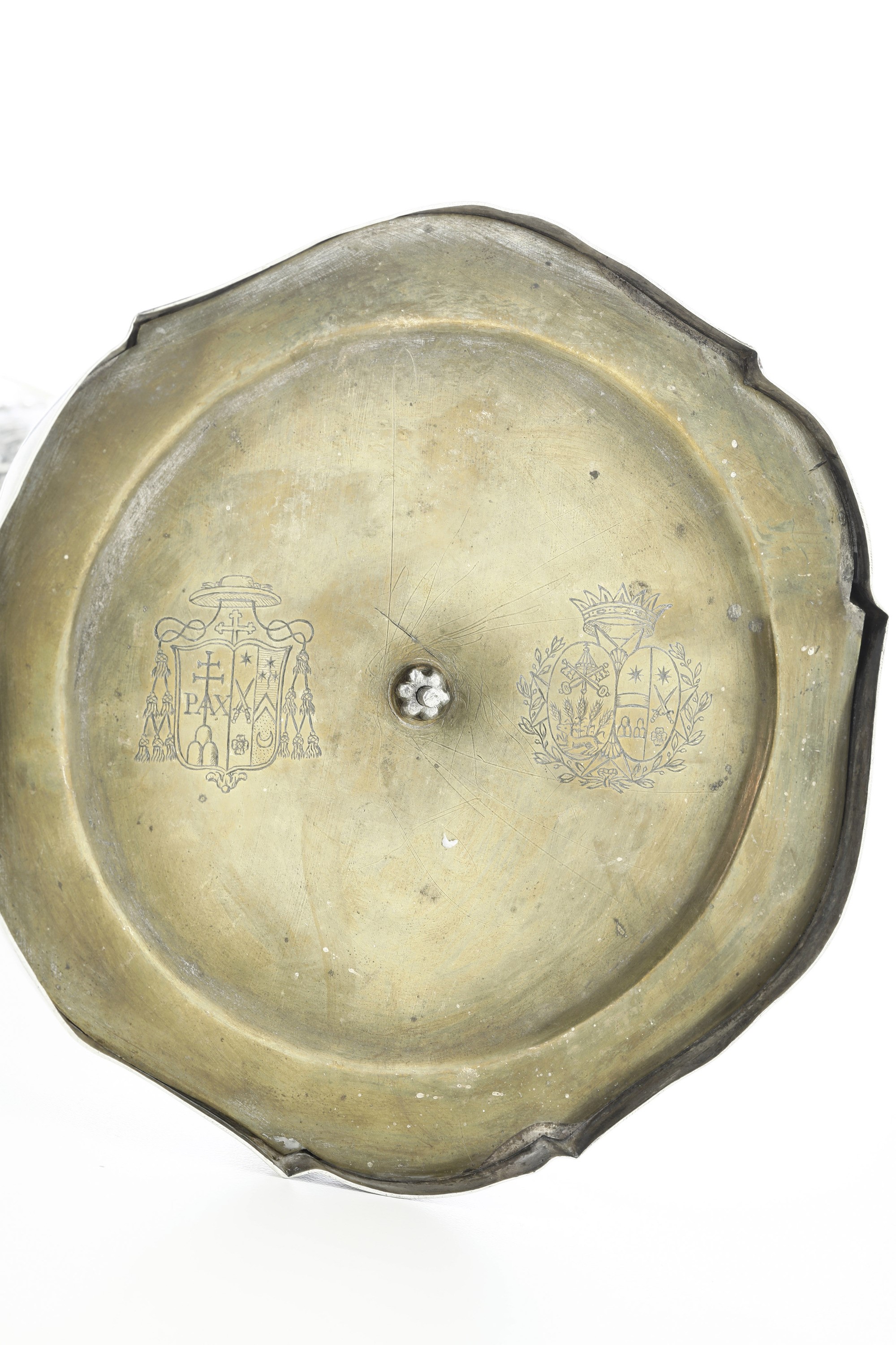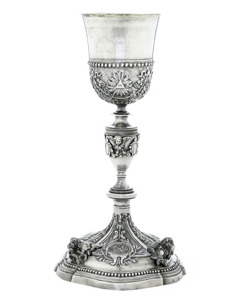 Elegante calice di gusto neoclassico con sottocoppa ornato a festoni susseguenti e tralci di vite, alto fusto a vaso. Piede sagomato e gradinato con decoro a perlinatura e simboli della passione entro riserve ovali fogliate scandite da teste di cherubini. Sotto il piede finemente cesellate due insegne vescovili.