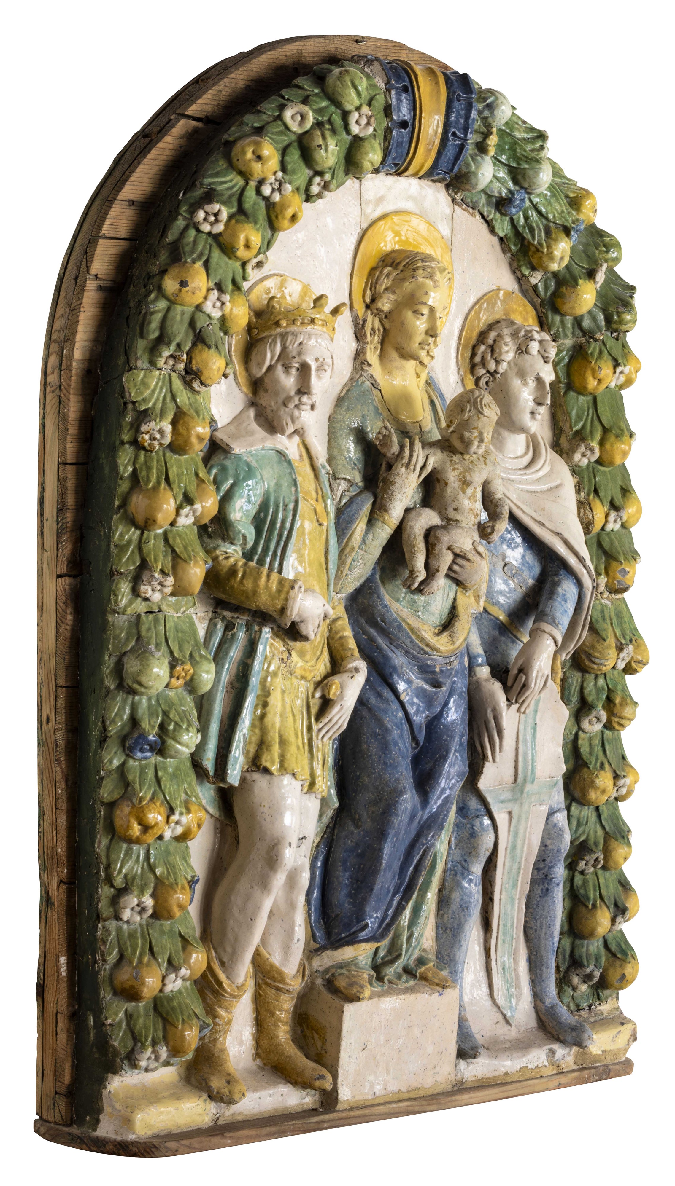 L'importante rilievo raffigurante la Madonna che regge il Bambino tra i Santi Luigi dei Francesi e Giorgio, incorniciato entro un festone centinato di foglie e frutti, ben rappresenta le alte capacità artistiche di scultori e plasticatori che rivaleggiarono nella Firenze del XVI secolo con i Della Robbia. La finezza del modellato, l'espressività dei volti che sembrano dialogare con i fedeli, il tutto avvolto dalla tenue armonia dei cromatismi giocata sui toni degli azzurri, dei gialli e del bianco pervadono la scena di una ponderata e compiuta eleganza stilistica. L'opera è databile nel quarto decennio del XVI secolo come ben spiega G. Gentilini nello studio critico che la accompagna "...quale ritroviamo in molti rilievi realizzati da santi Buglioni verso la metà del Cinquecento, come la Trinità fra i santi Lorenzo e Antonio Abate in San Tommaso a Colcellalto (Sestino, Arezzo), dove inoltre i tratti fisiognomici del nostro accigliato San Giorgio trovano puntuale riscontro nel giovane martire, la spettrale Madonna del Soccorso della collezione Ciro Leone a Napoli (già nelle collezioni Widener, Breitmeyer e Grimthorpe), o la lunetta conservata a Parigi nel Musée du Louvre (dalla collezione Campana) raffigurante la Madonna col Bambino e Sant'Anna fra i santi Antonio Abate e Antonio da Padova, simile anche nella curiosa postura seduta del pingue Bambini benedicente e nella sofisticata acconciatura della Vergine di gusto raffaellesco, peraltro ricorrente nelle Madonne di Santi."
