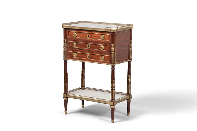 Mogano con profili, guarnizioni e applicazioni angolari in bronzo cesellato e dorato. Fronte a tre cassetti di cui, quello superiore, celante scrittoio in pelle impressa in oro e vani contenitori. Piano in marmo sagomato e incorniciato da ringhierina, gambe scanalate riunite da pianetto in marmo.