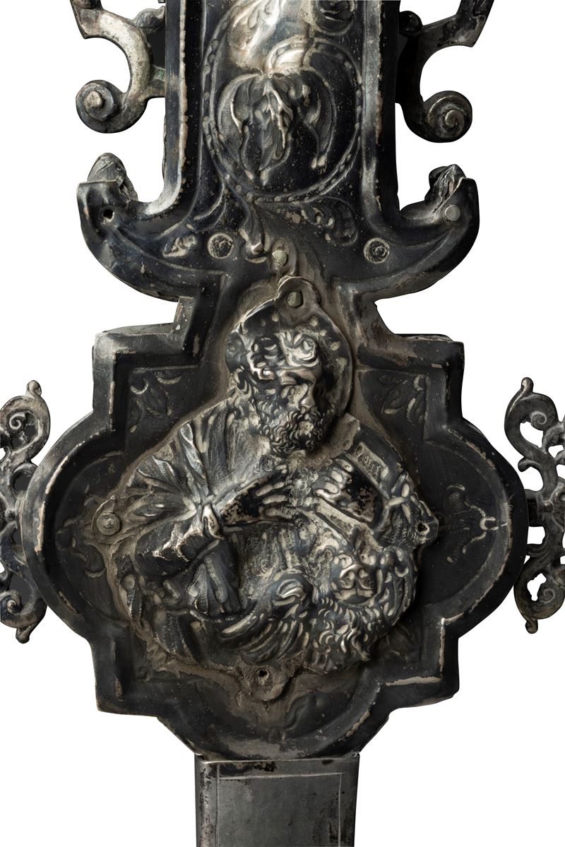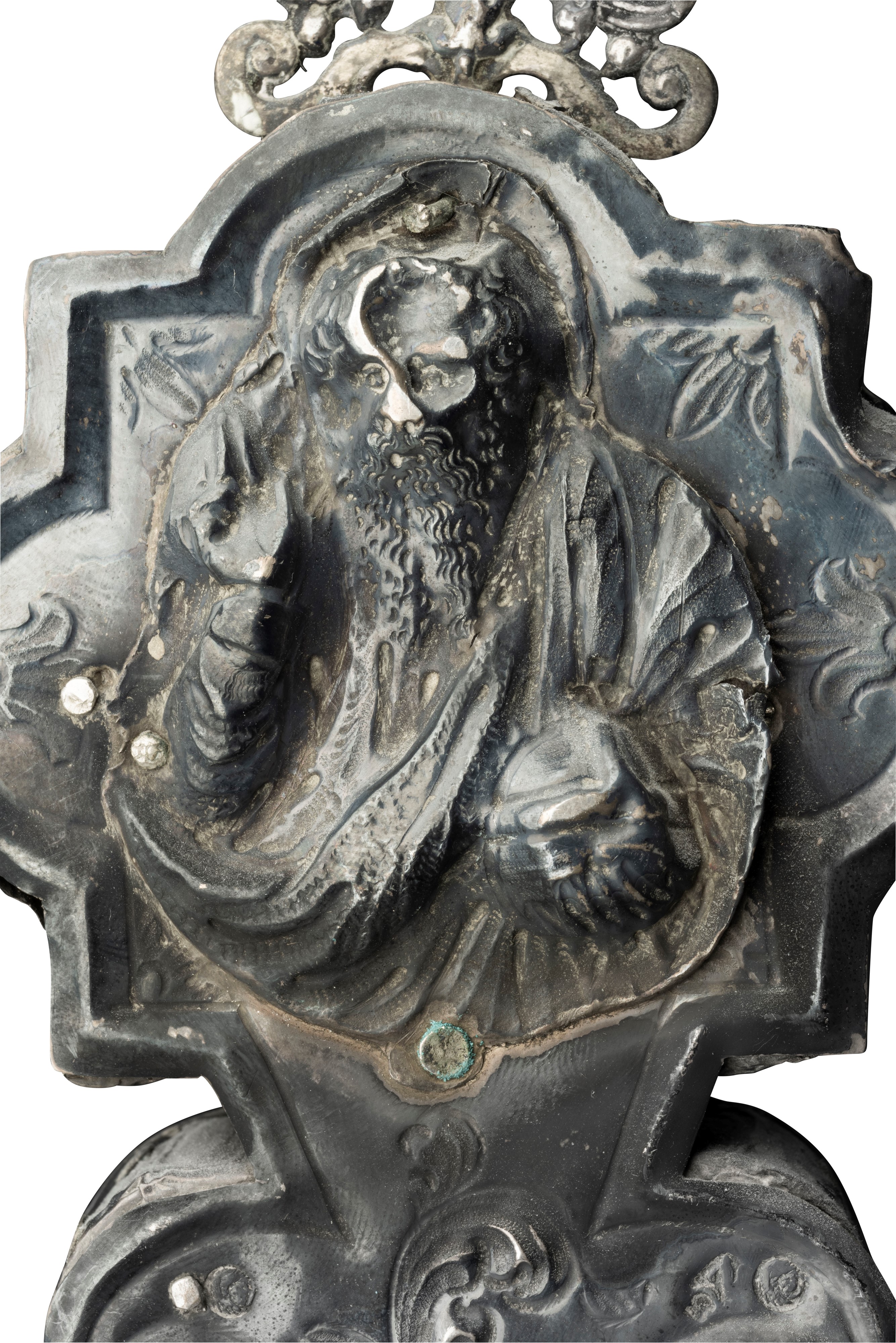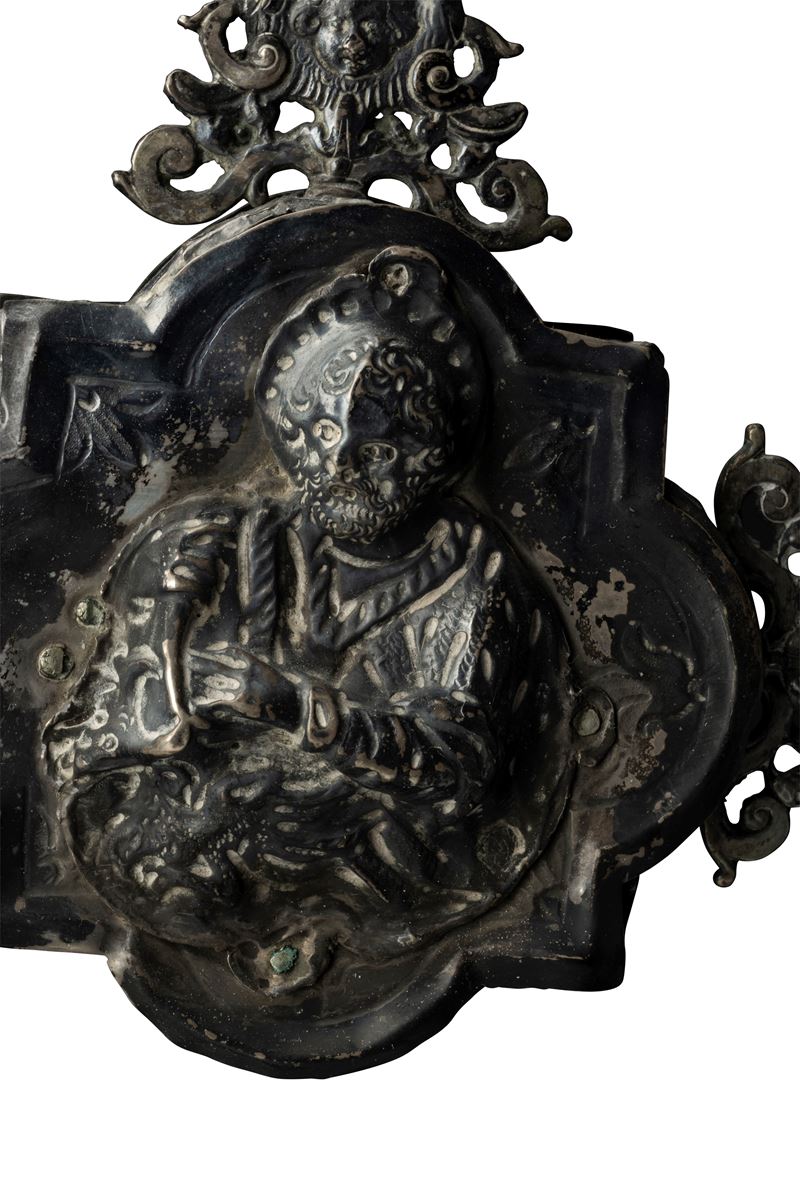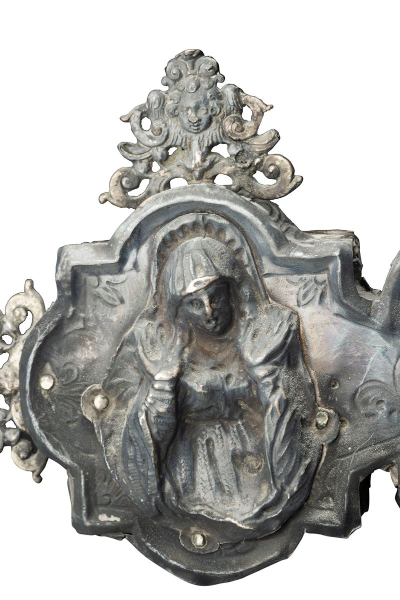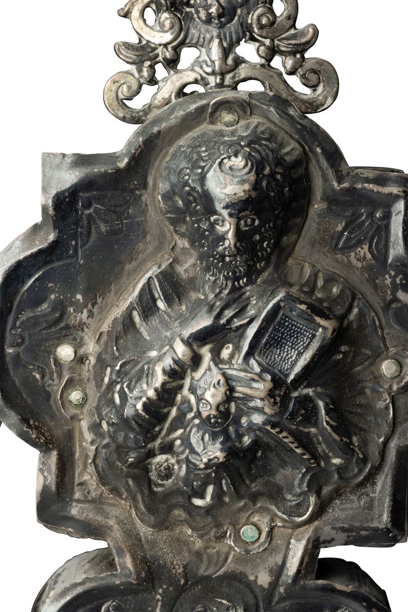 Sul verso al centro l'immagine della Vergine con il Bambino attorniati da figure di santi, il tutto poggiante su un lungo sostegno tronco conico centrato da un importante nodo sagomato.