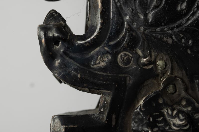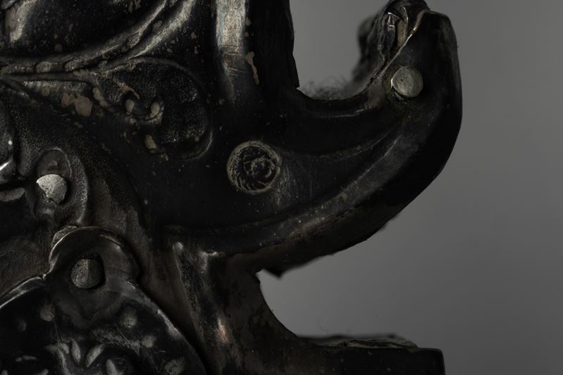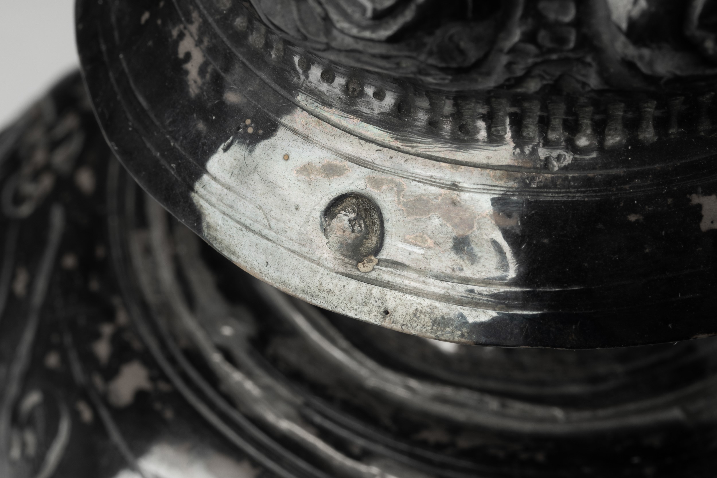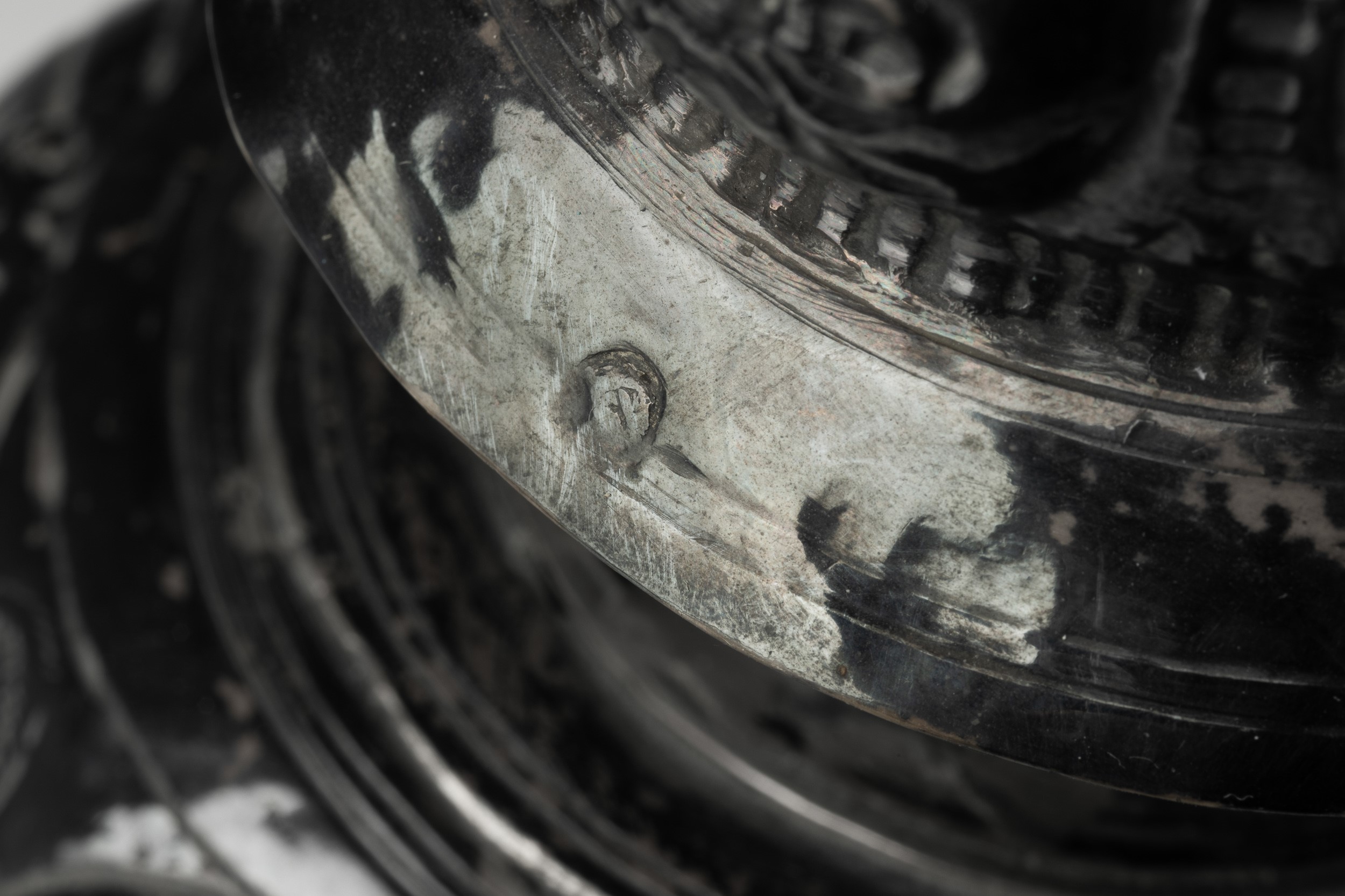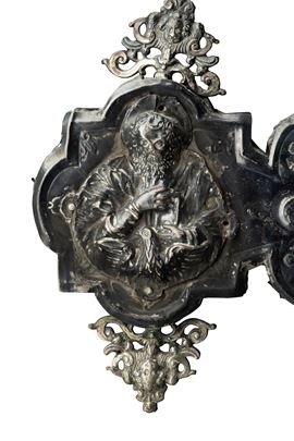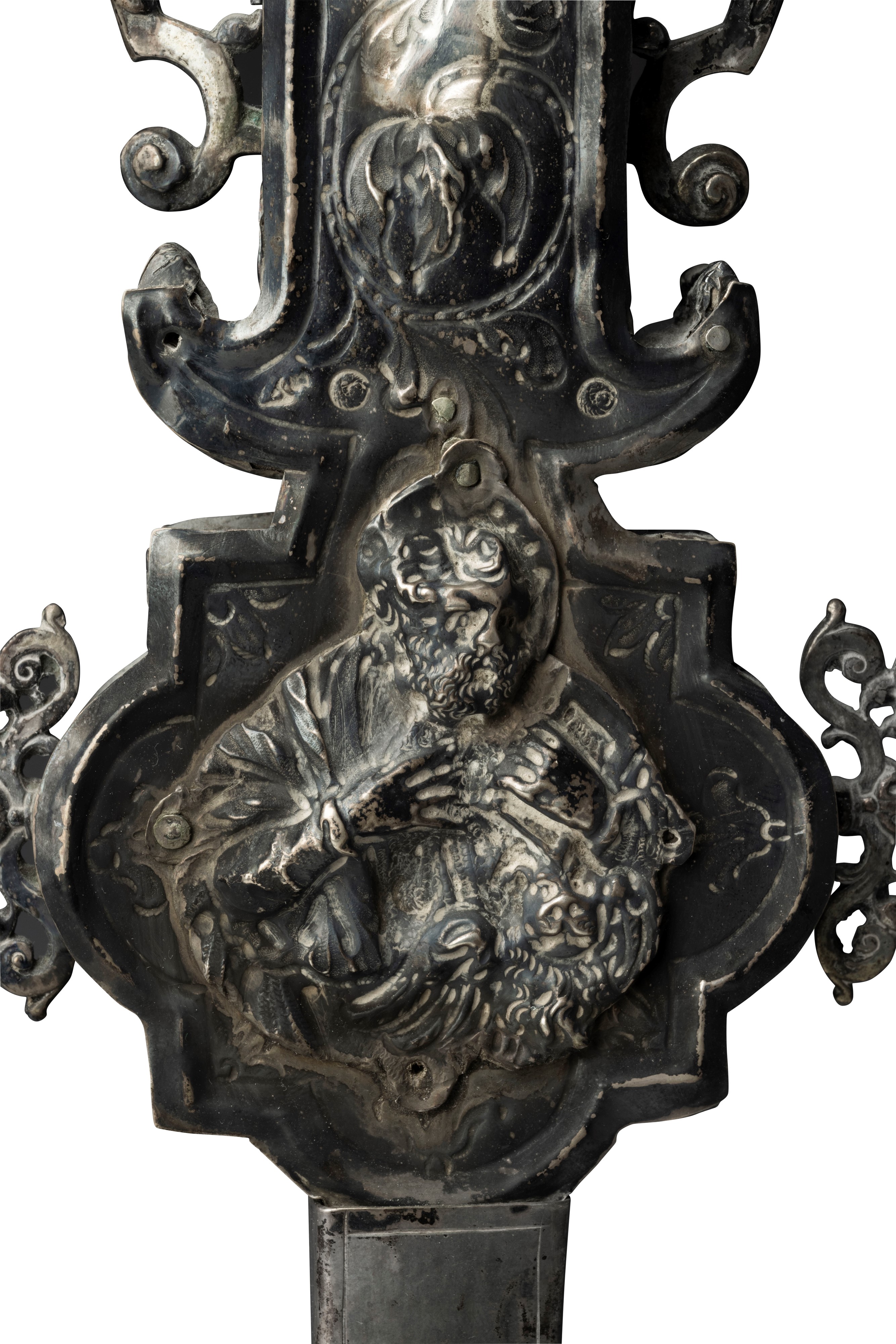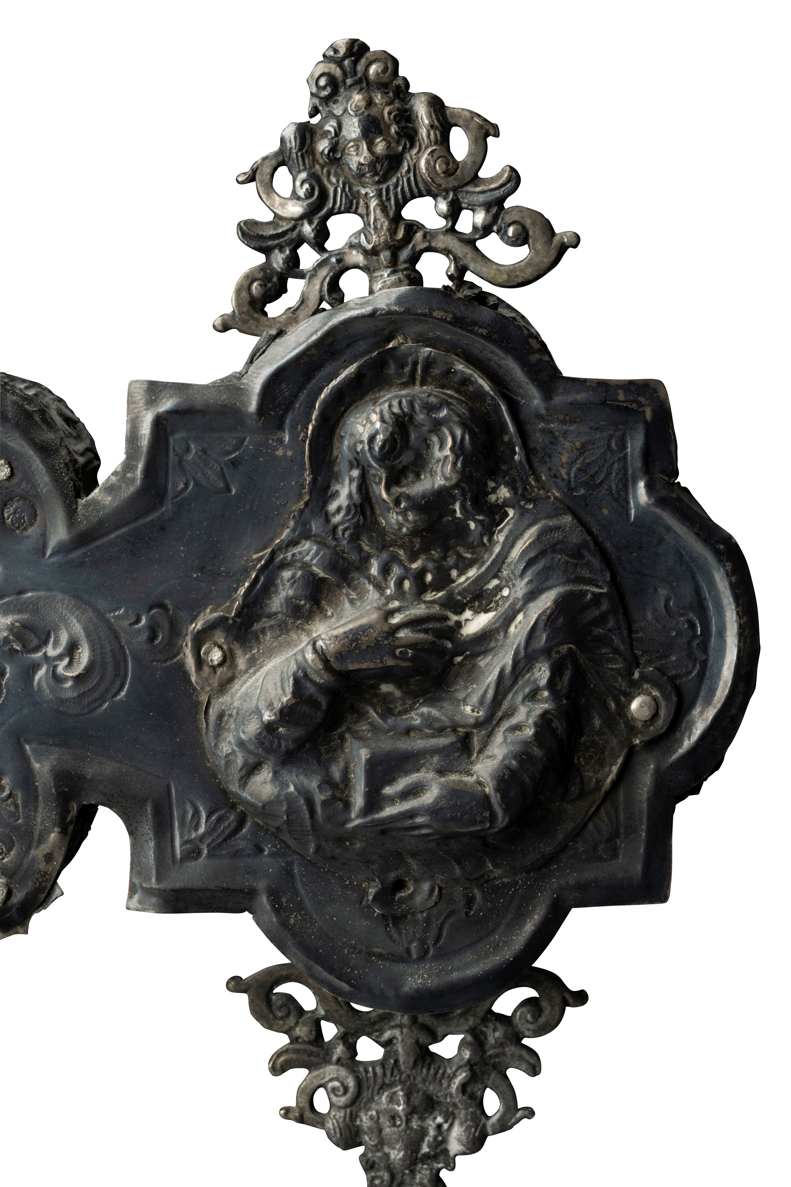 Sul verso al centro l'immagine della Vergine con il Bambino attorniati da figure di santi, il tutto poggiante su un lungo sostegno tronco conico centrato da un importante nodo sagomato.