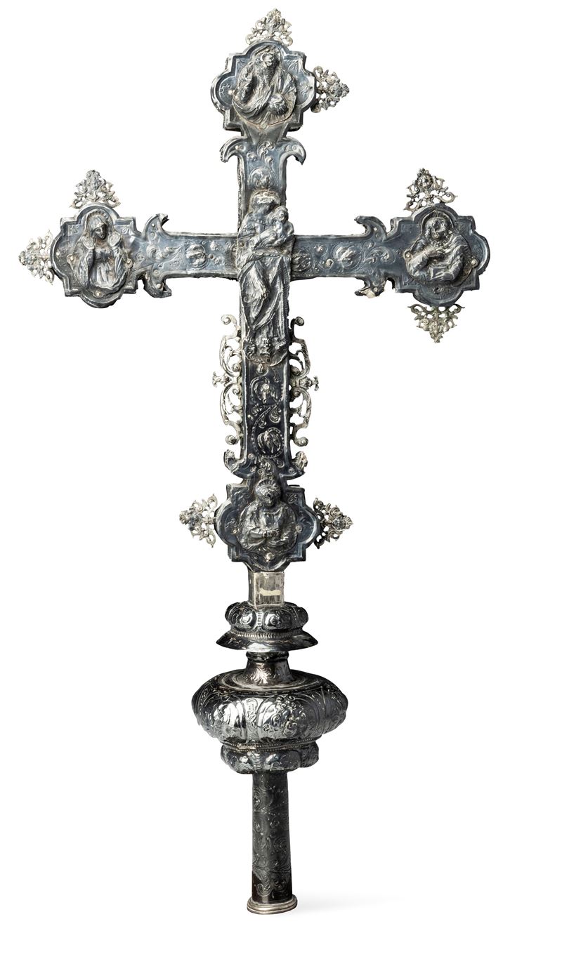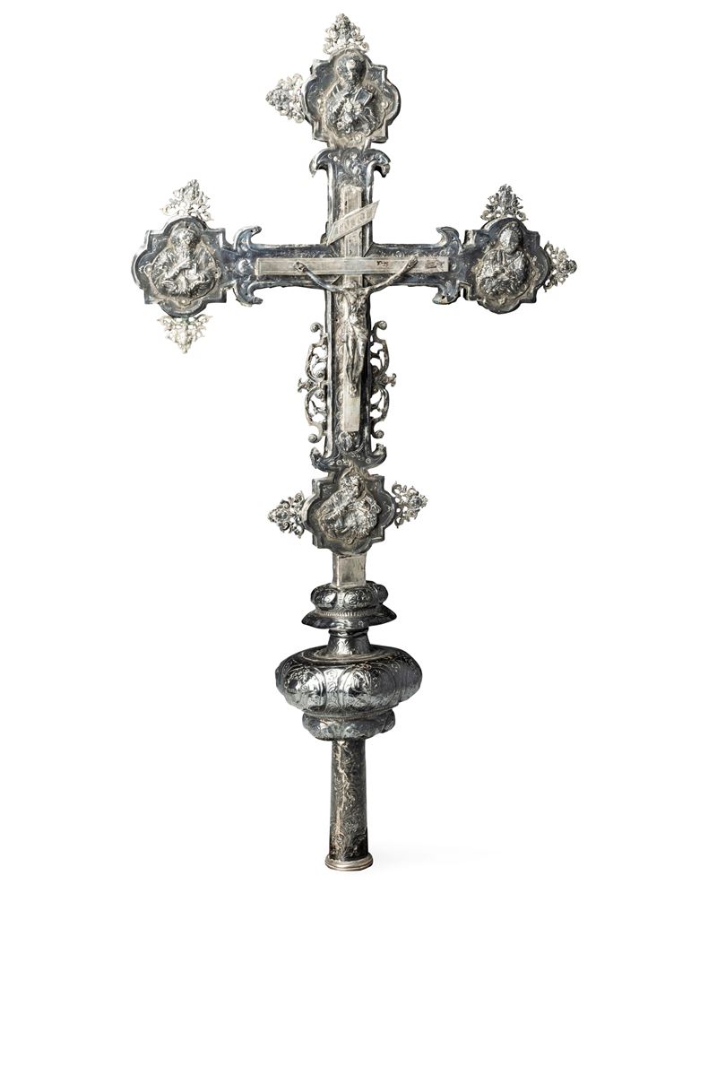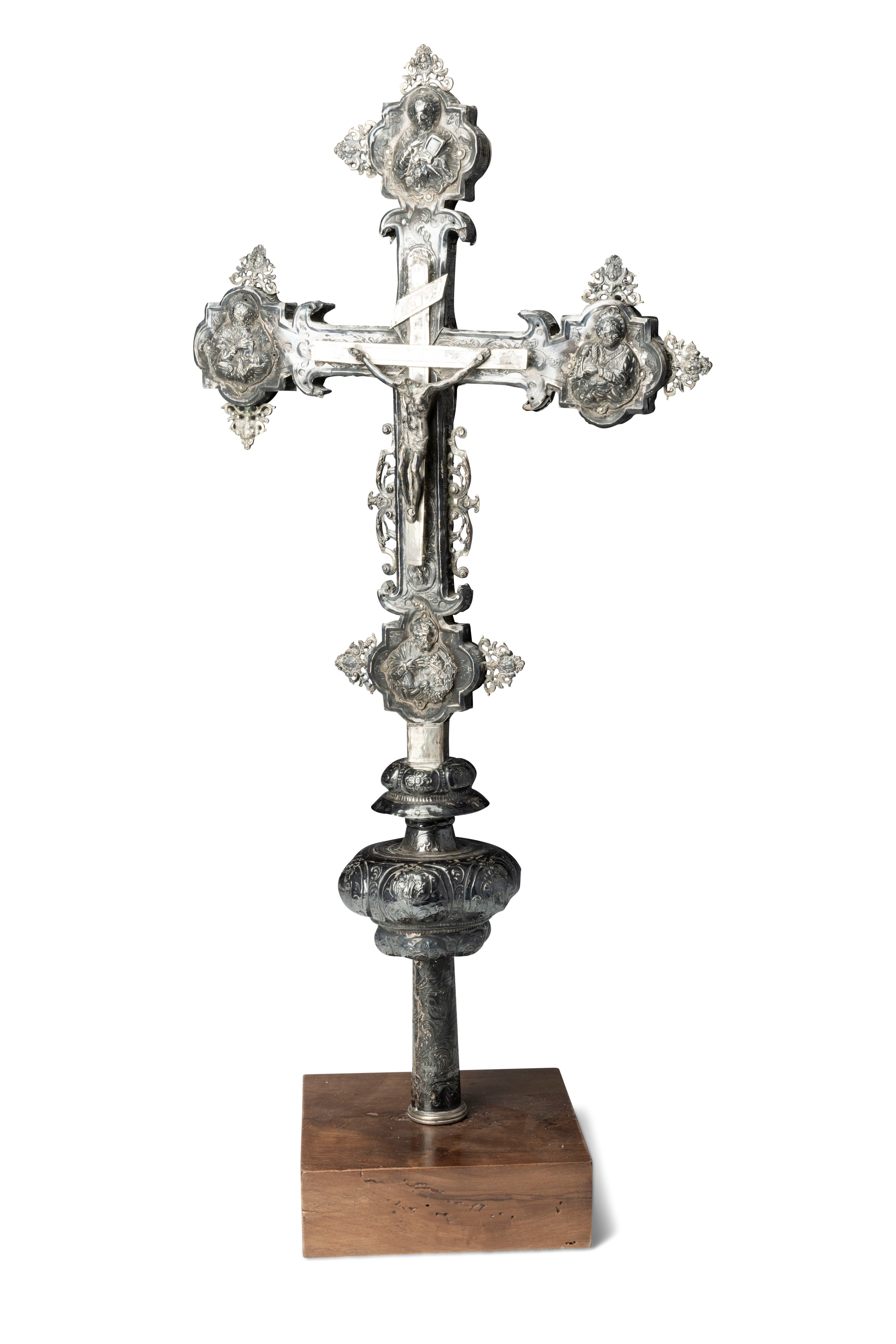 La maestosa croce lobata con, applicate sui lati, decorazioni a teste di cherubino fuse e traforate, presenta sulla parte centrale del verso la raffigurazione del Corpus Christi posta su un crocifisso in lamina liscia d'argento, antico ma probabilmente di epoca successiva, circondato nelle parti finali dei bracci da rilievi con figure di santi.