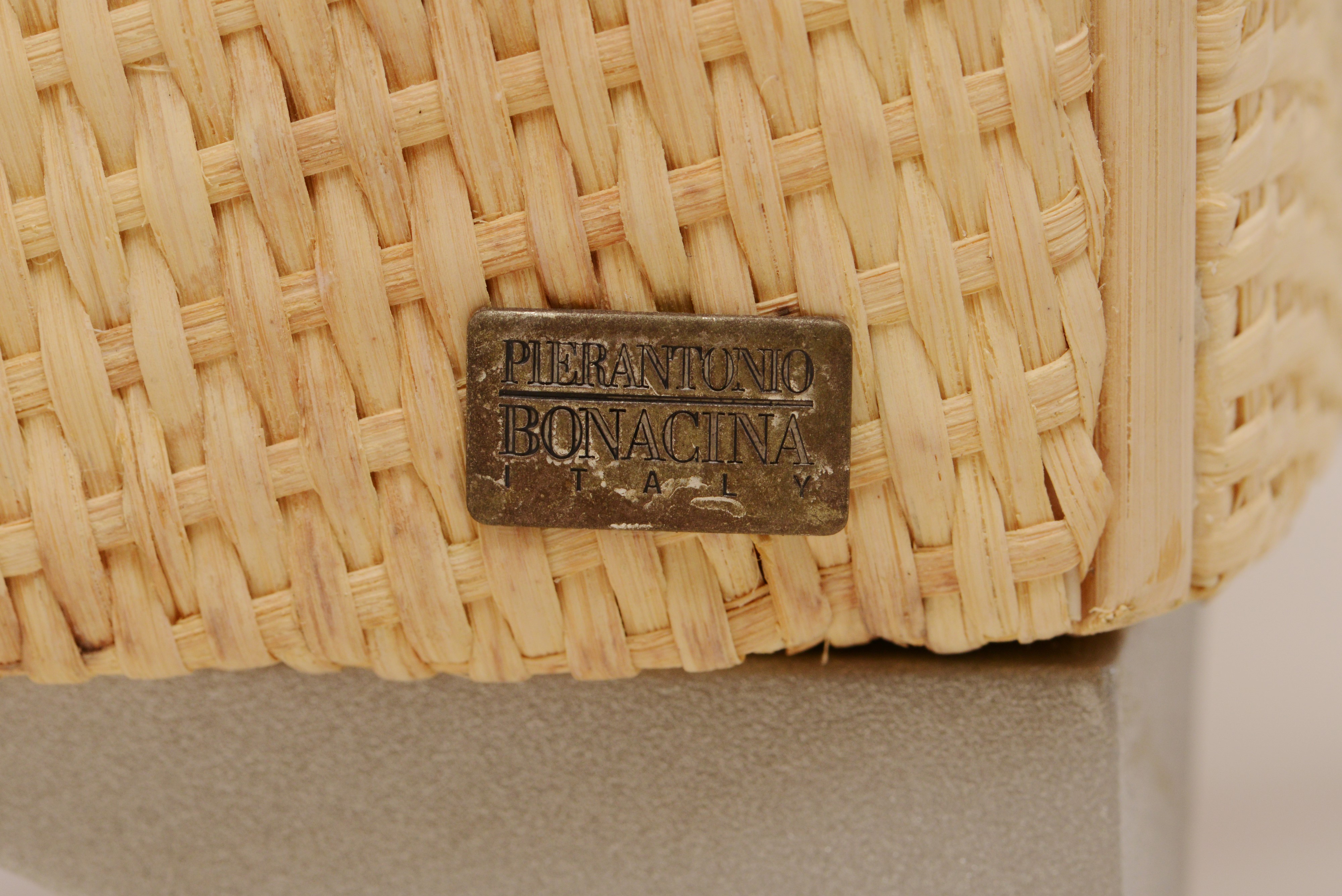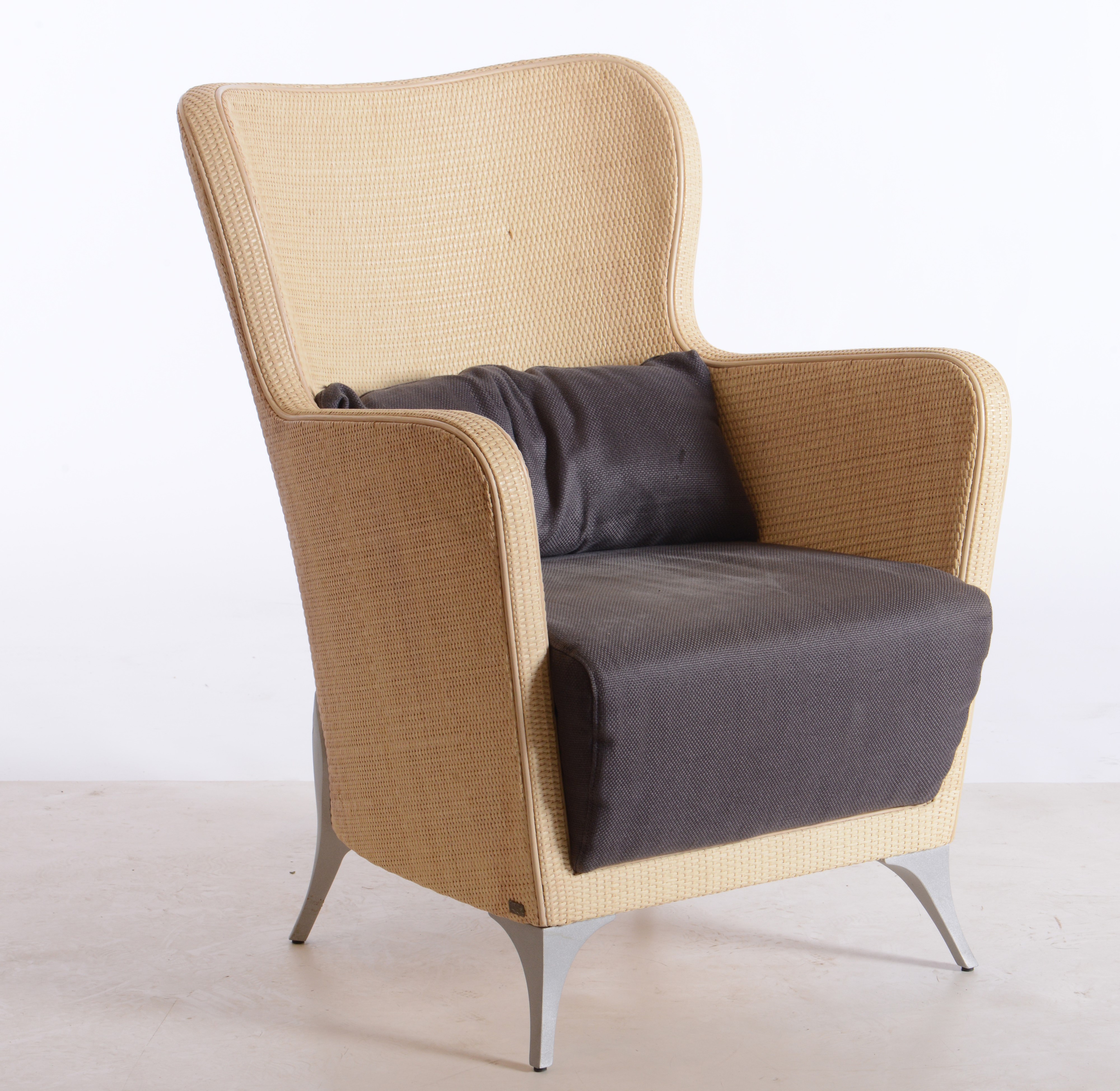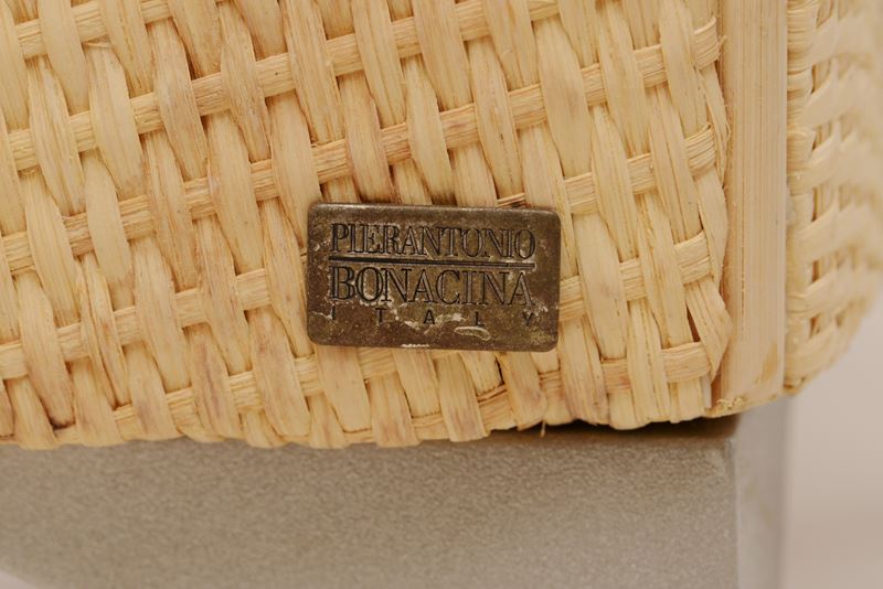 Poltrona con struttura e legno e midollino. Rivestimenti in tessuto.