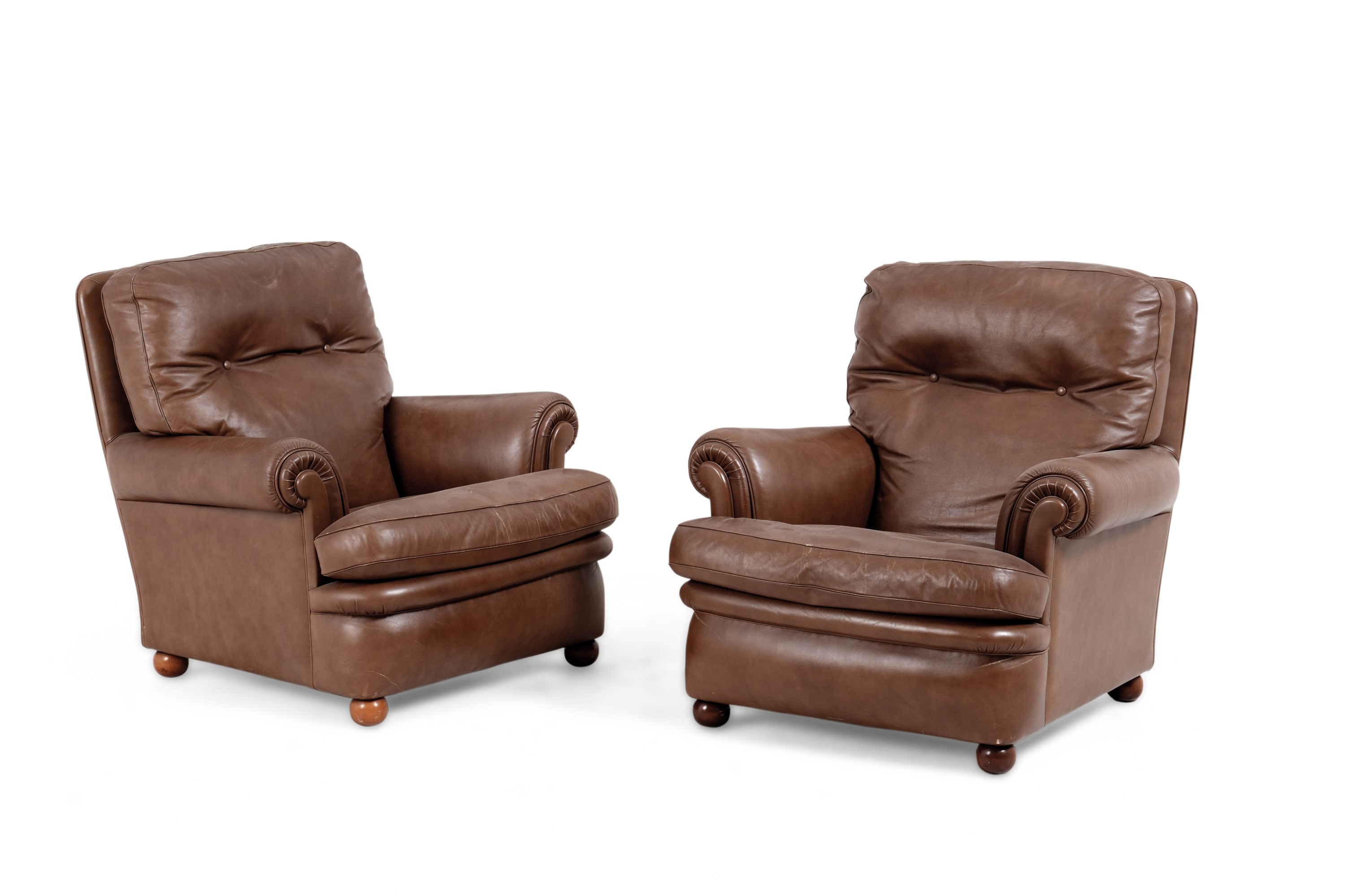 Rivestimento in pelle marrone; piedini in legno a cipolla.