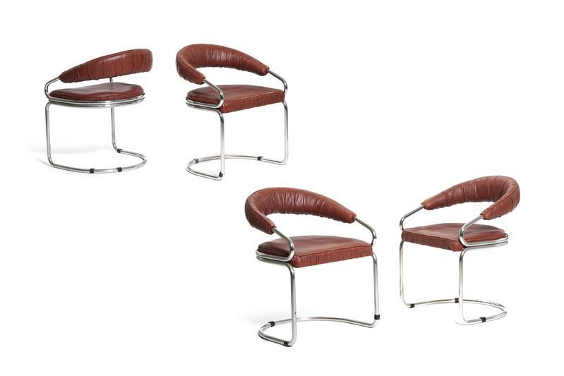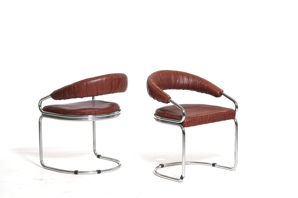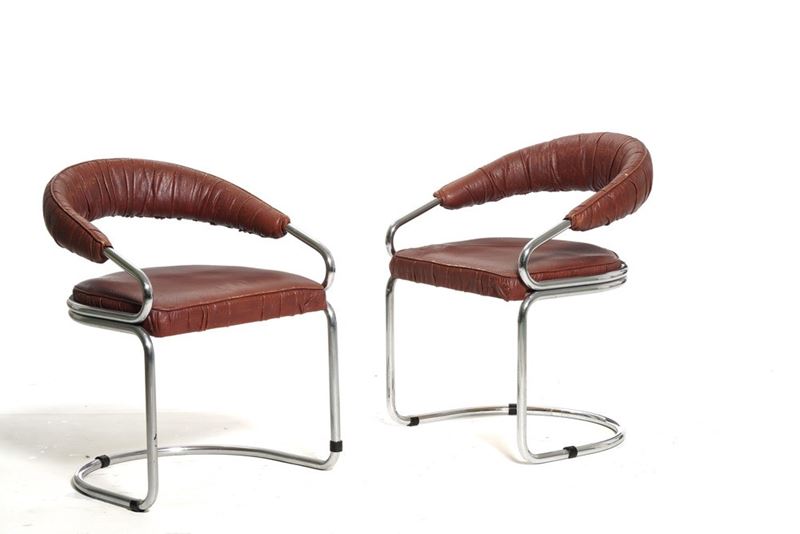 Struttura in metallo cromato, seduta e schienale imbottiti e rivestiti in pelle nei toni del marrone.