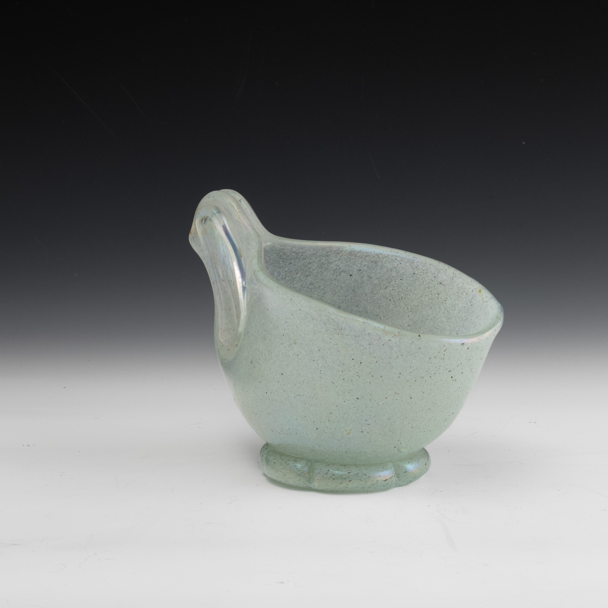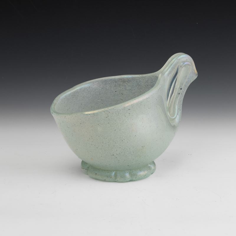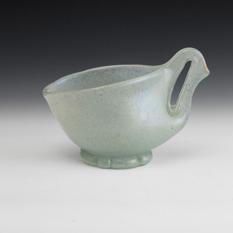 Coppa serie Eugeneo in vetro soffiato con decoro di polveri metalliche, piede applicato e ansa asimmetrica. Superficie fortemente iridata.