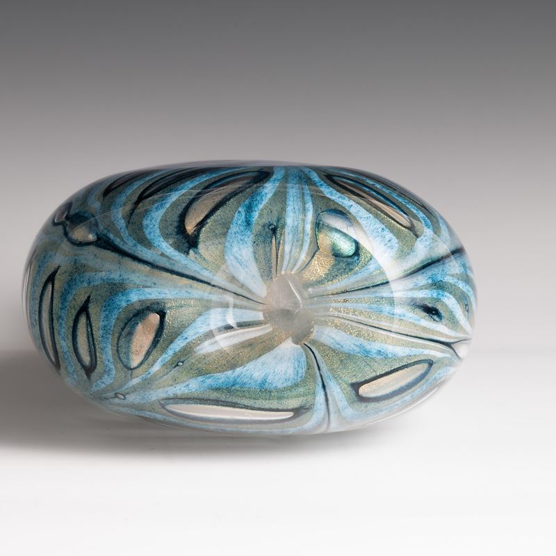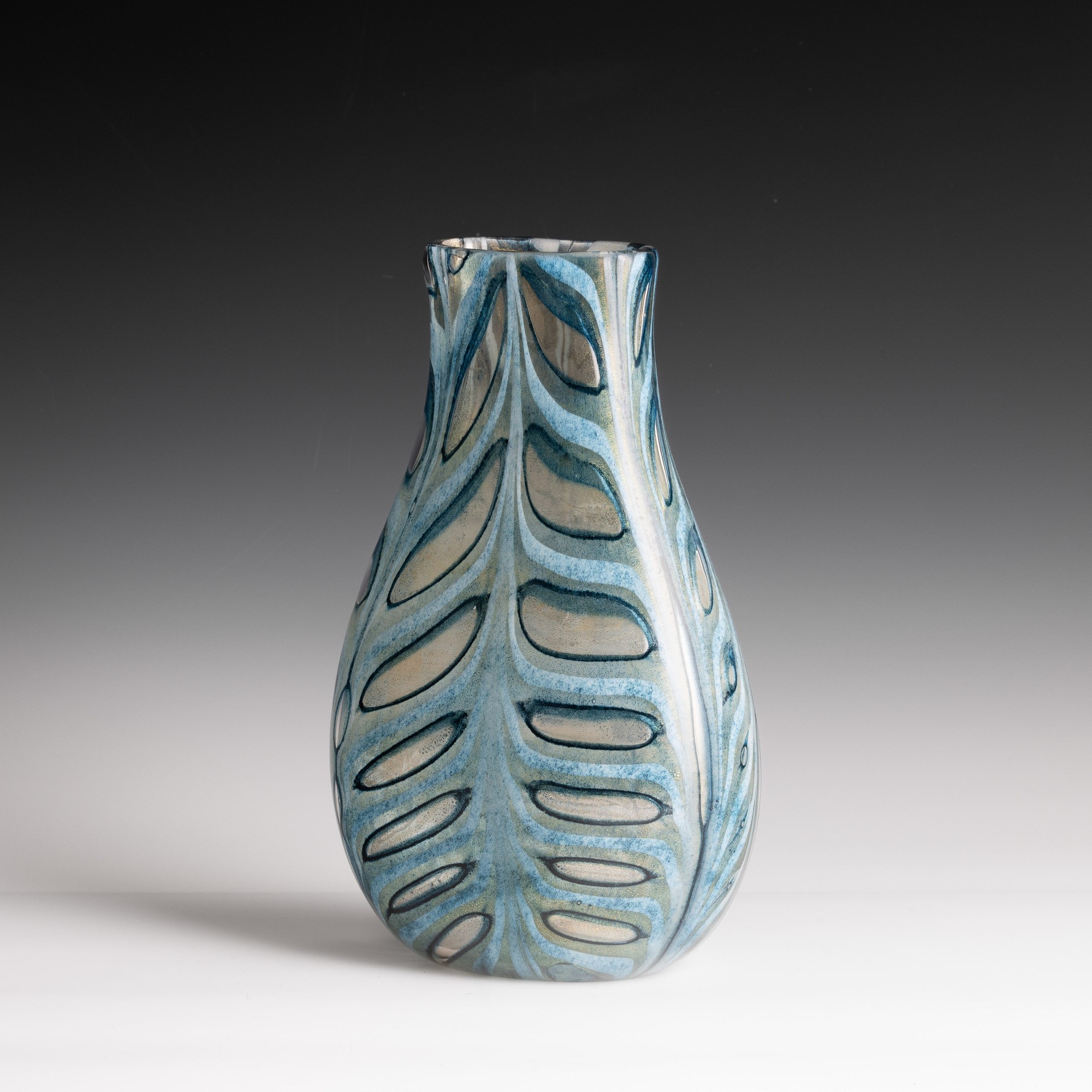 Vaso a goccia a sezione ovale serie Graffiti in vetro soffiato con decoro a festoni di polveri policrome e foglia oro.