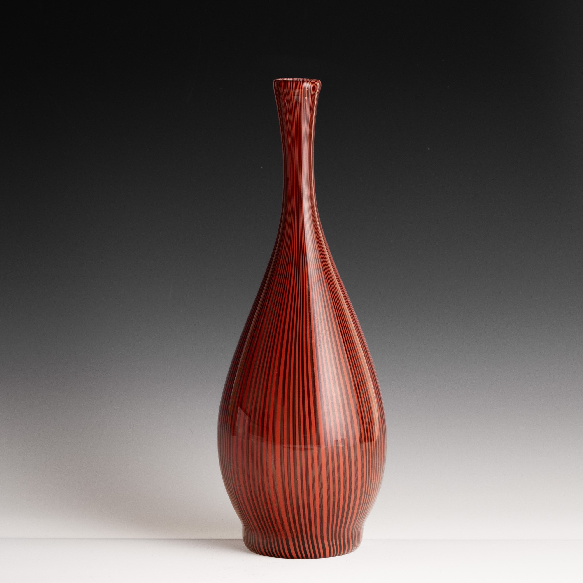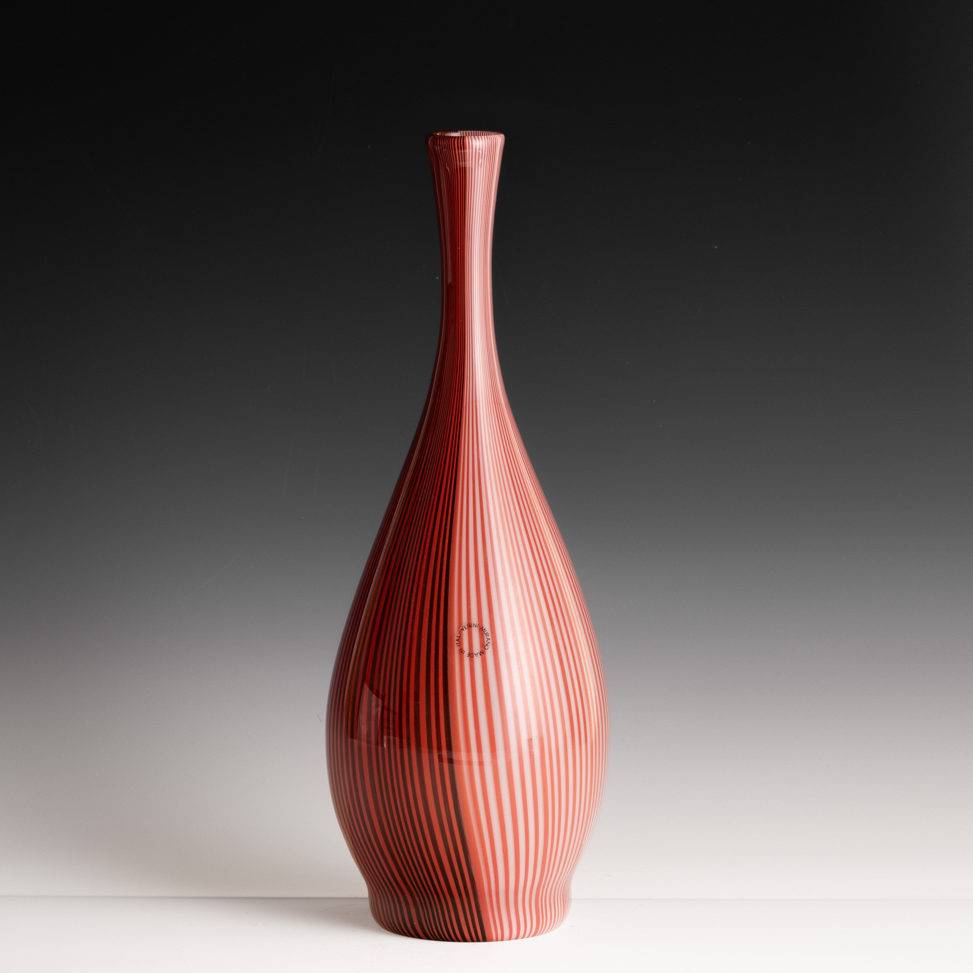 Vaso a fiasca serie Tessuti in vetro soffiato con decoro di sottili canne policrome.