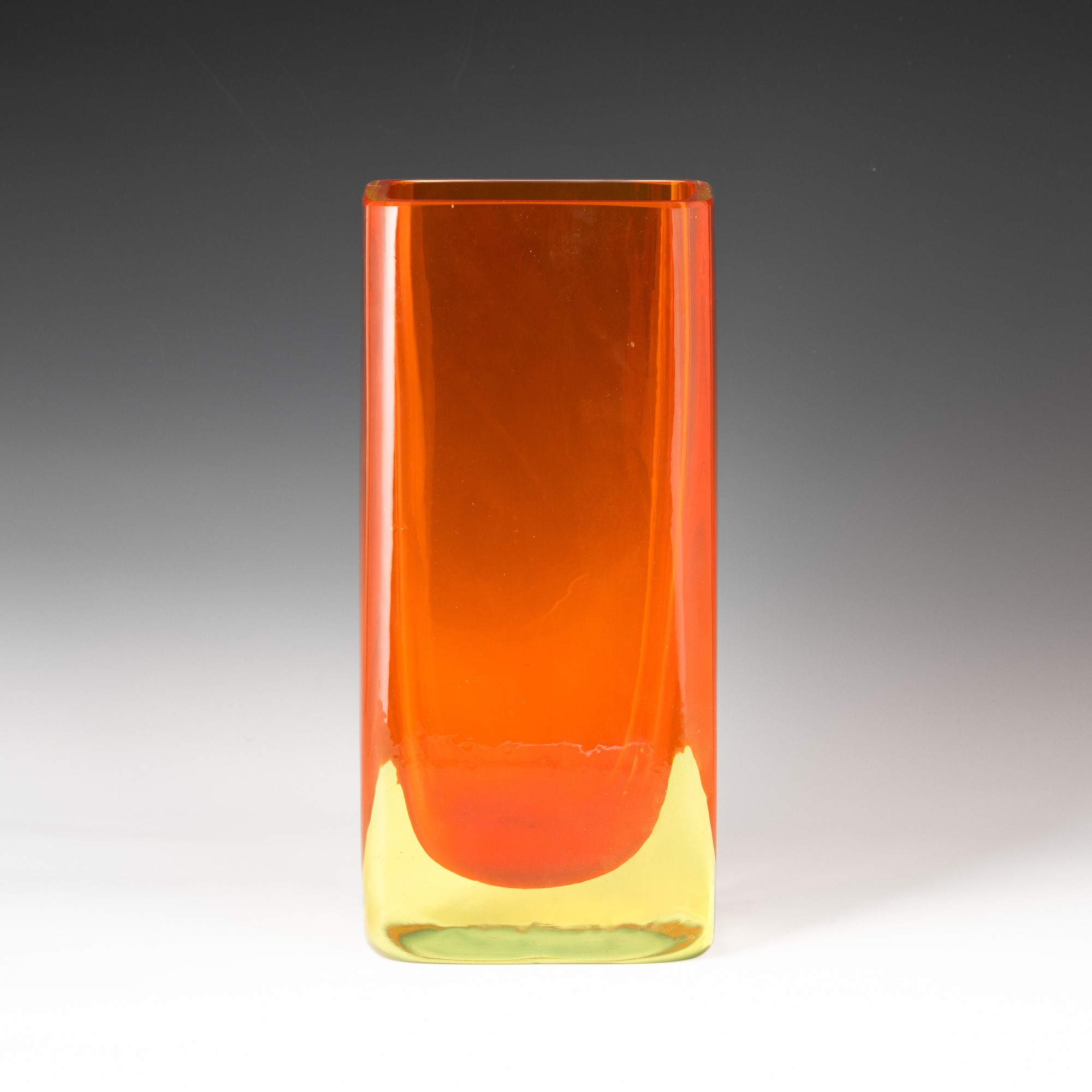 Grande vaso a sezione rettangolare in vetro sommerso a due colori.