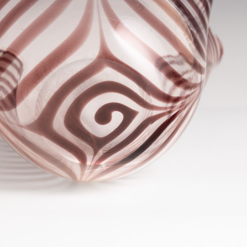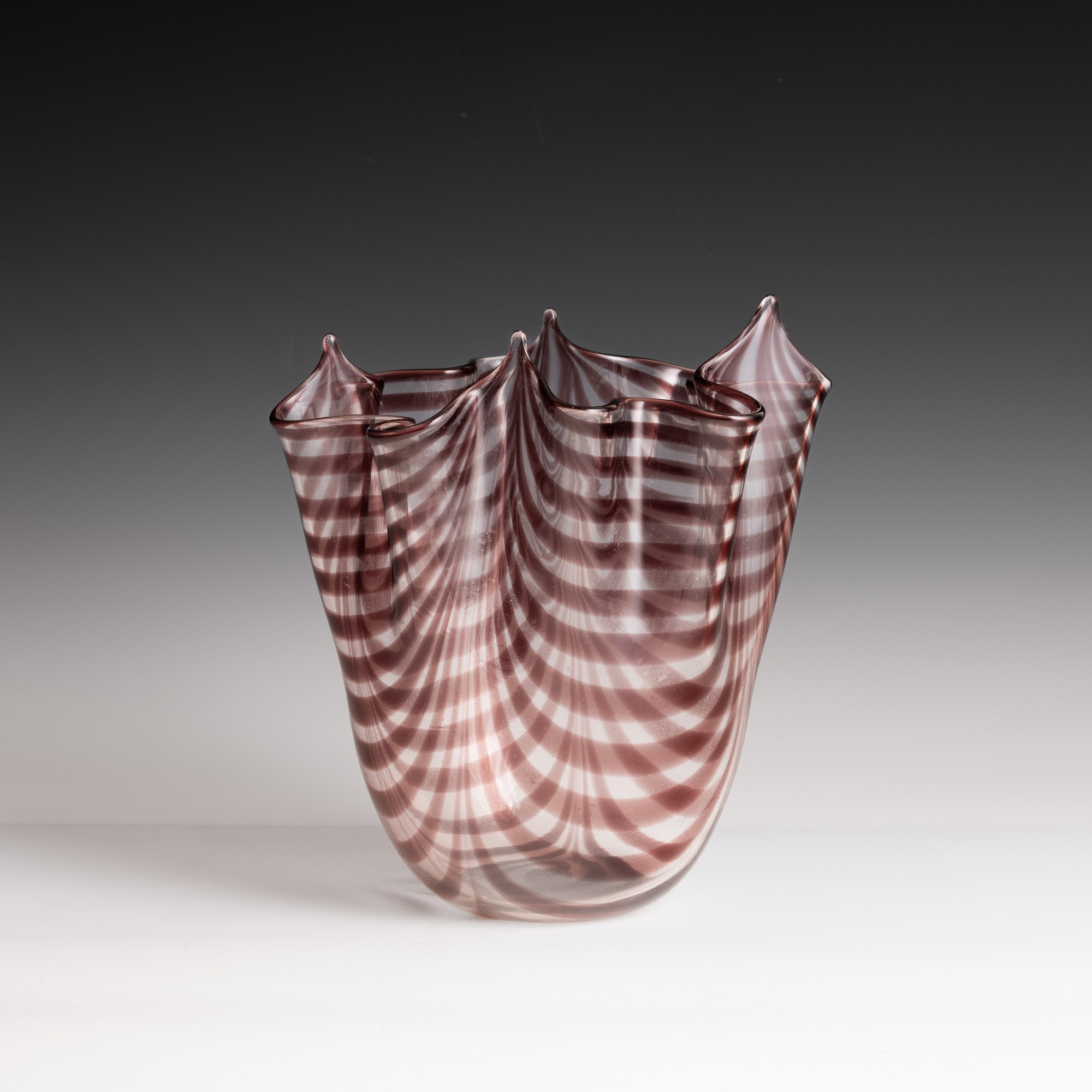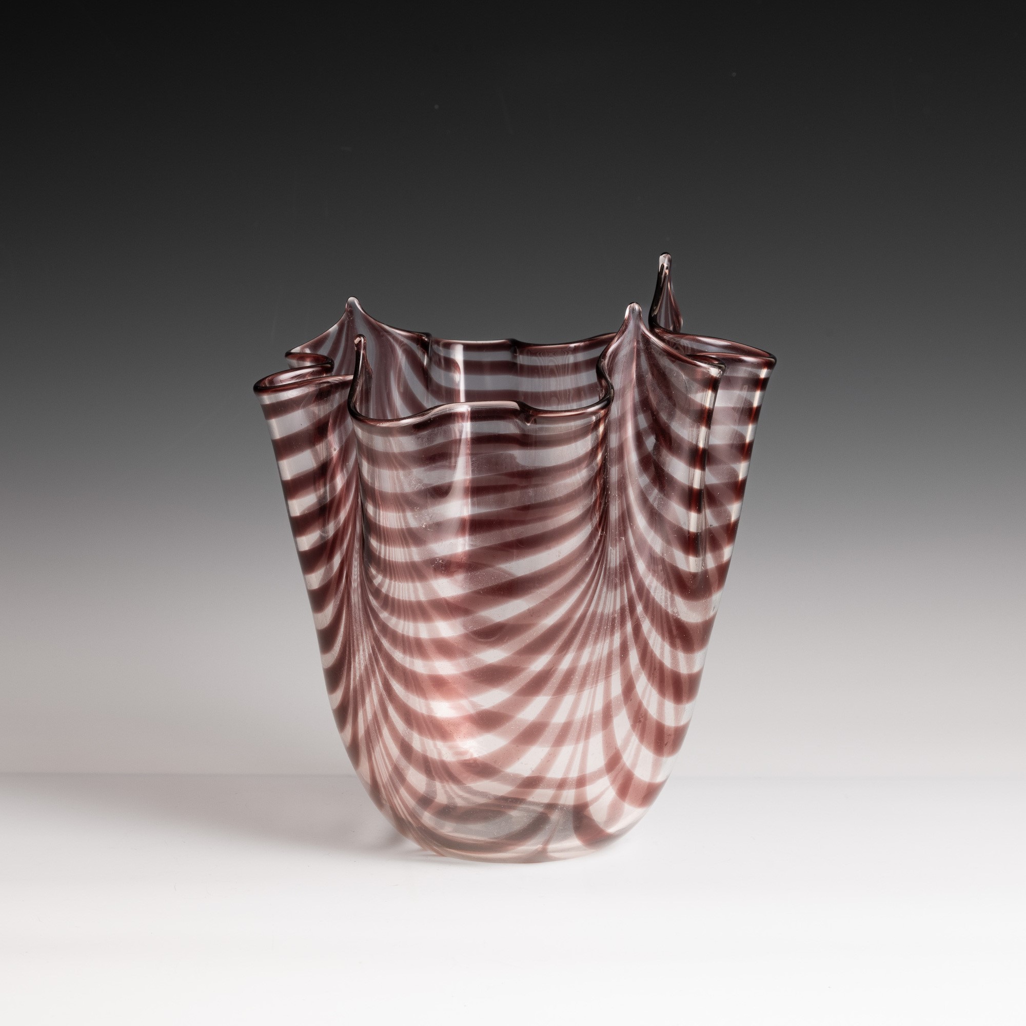 Vaso a Fazzoletto in vetro soffiato con decoro di canne festonate ciclamino.