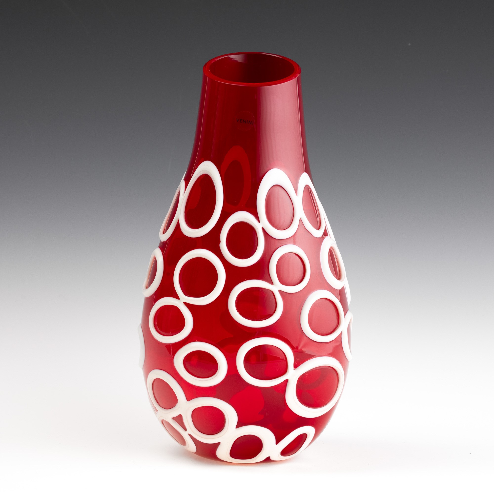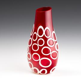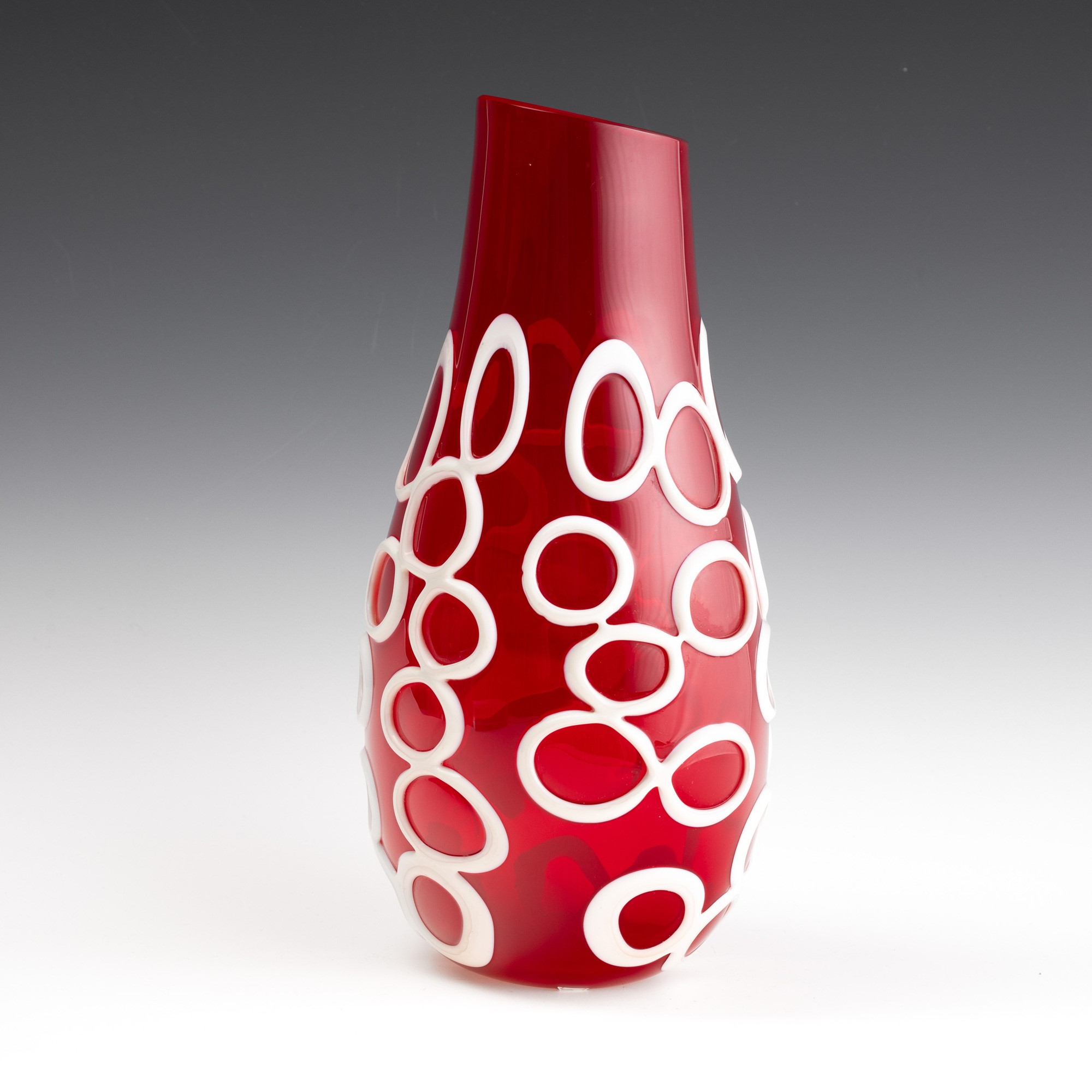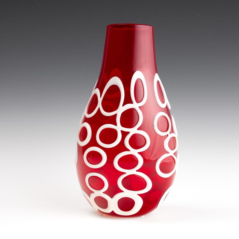 Vaso Kyklos in forma di goccia in vetro soffiato rubino con applicazioni lattimo ad anello.