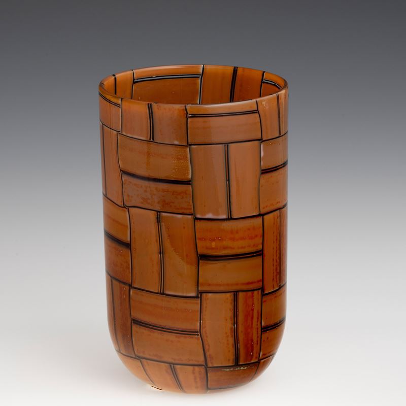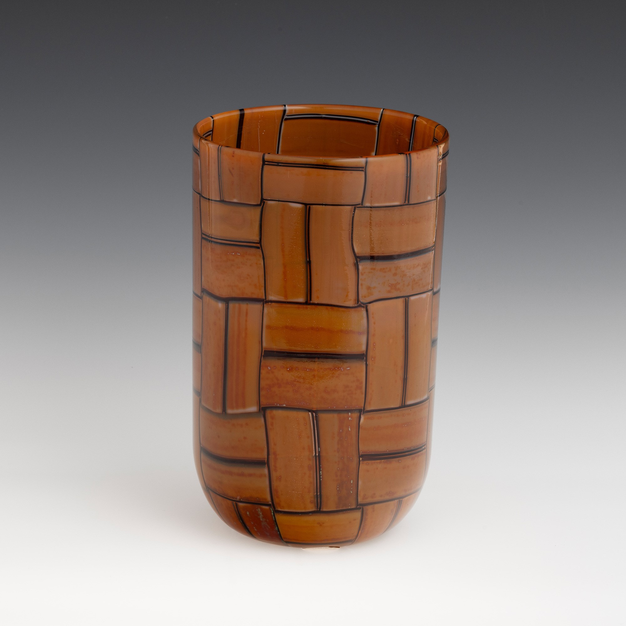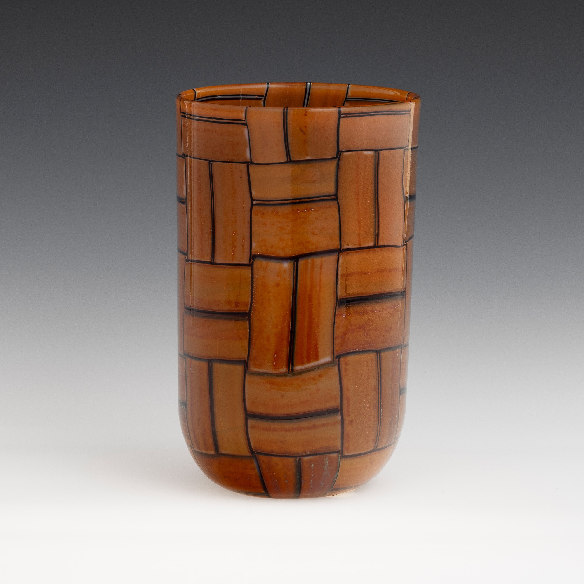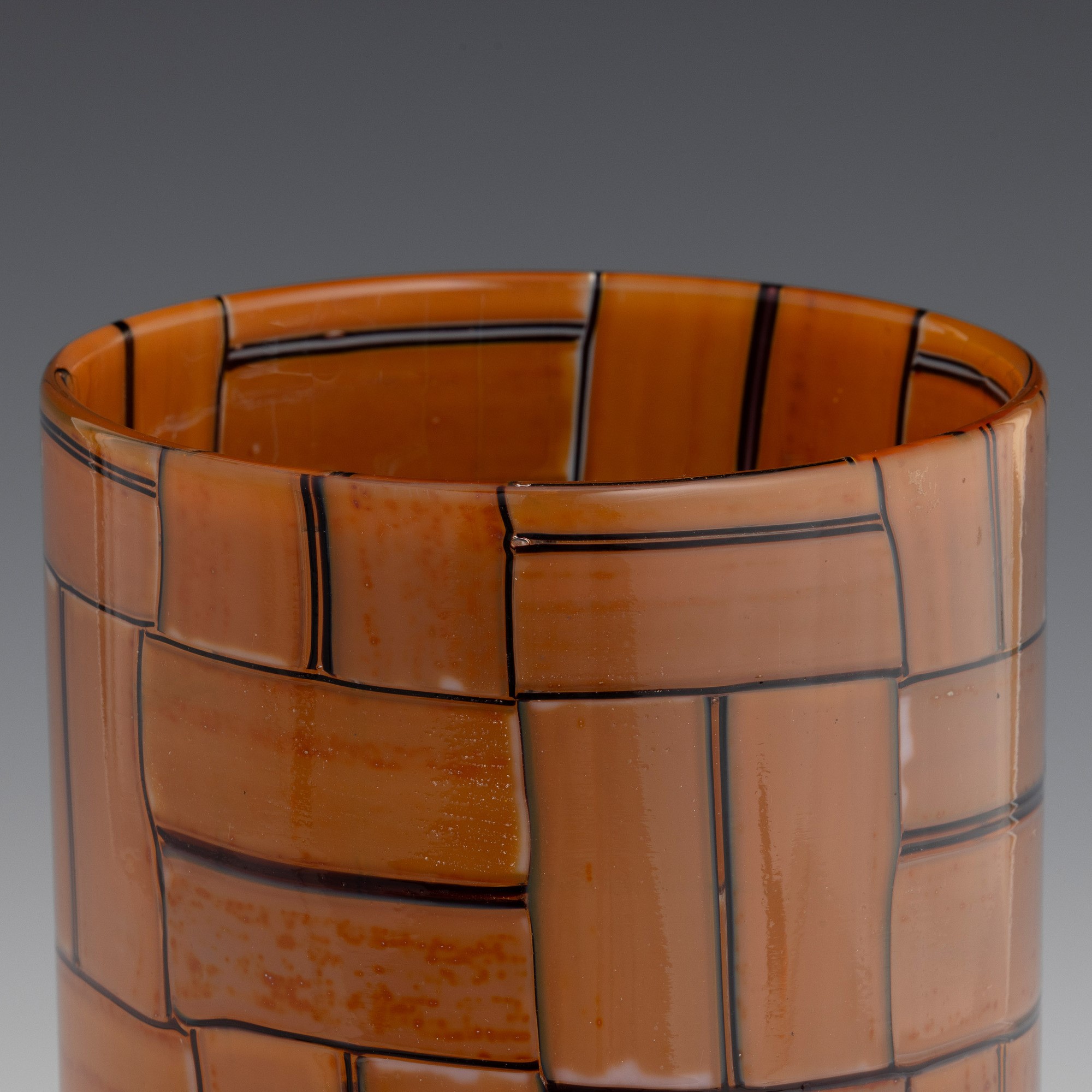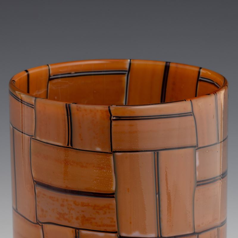 Vaso cilindrico serie Tessere Ambra in vetro soffiato con decoro di murrine a canne alternate ocra con filetti ciclamino.