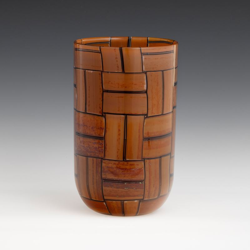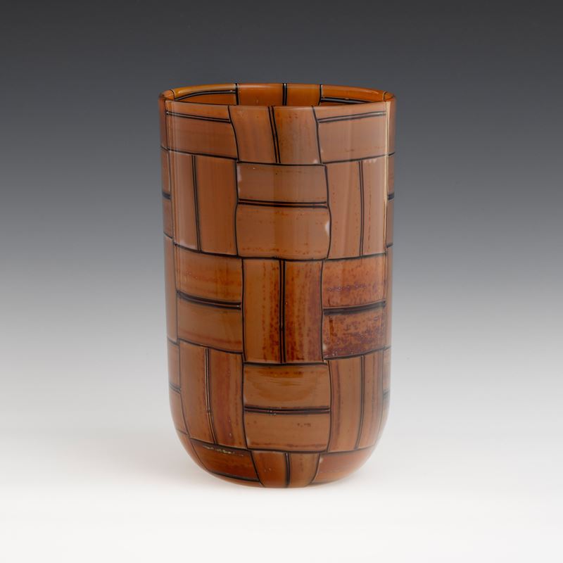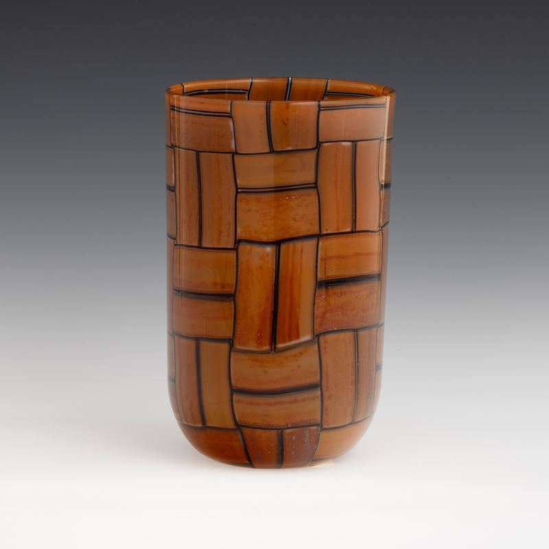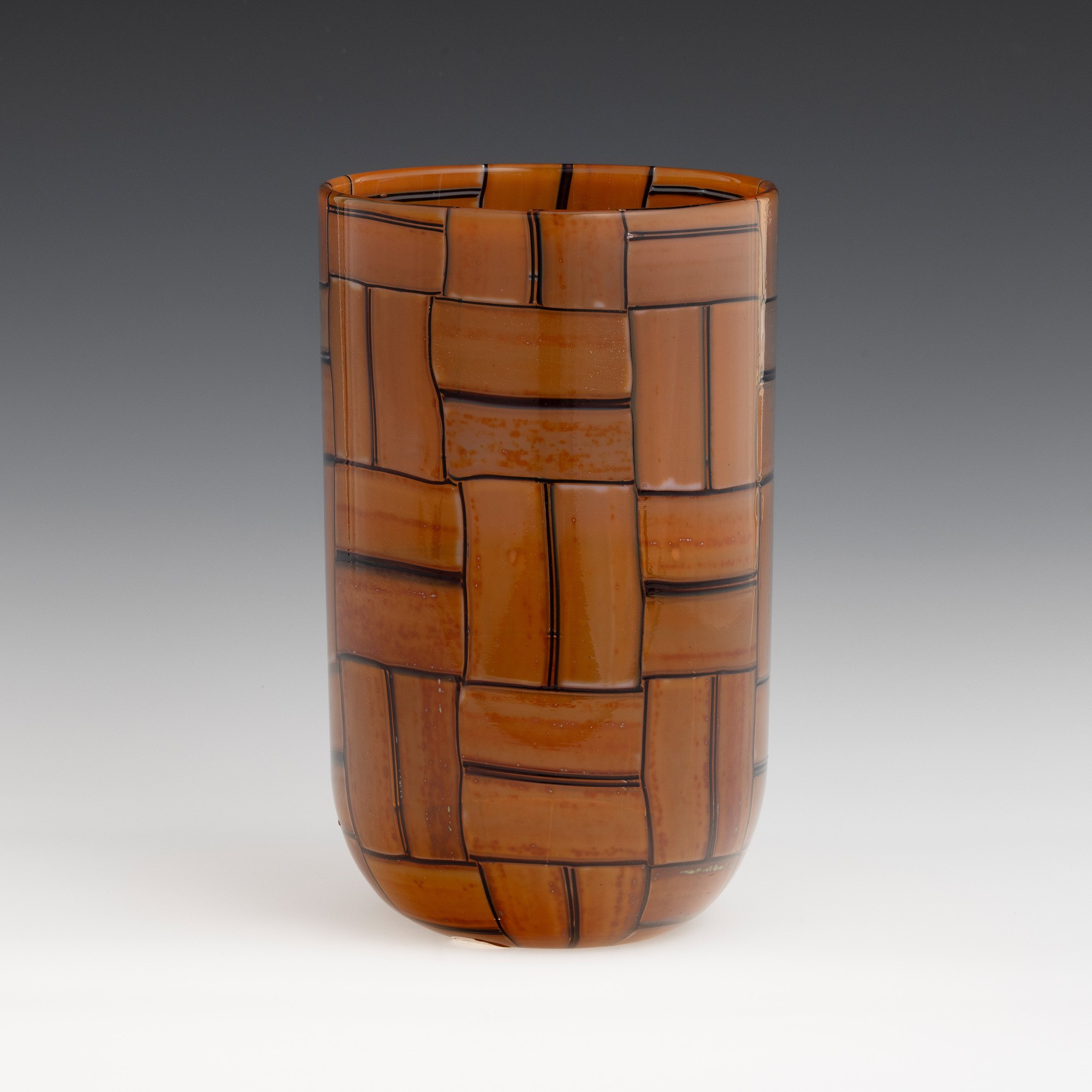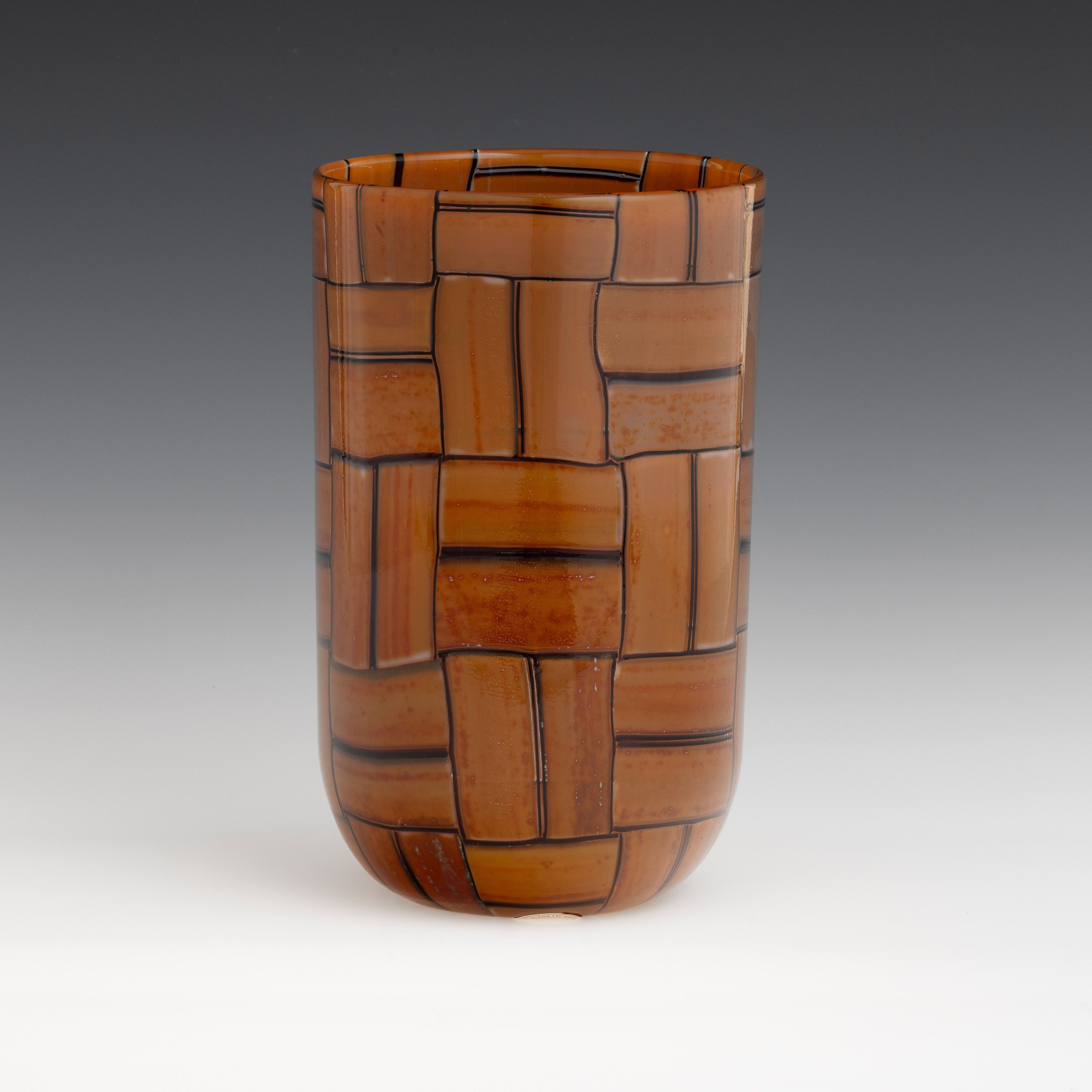 Vaso cilindrico serie Tessere Ambra in vetro soffiato con decoro di murrine a canne alternate ocra con filetti ciclamino.