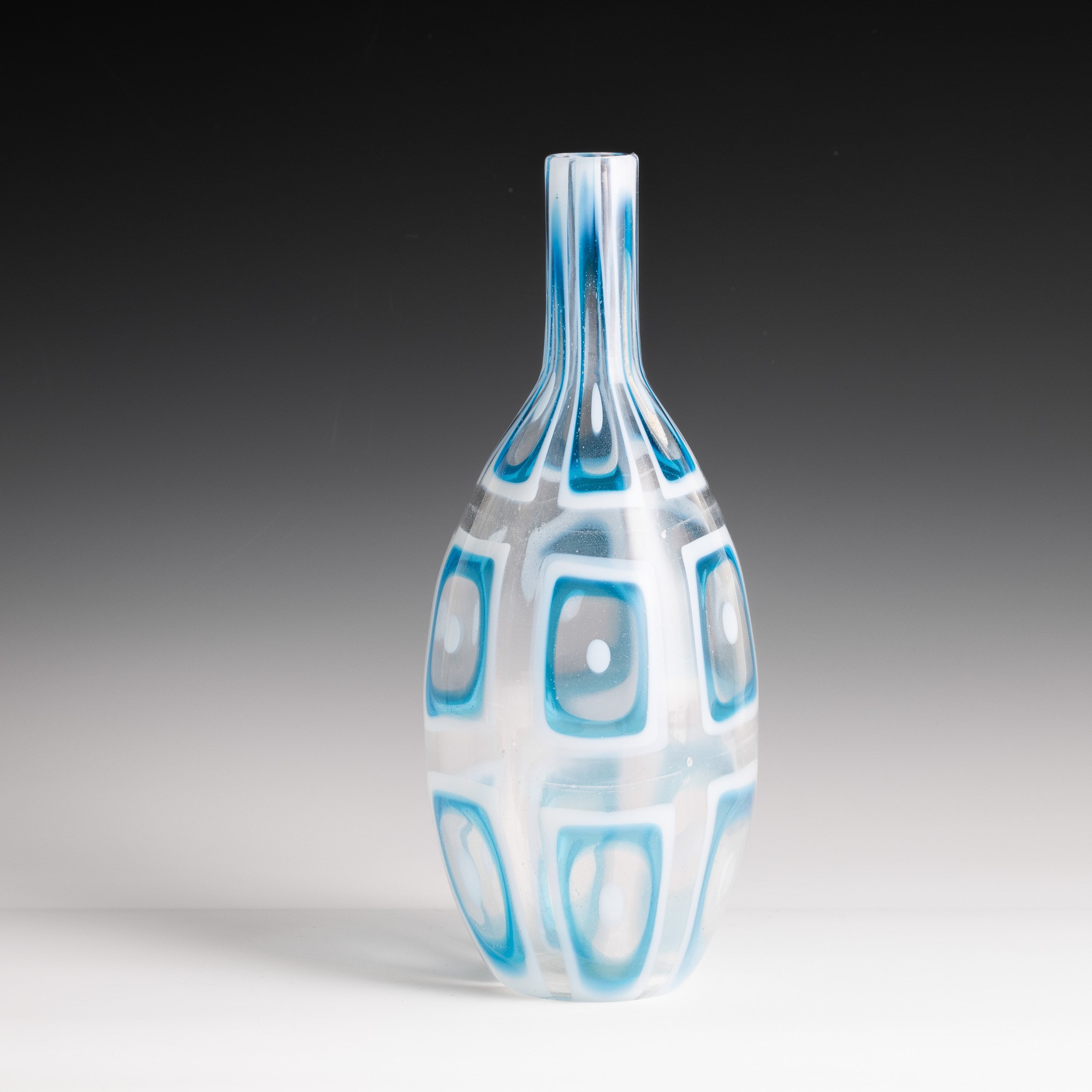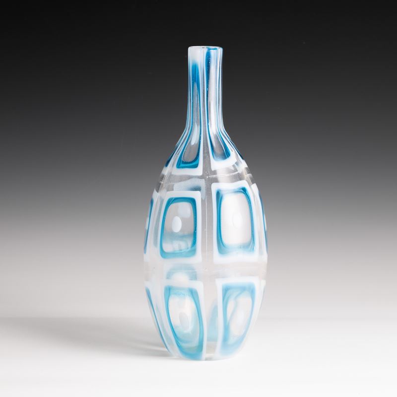 Raro vaso a bottiglia serie Dorico in vetro trasparente con decoro di grandi murrine lattimo bluino.