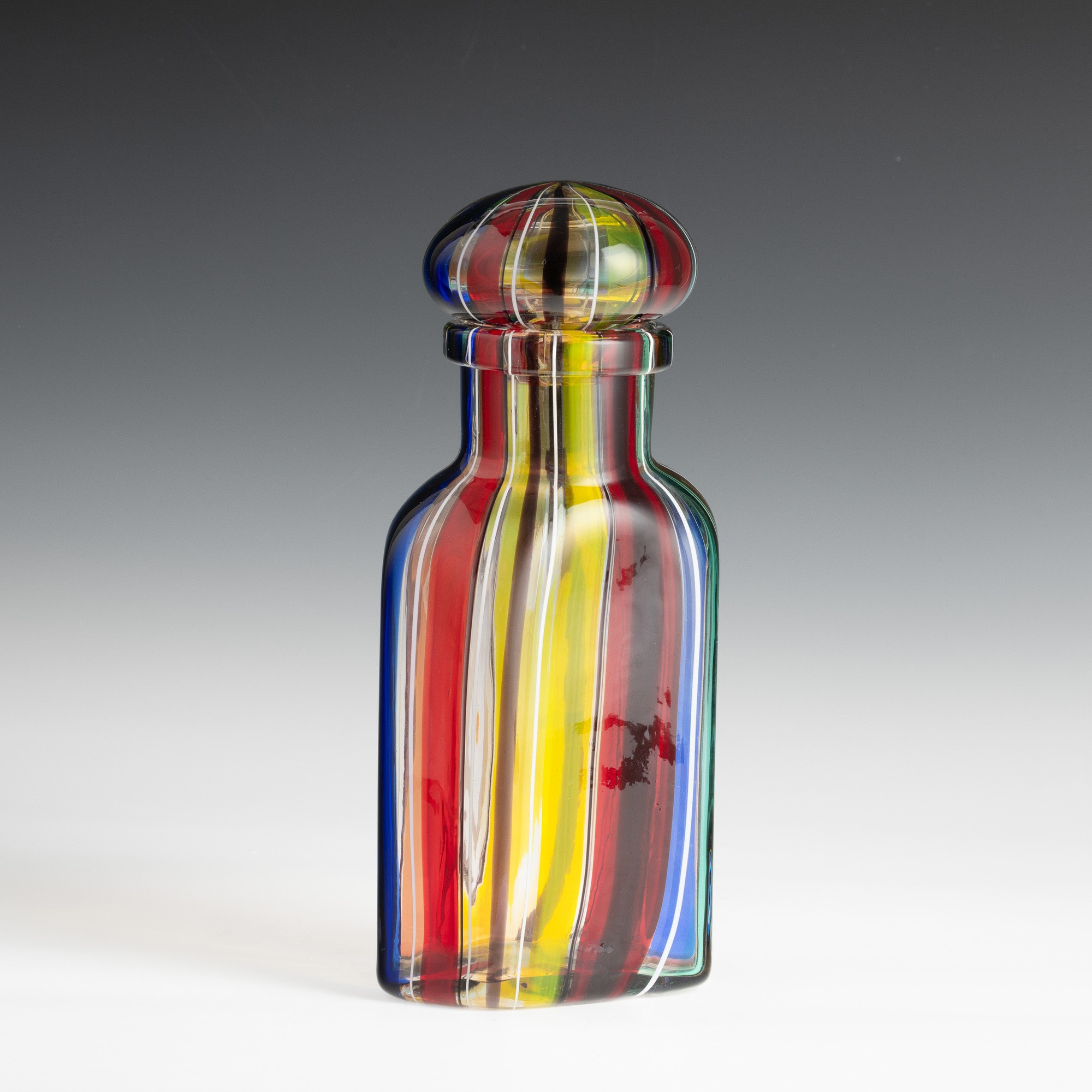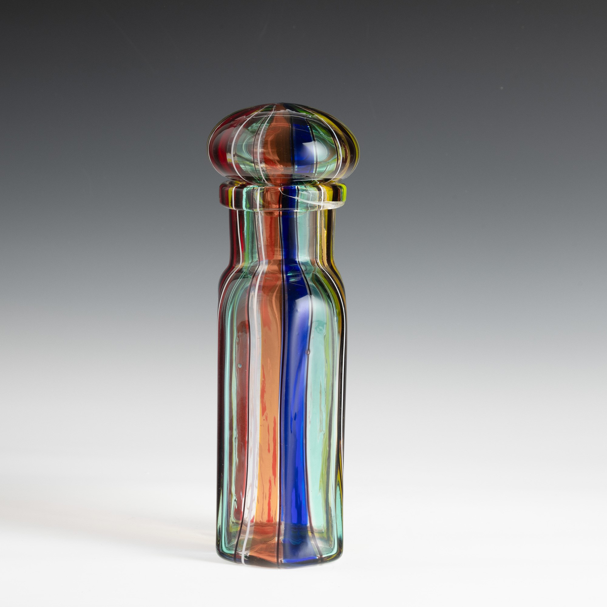 Bottiglia a sezione esagonale con tappo in vetro soffiato con decoro di canne policrome.