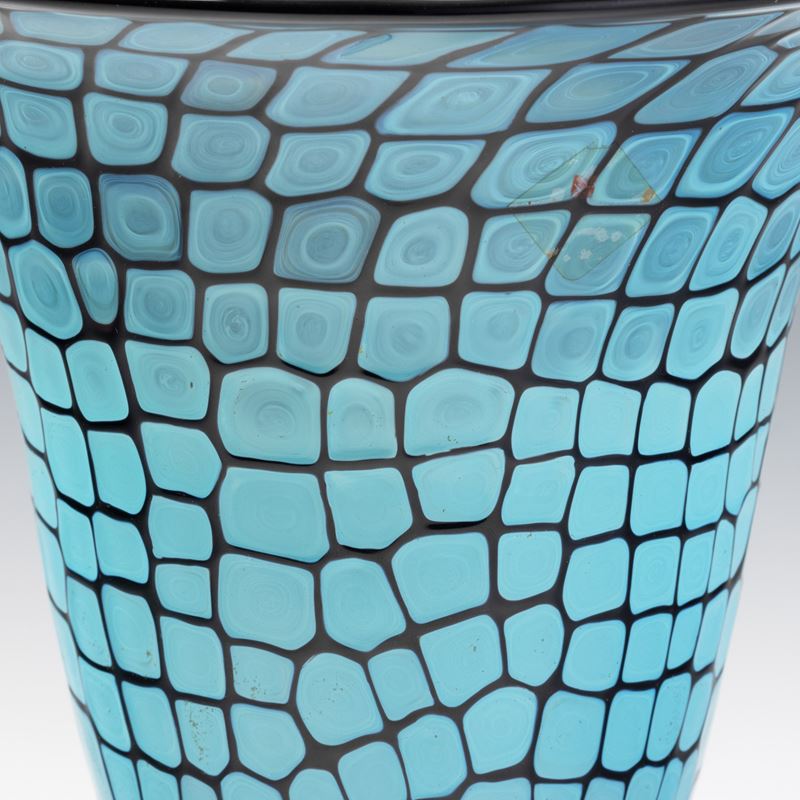 Vaso a campana su piede troncoconico applicato serie Neomurrino in vetro soffiato con decoro di murrine turchesi bordate di nero.