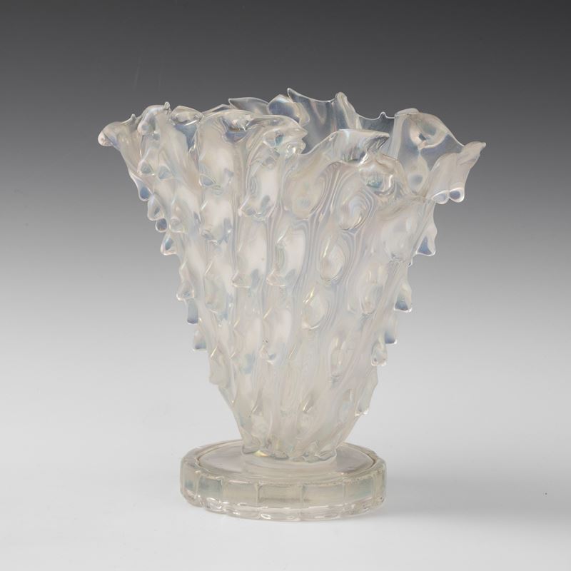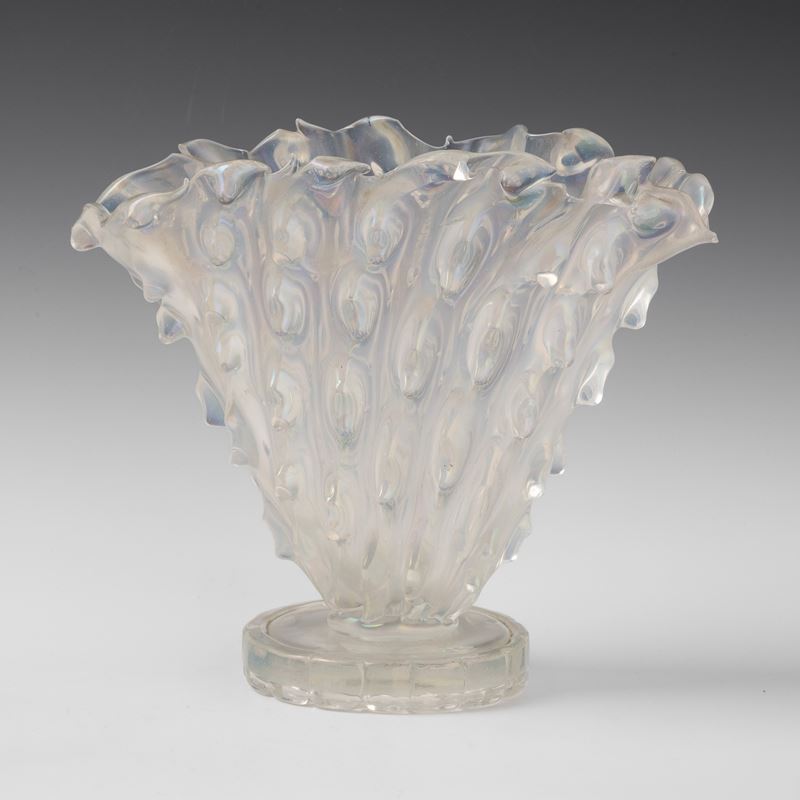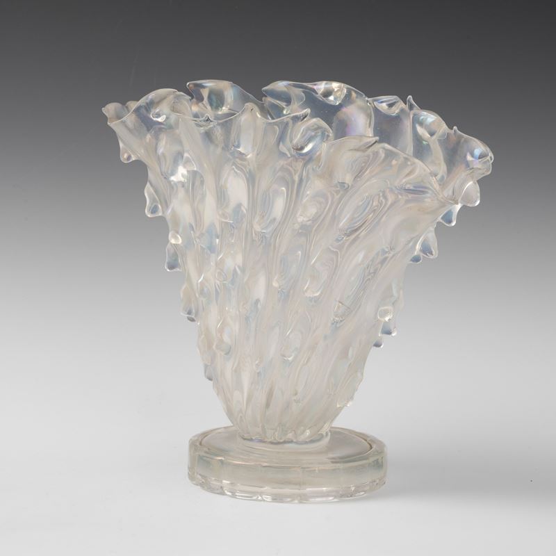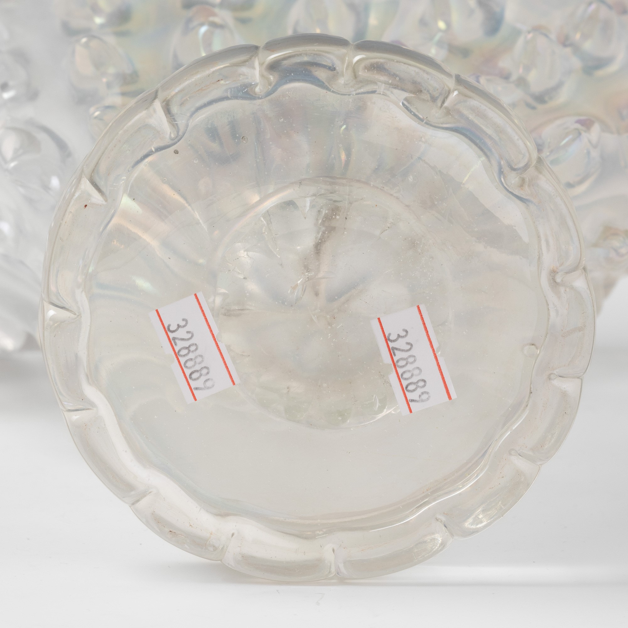 Vaso a ventaglio serie Medusa su base circolare in vetro massiccio fortemente iridato costellato da applicazioni vitree simili a tentacoli.