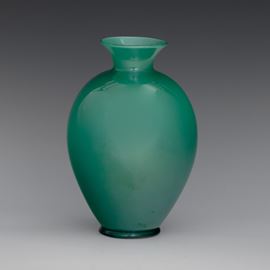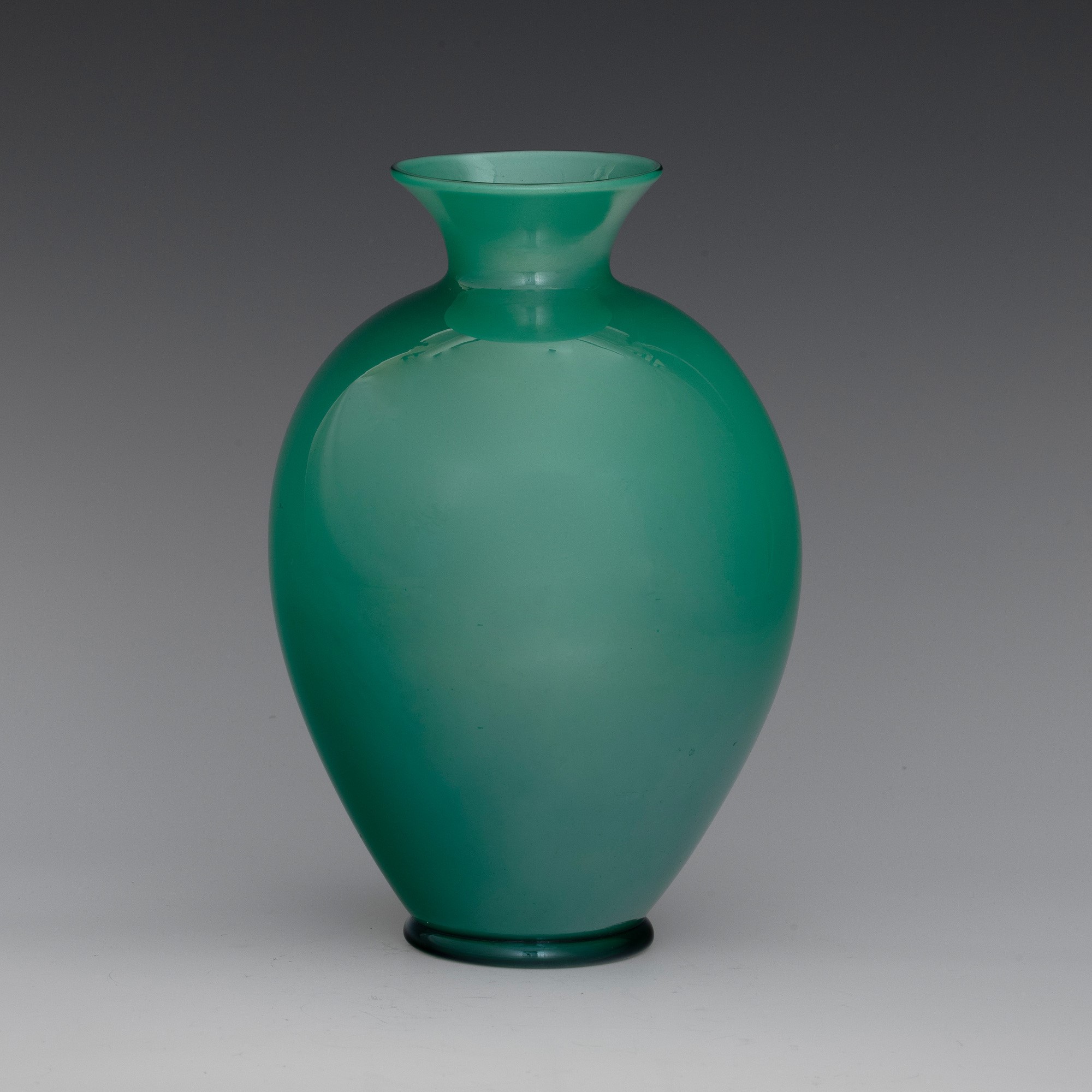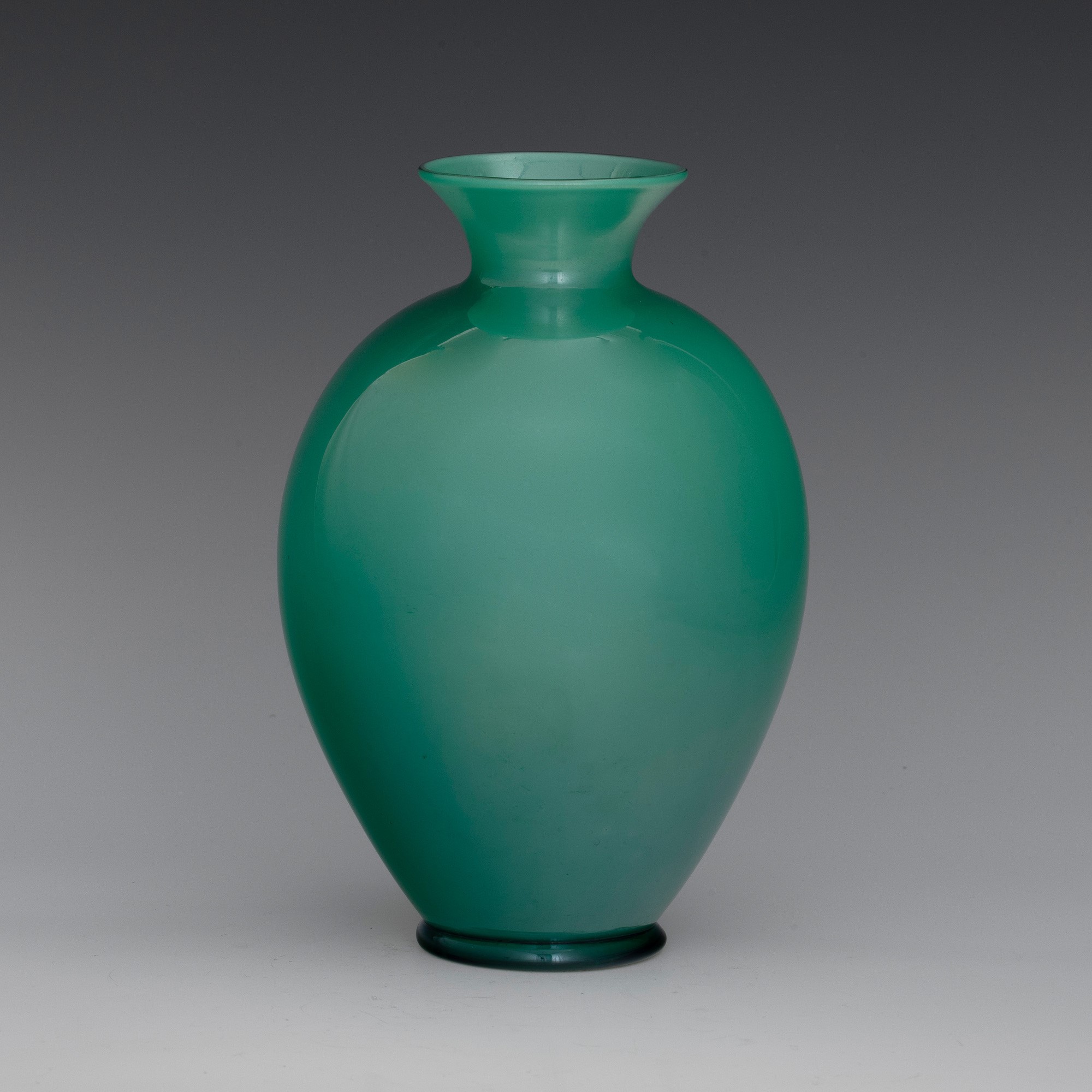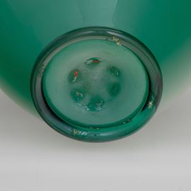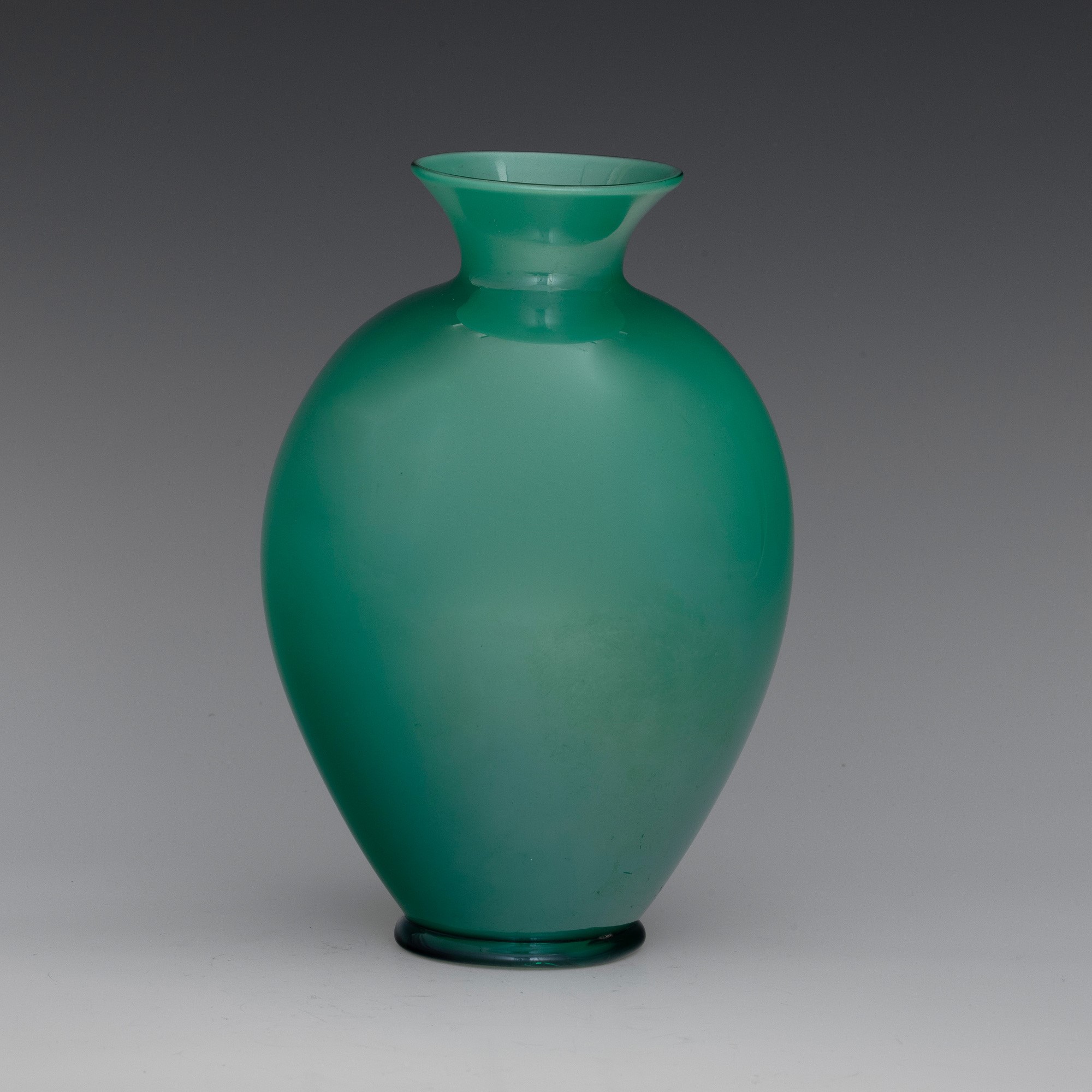 Vaso a uovo rovesciato con collo svasato e piede applicato in vetro incamiciato. Superficie interamente iridata.