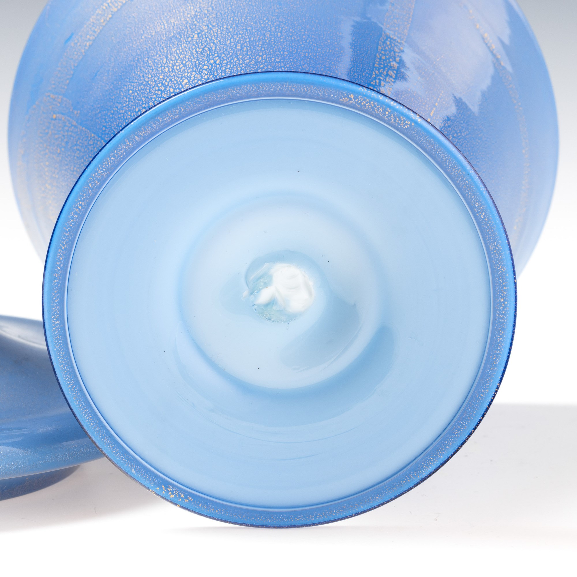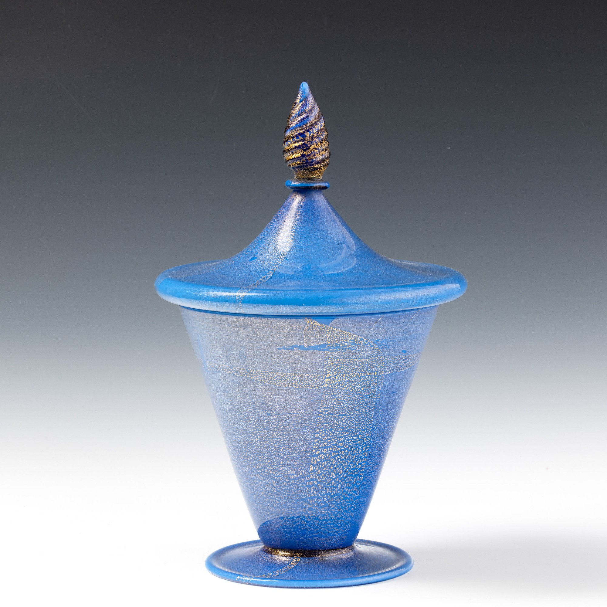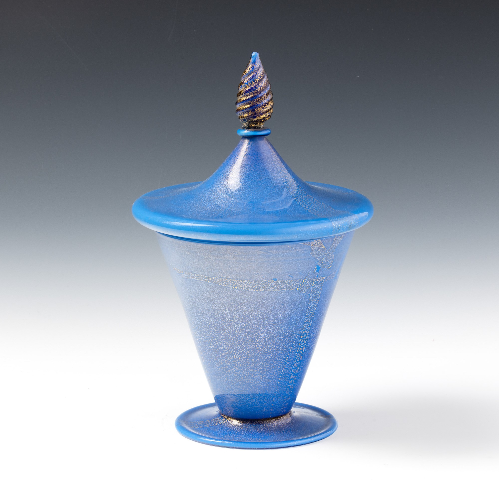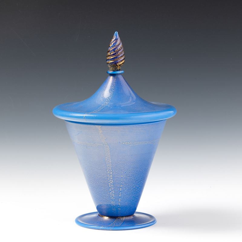 Compostiera troncoconica su piede circolare con coperchio in vetro incamiciato e decoro di foglia oro. Presa in forma di pigna.