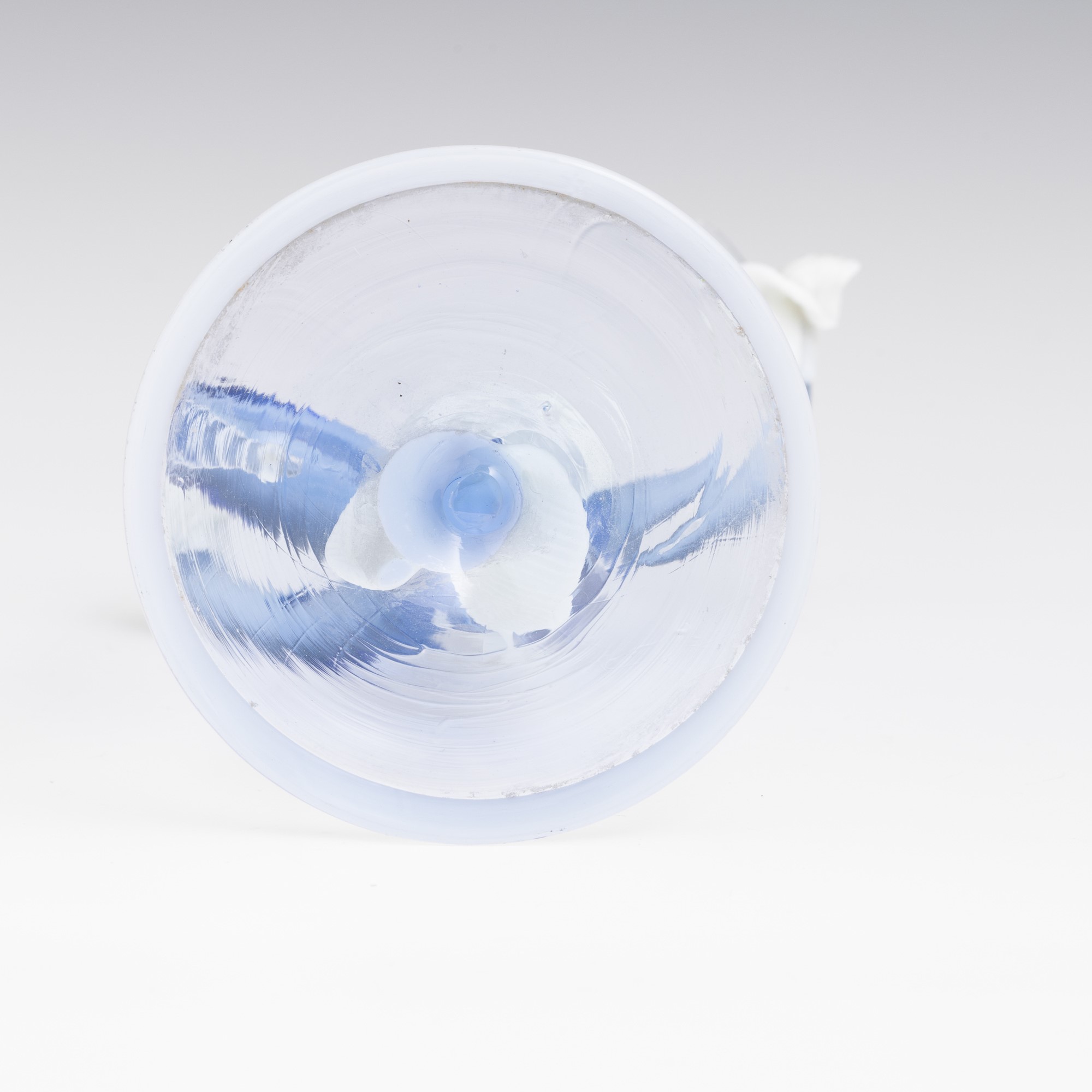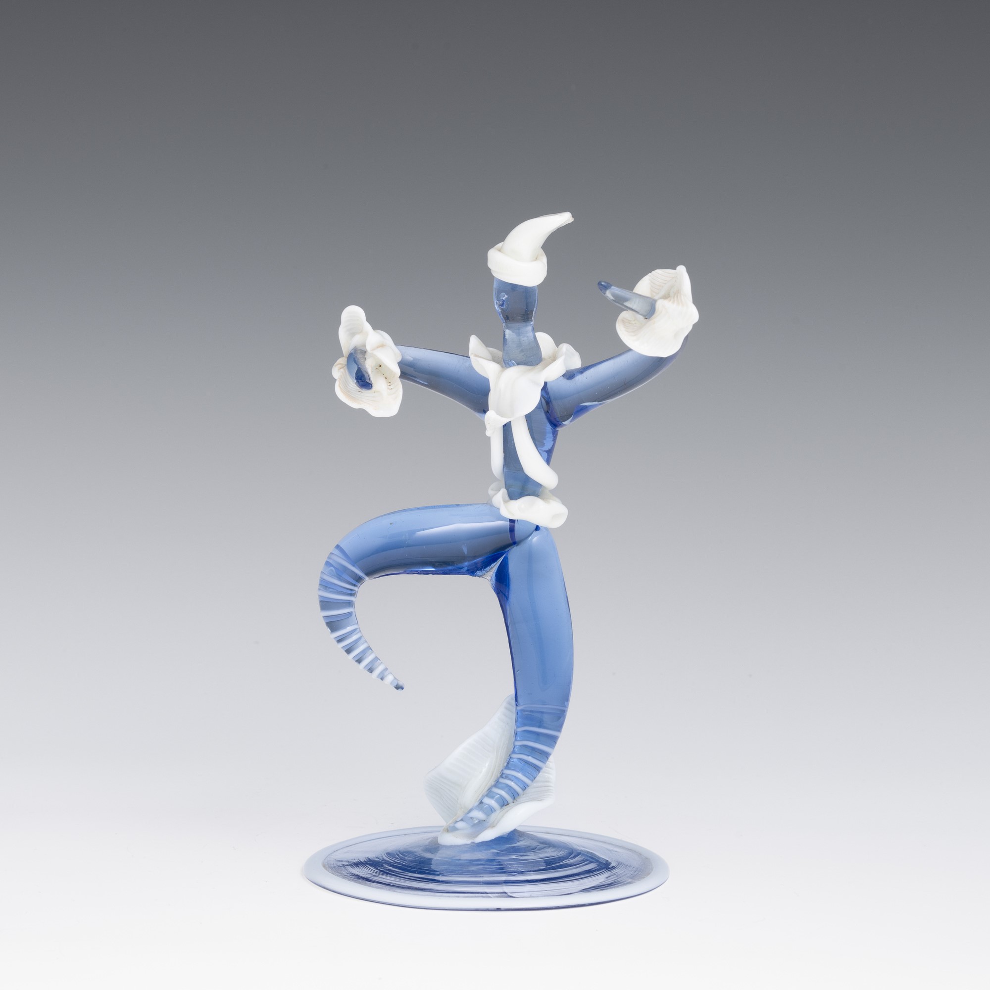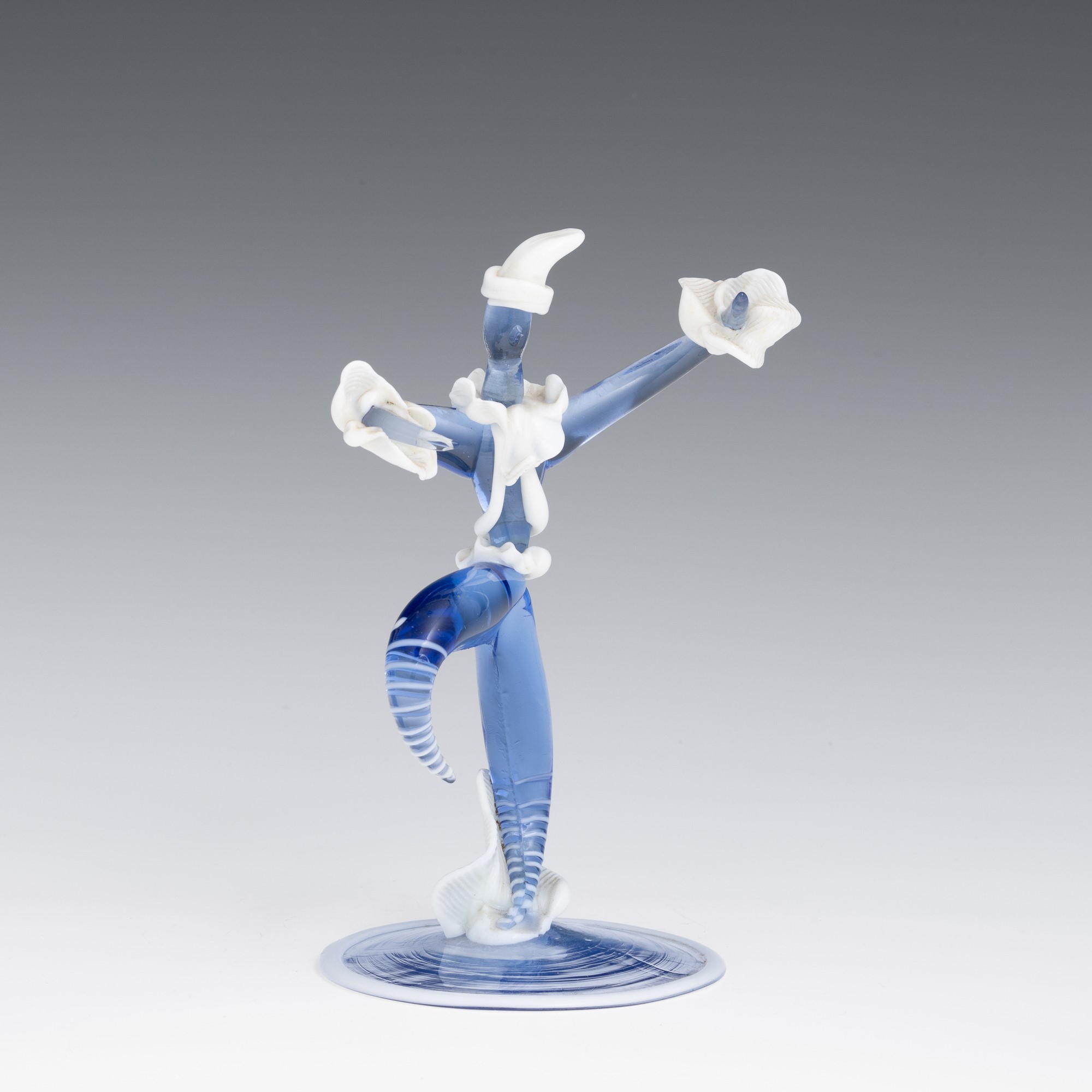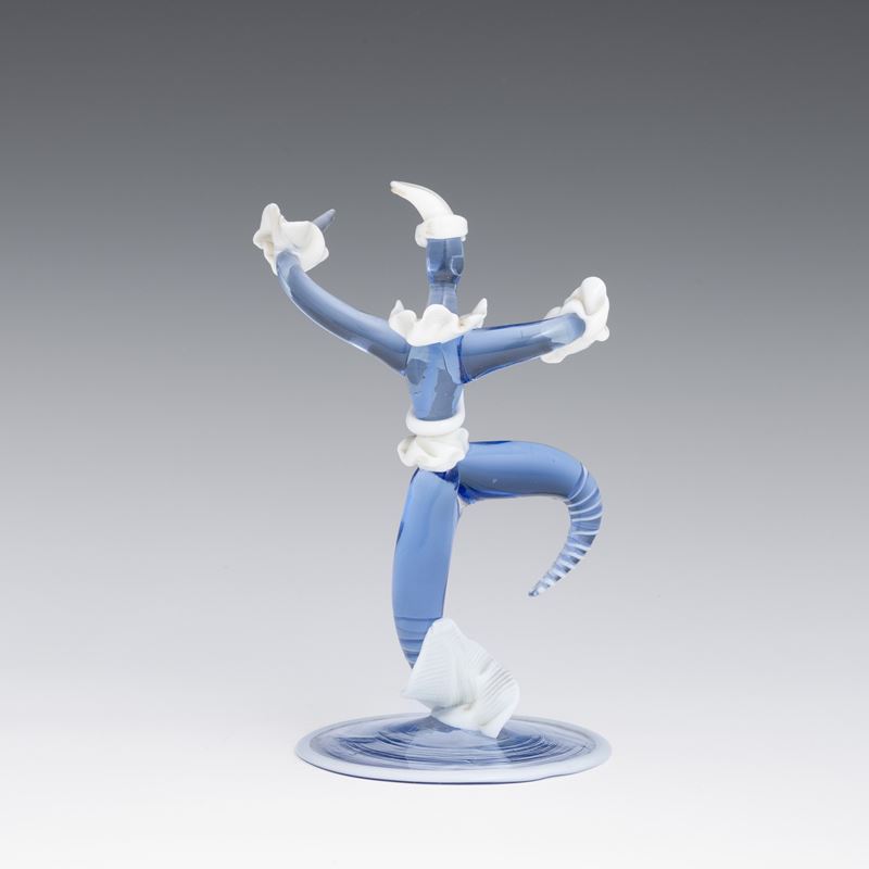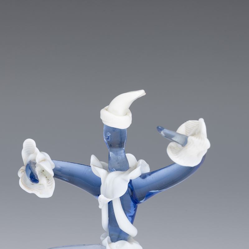 Figura di danzatore in vetro modellato a caldo azzurrino su basamento circolare con dettagli applicati in vetro lattimo. Firma all’acido Veronese Glass. Superficie leggermente iridata.