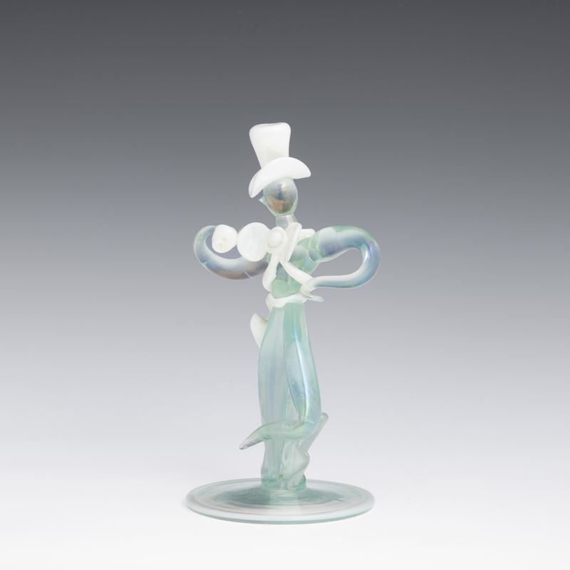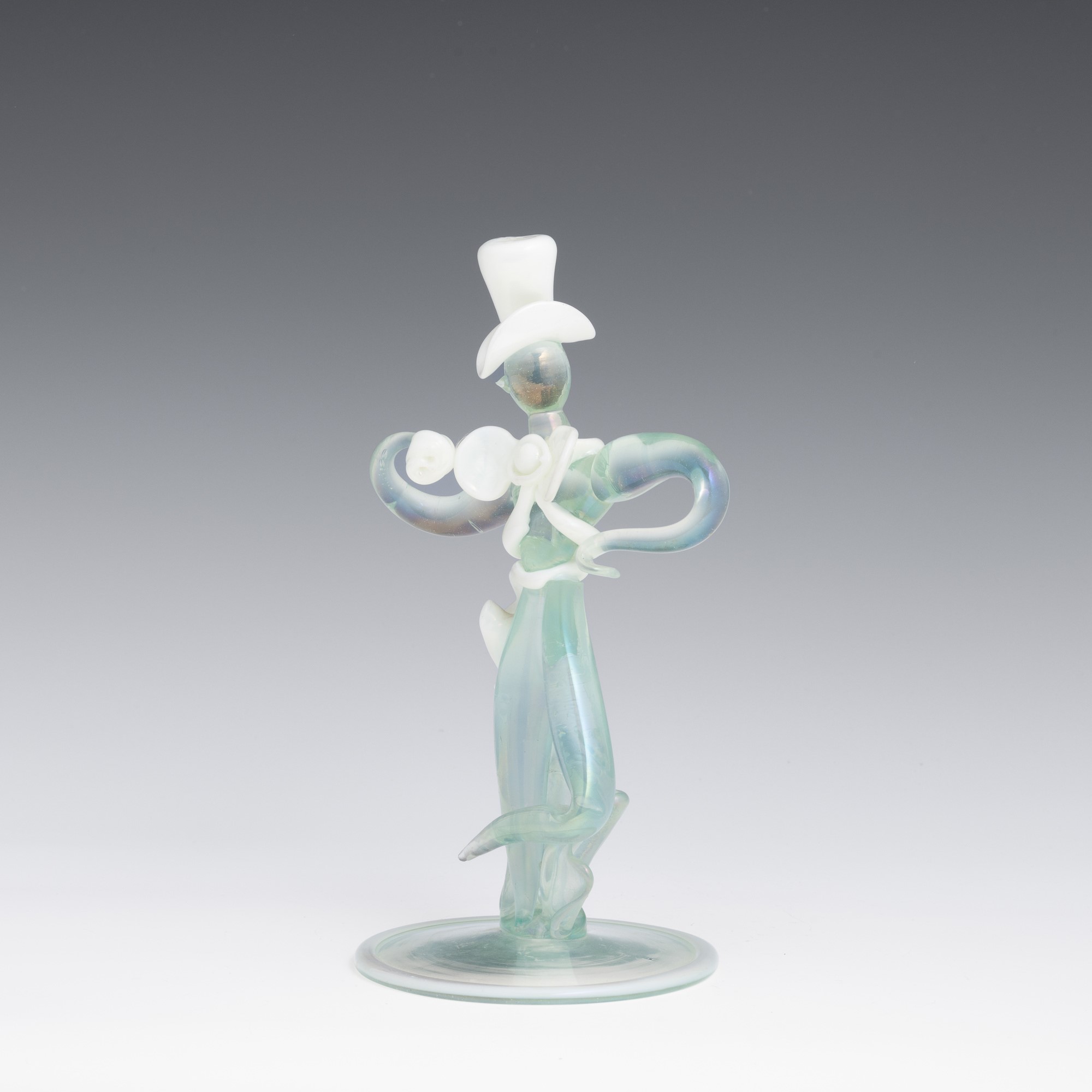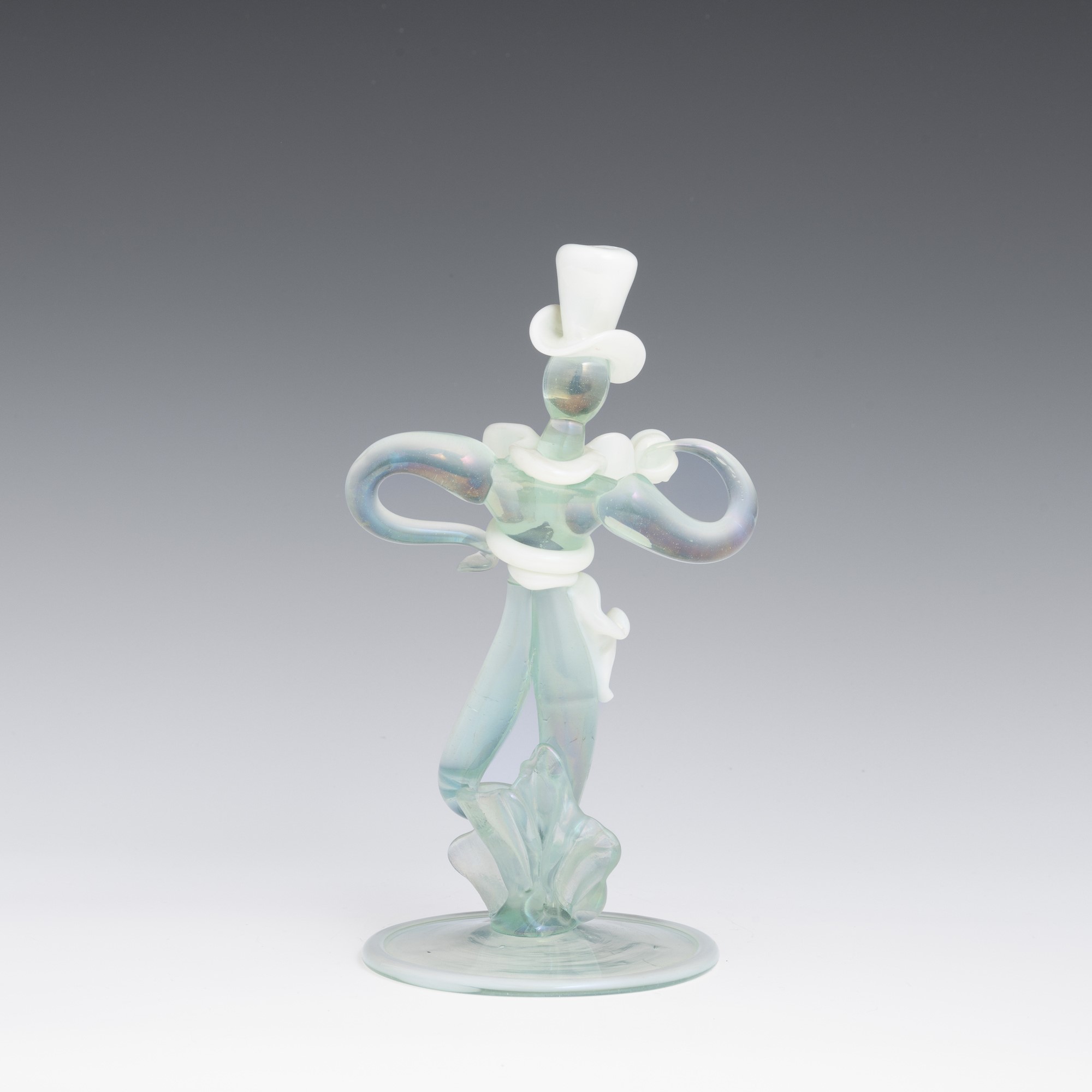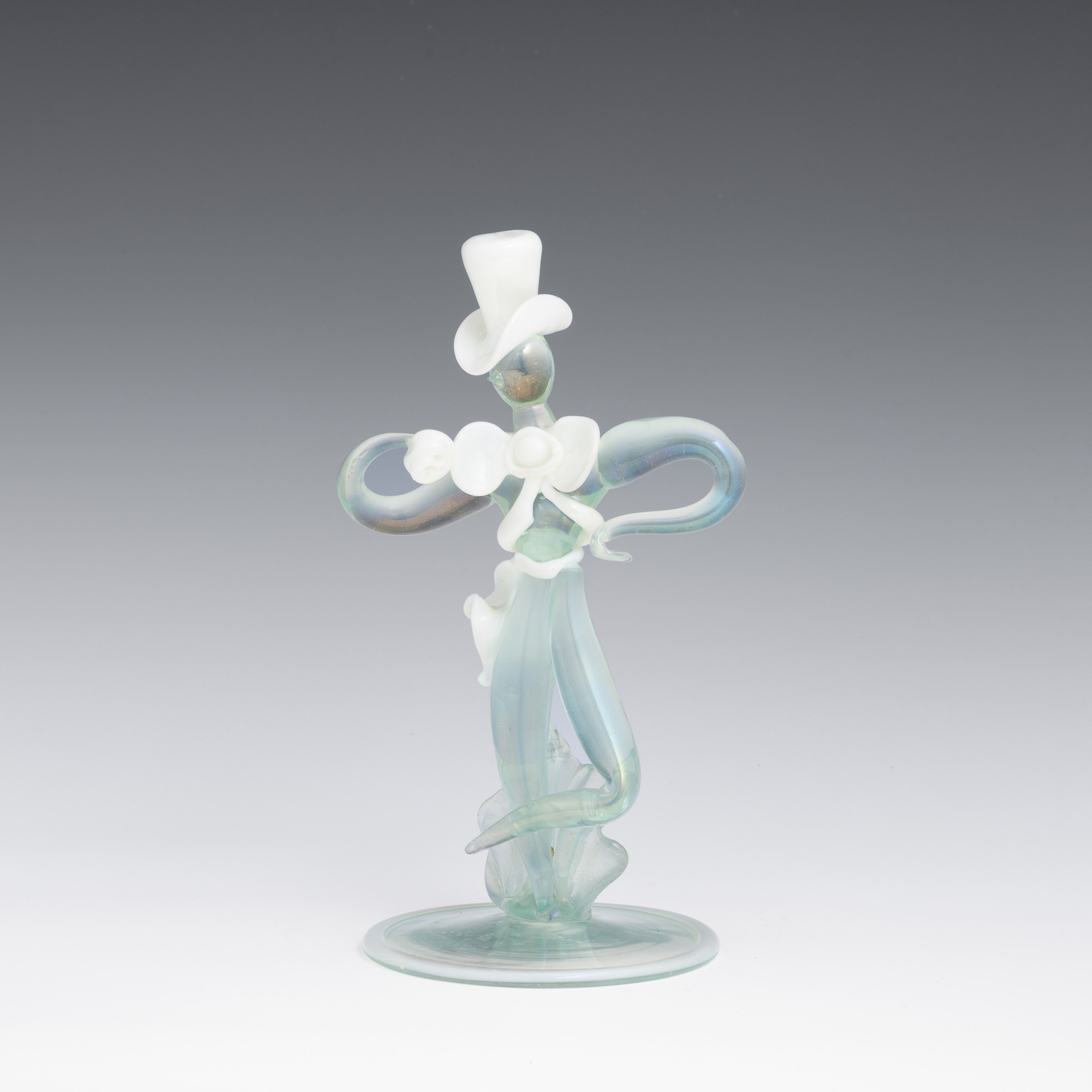 Figura di danzatore in vetro modellato a caldo verdino su basamento circolare con applicazioni in vetro opalescente. Superficie interamente iridata.
