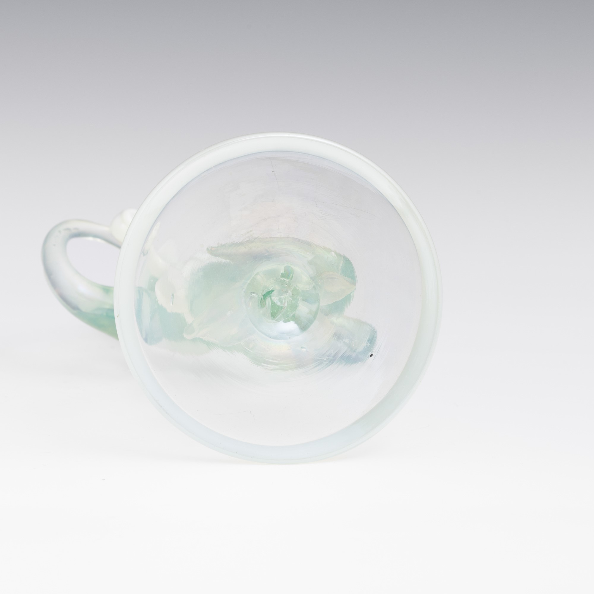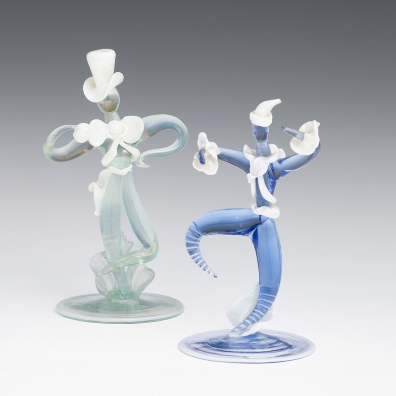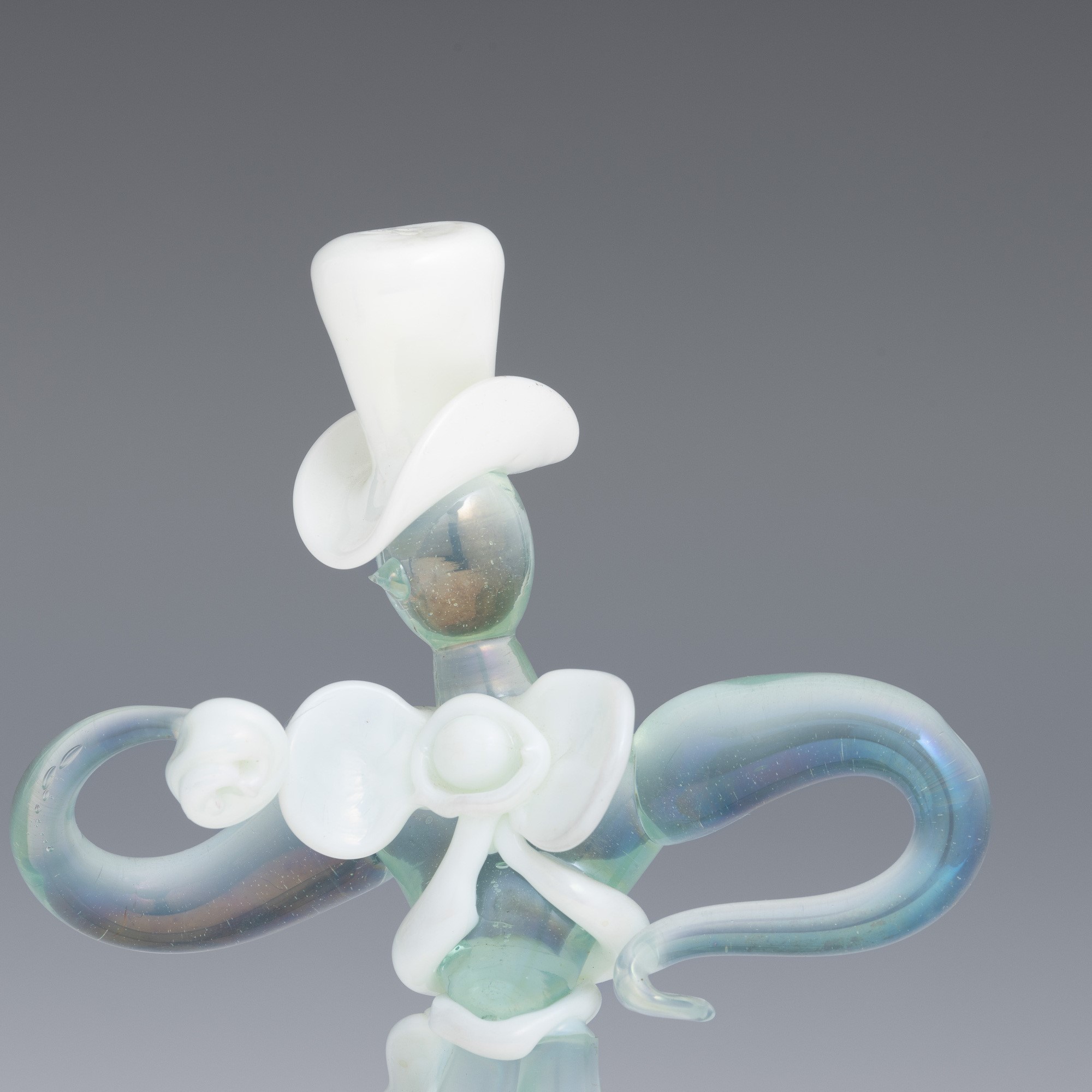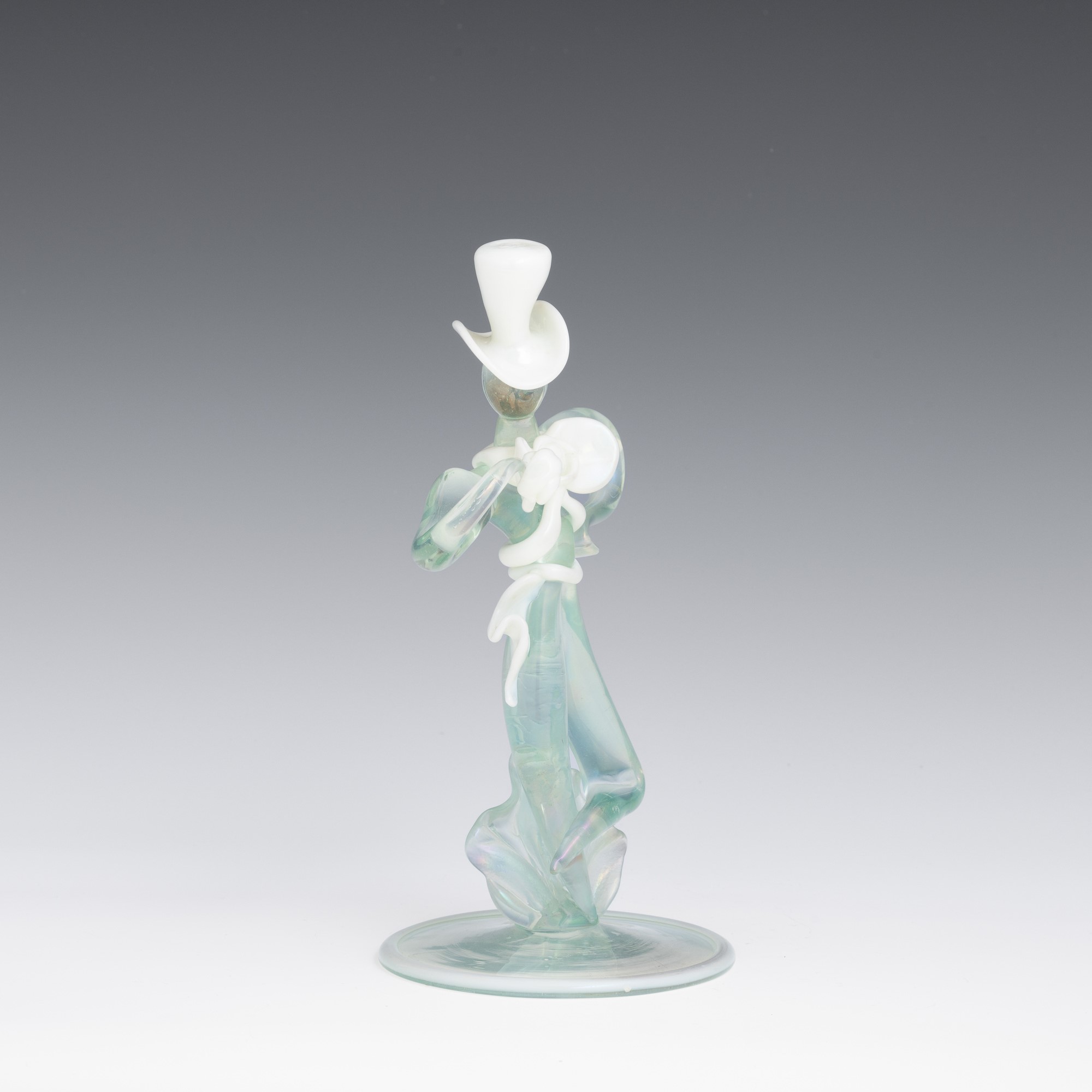 Figura di danzatore in vetro modellato a caldo verdino su basamento circolare con applicazioni in vetro opalescente. Superficie interamente iridata.