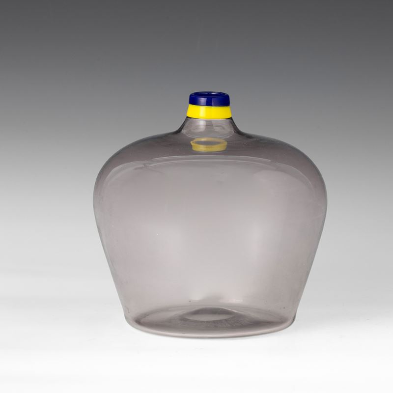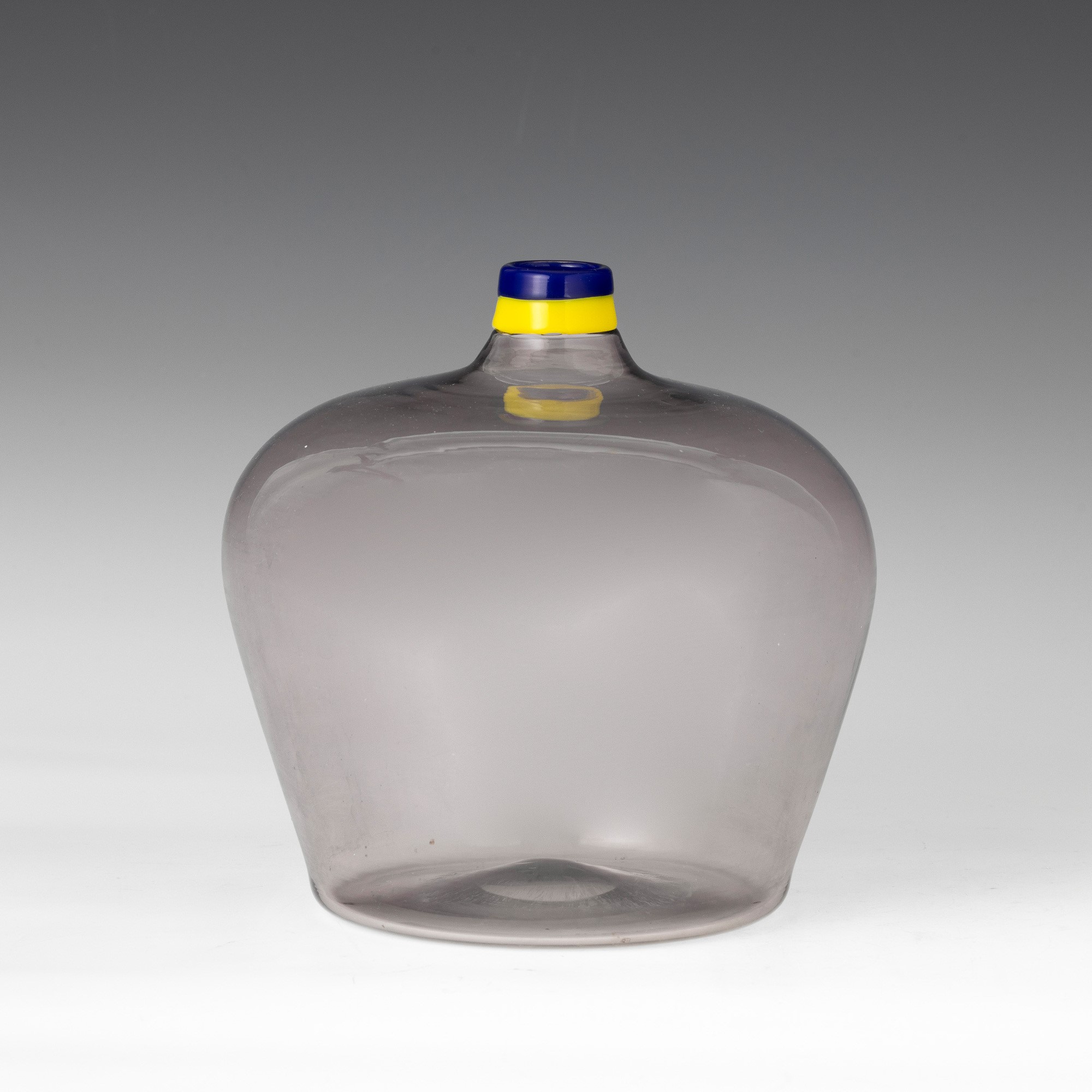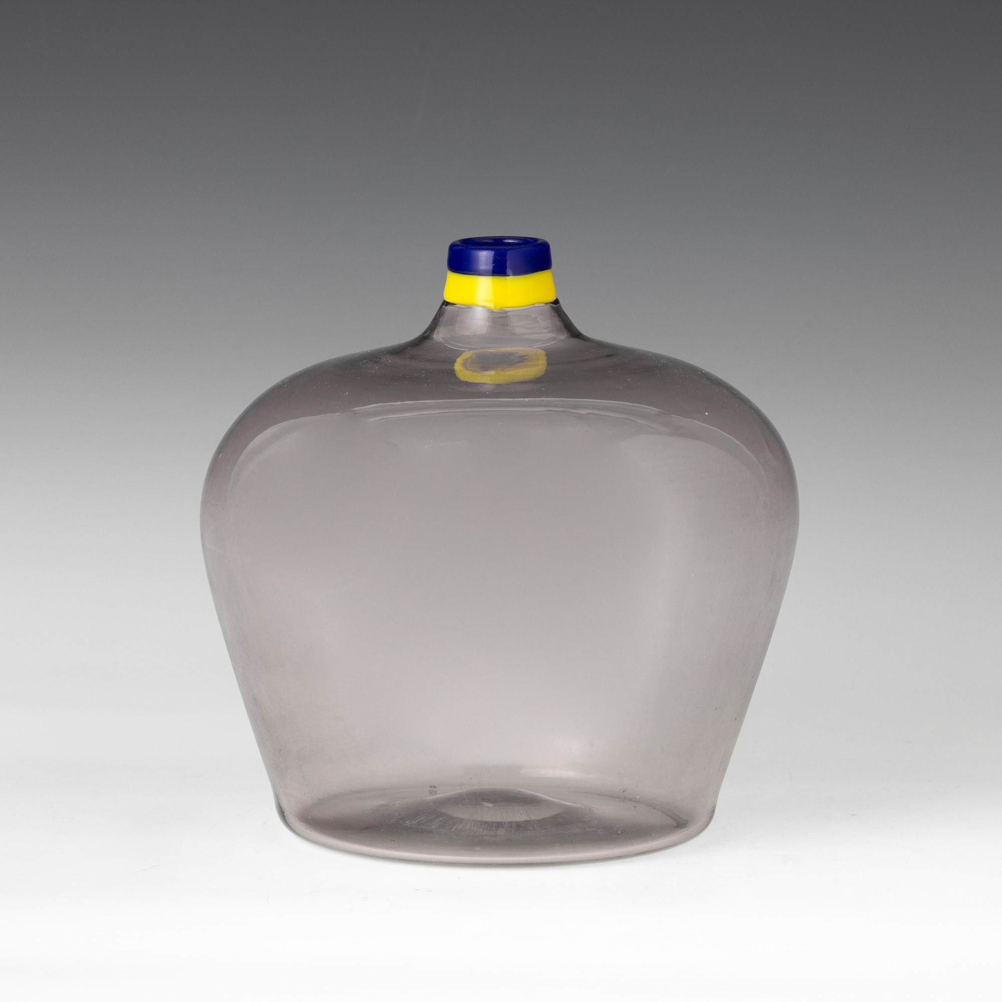 Vaso in vetro soffiato viola pallido con piccolo collo a incalmo bicolore.