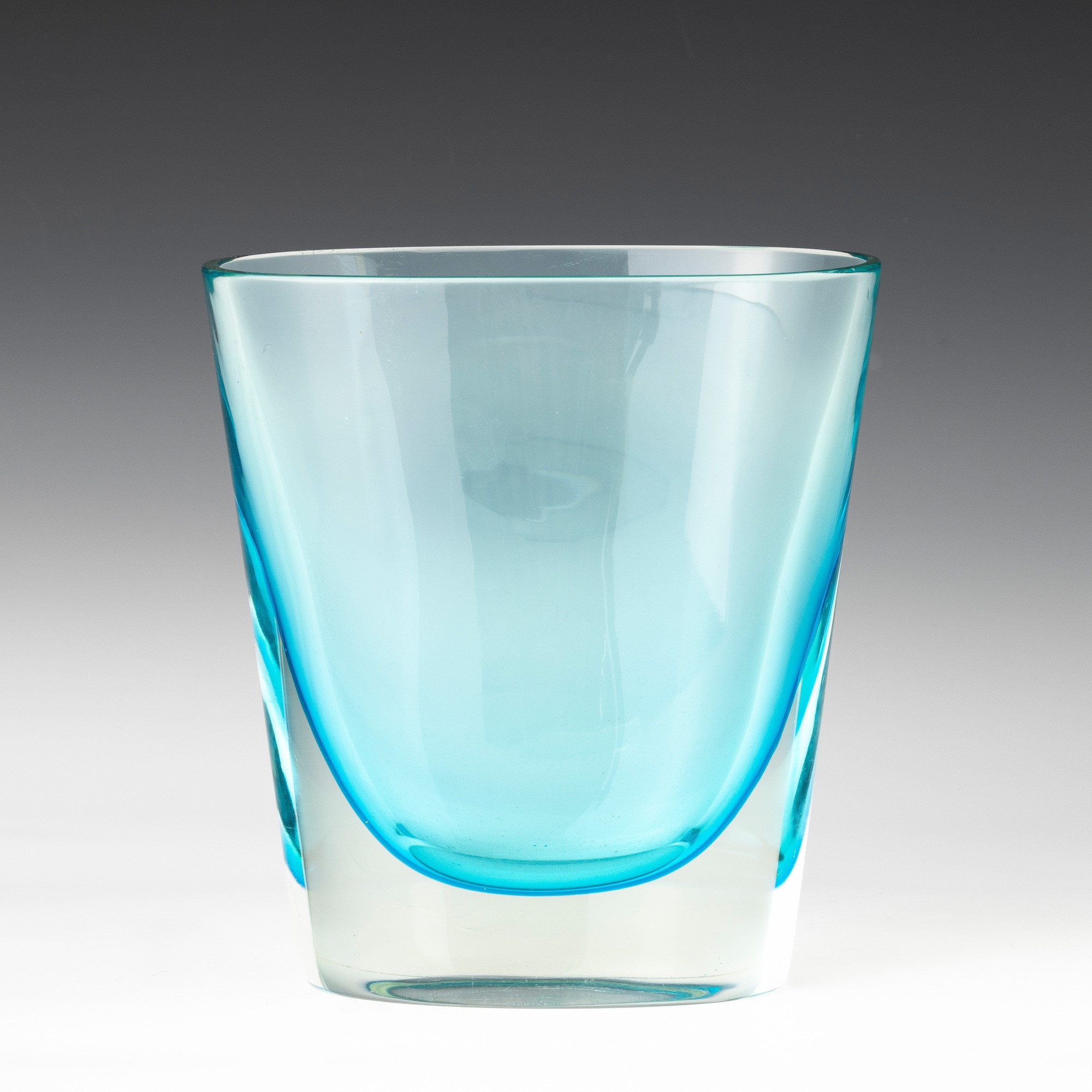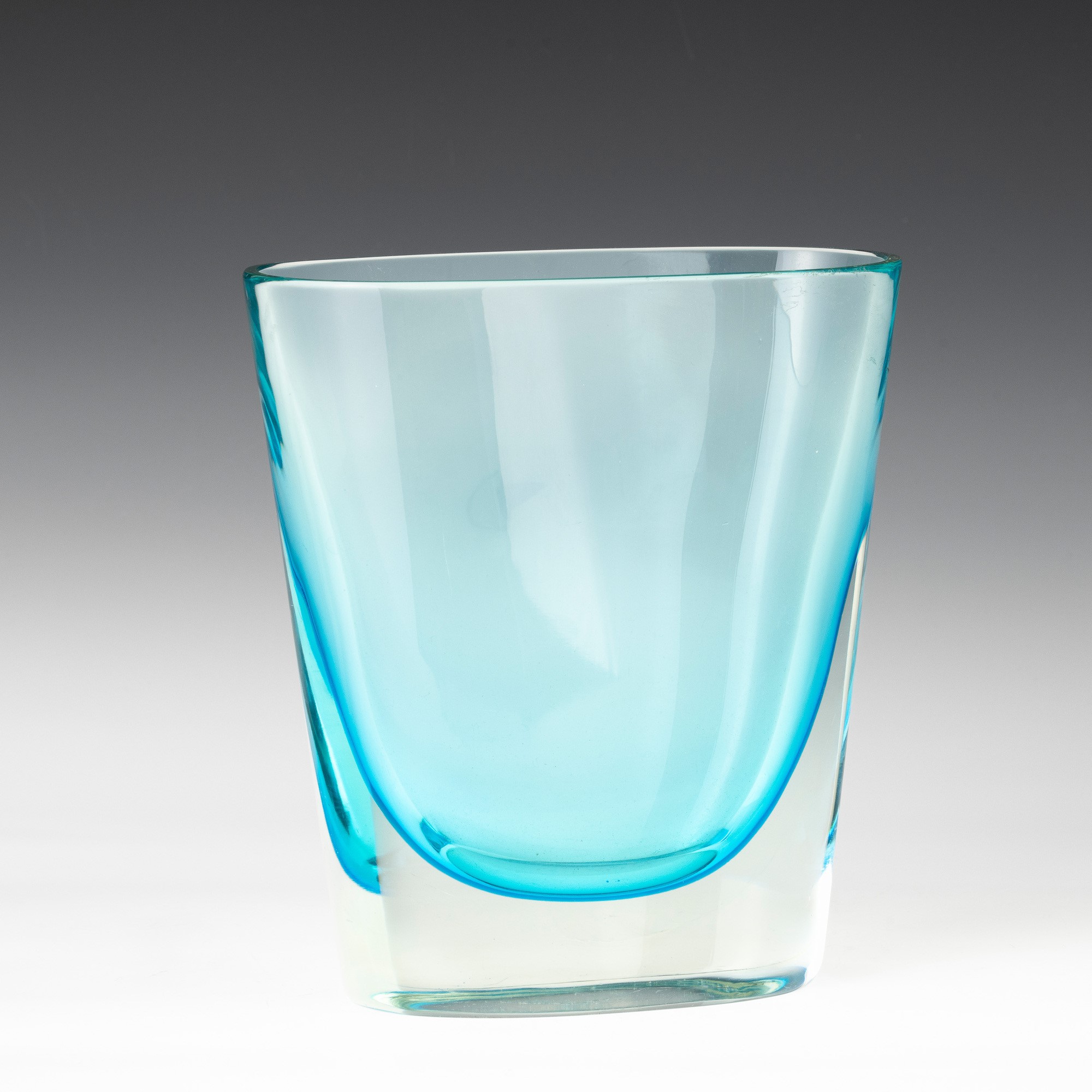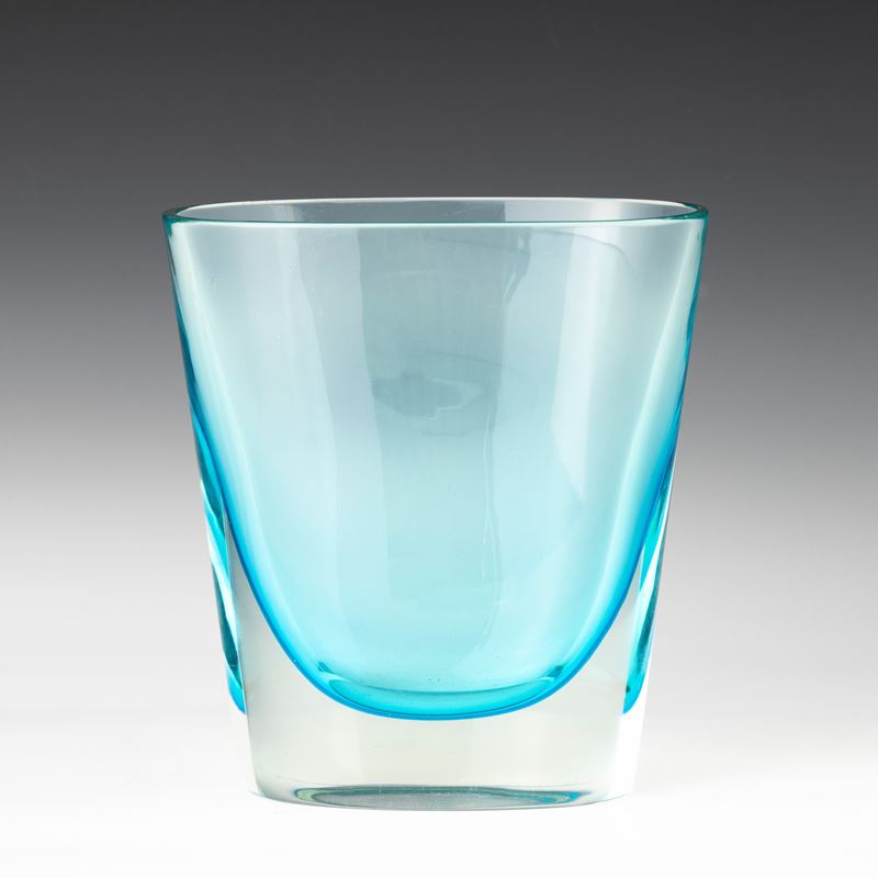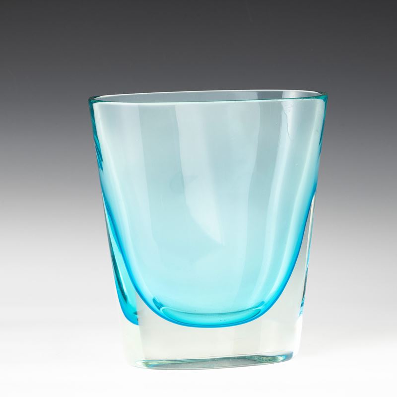Vaso troncoconico a sezione ovale in vetro sommerso azzurrino.