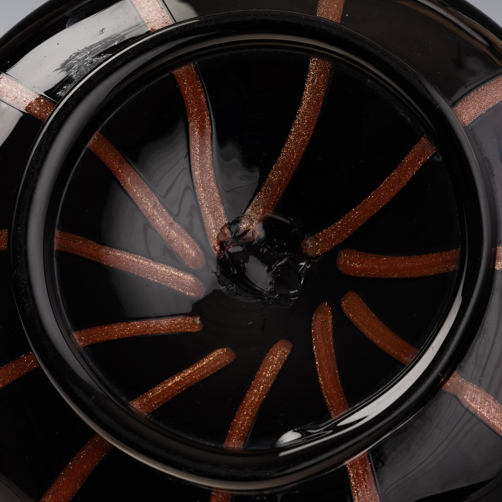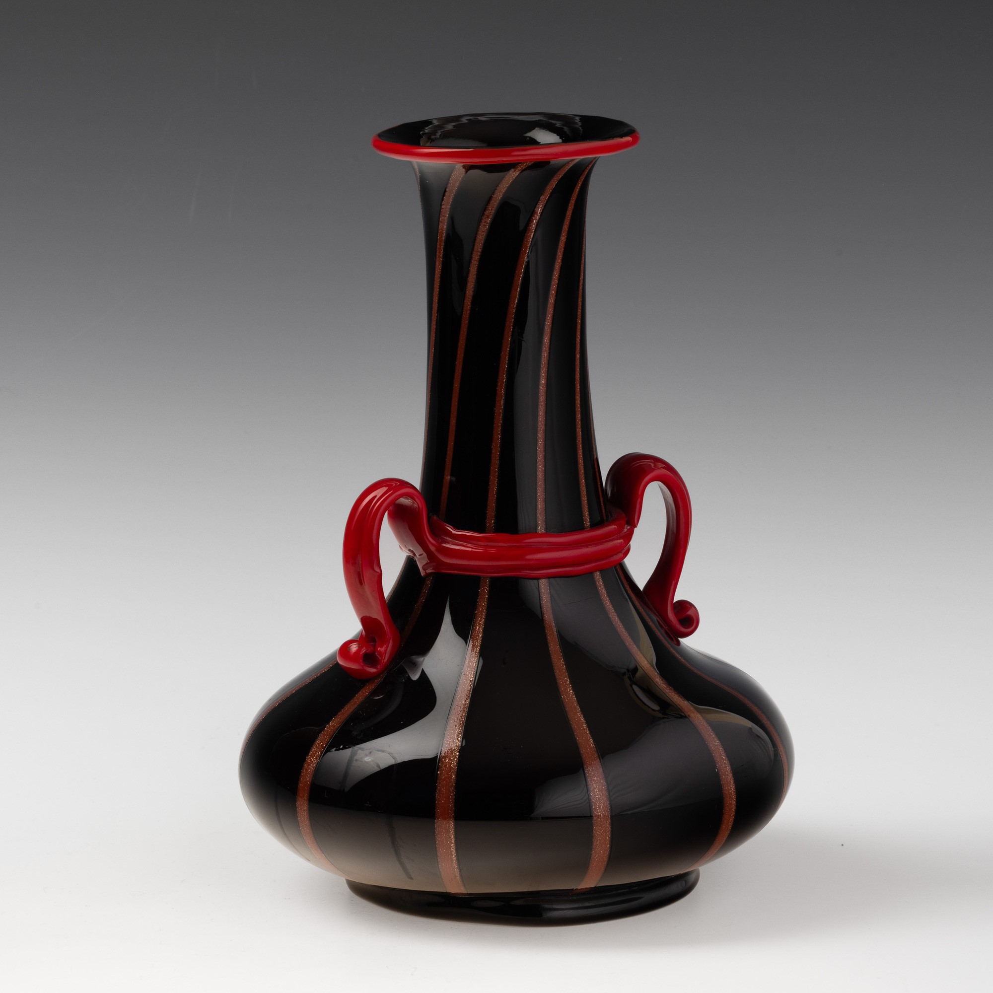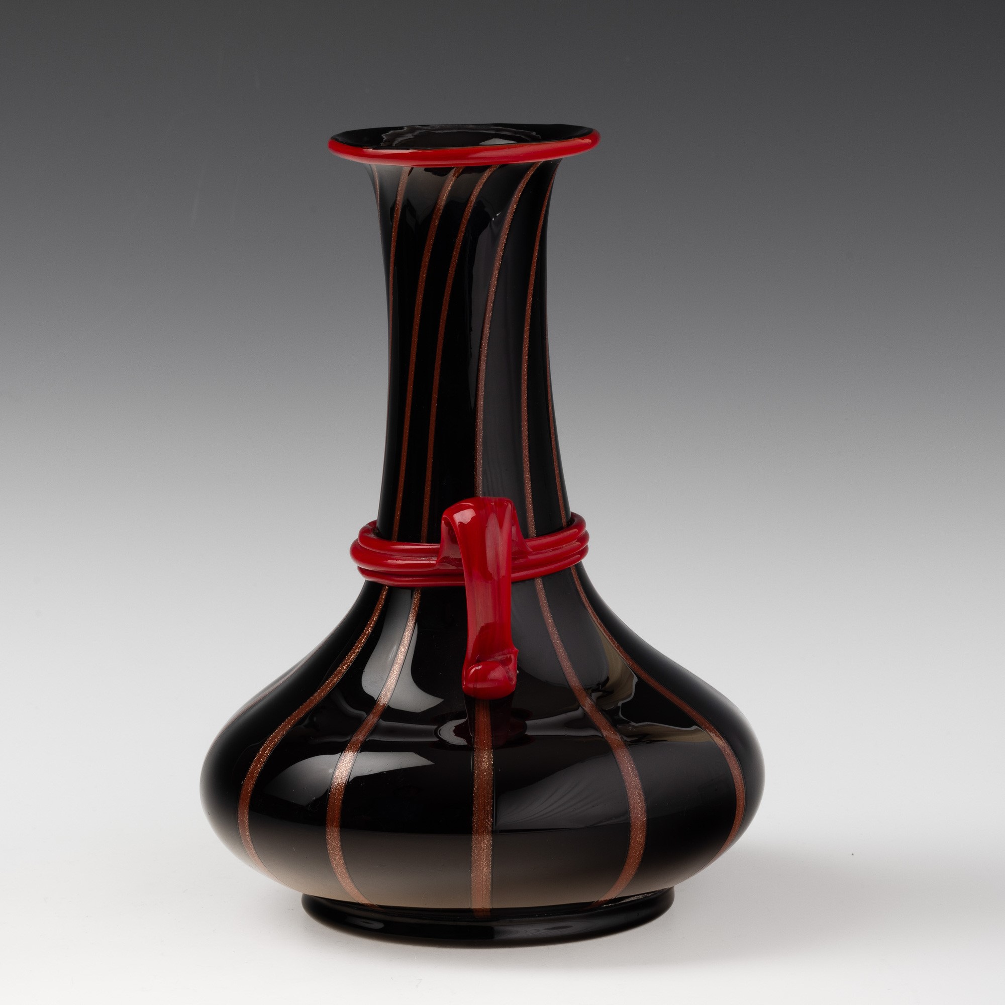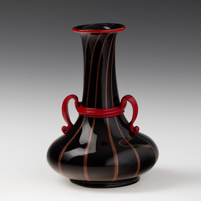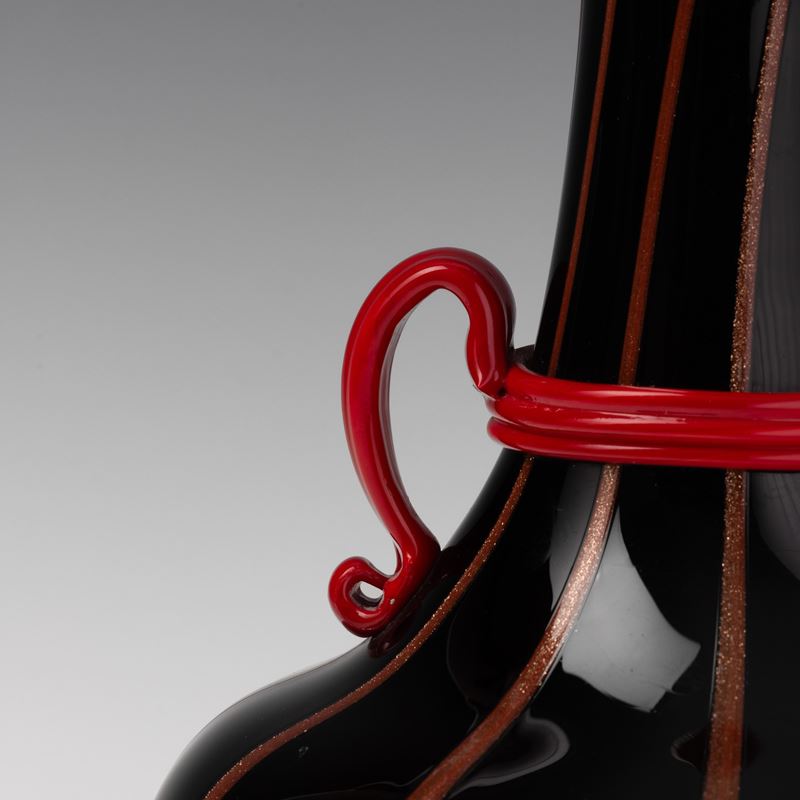 Vaso a bottiglia in vetro nero con decoro di canne avventurina. Anse con ghiera e bocca applicati in pasta vitrea rosso corallo.