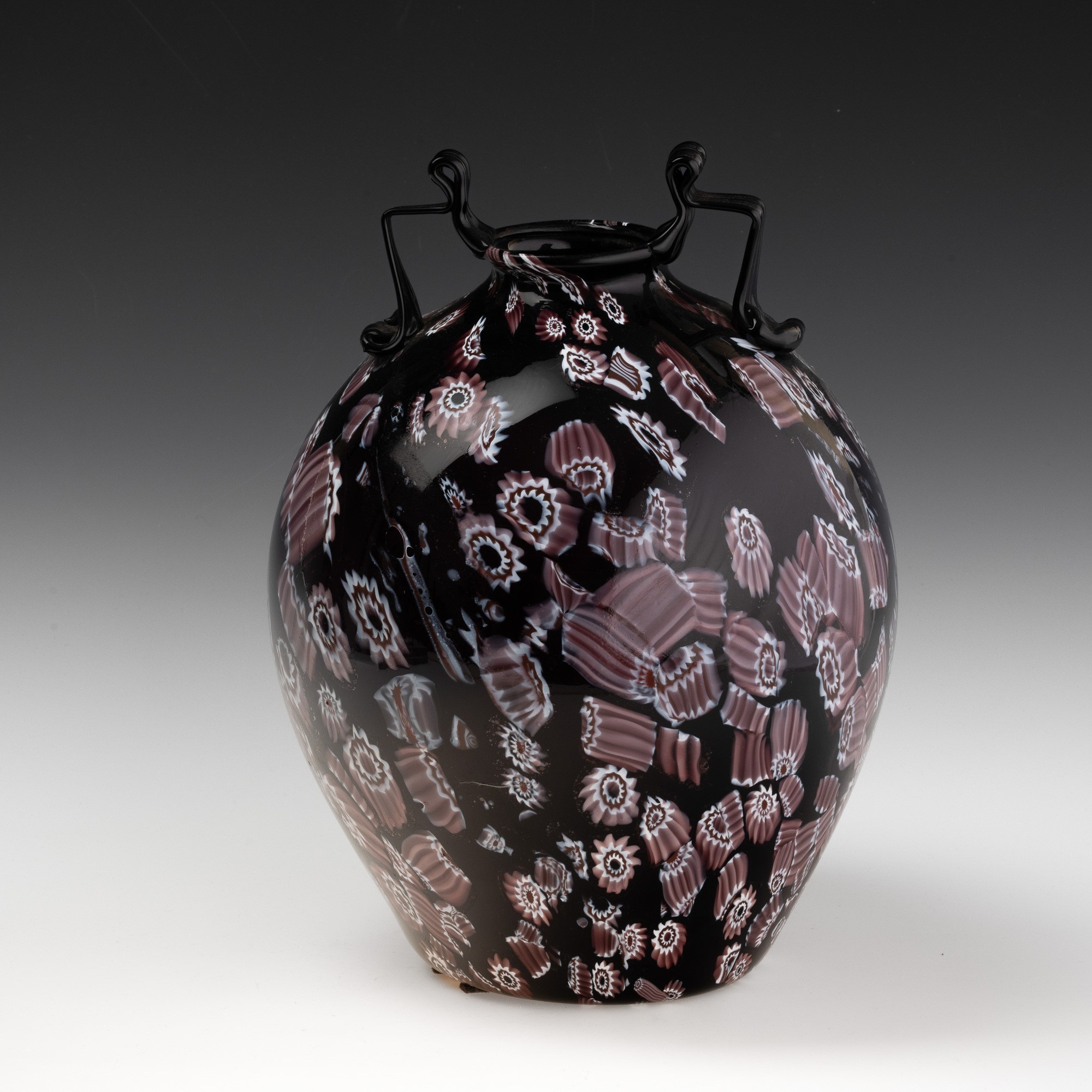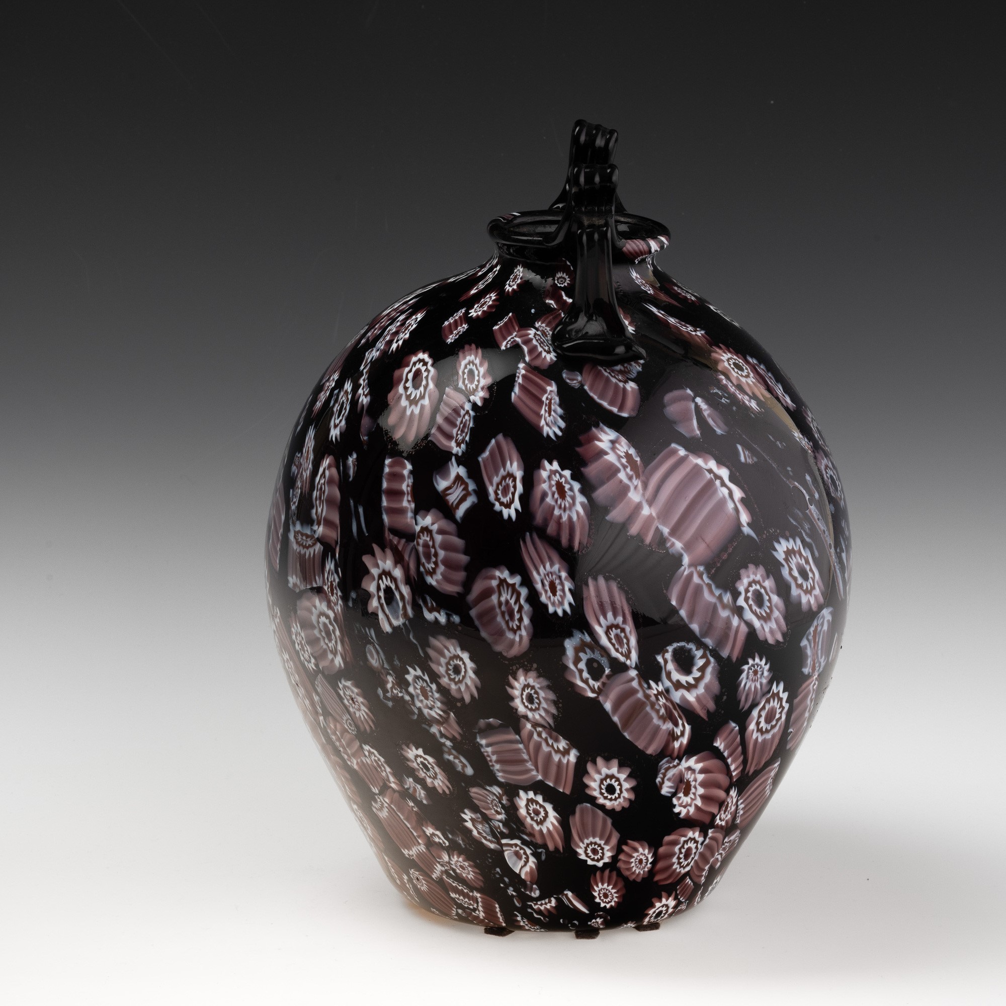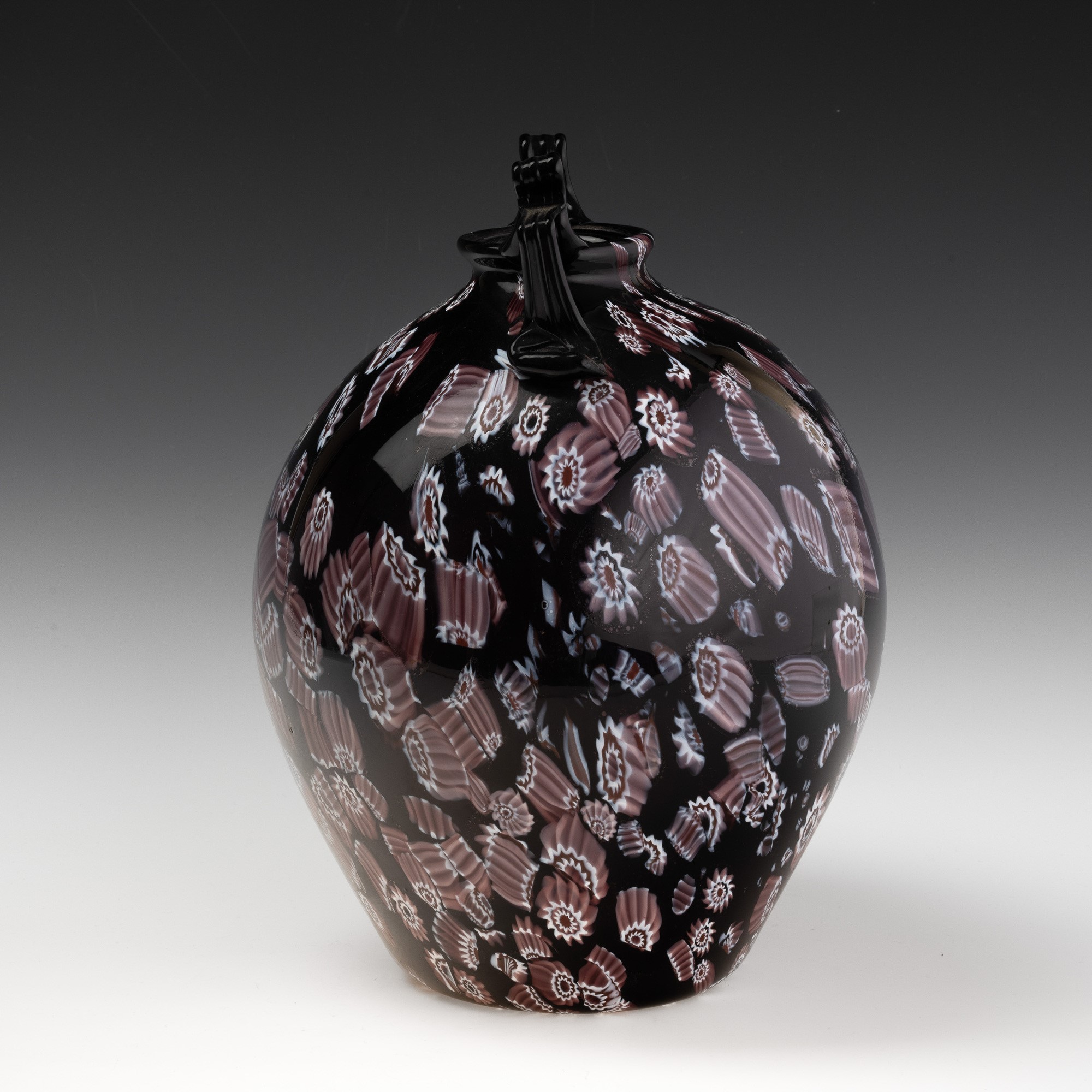 Vaso a uovo in vetro soffiato ciclamino con decoro di sezioni di canne a stella. Anse a nastro applicate.
