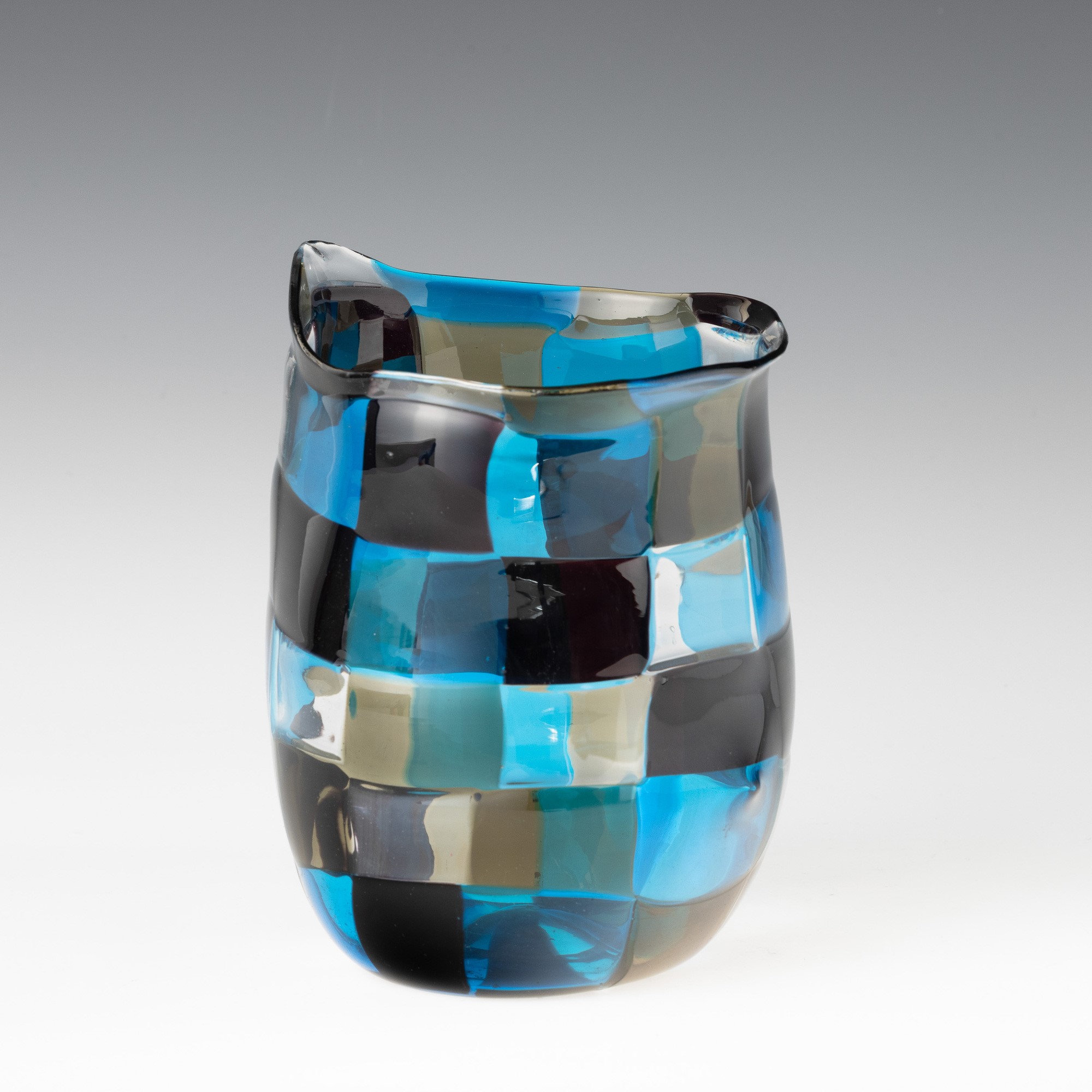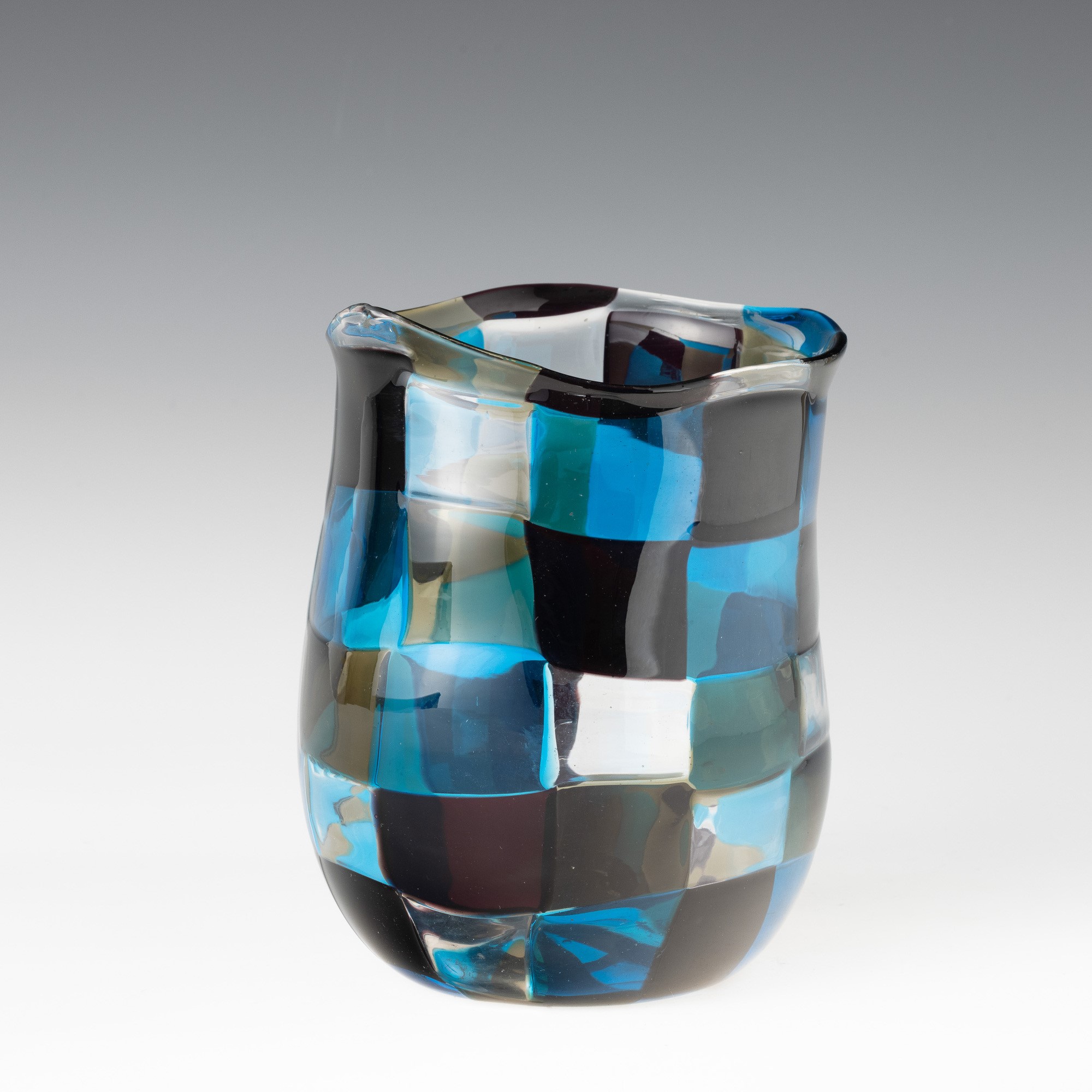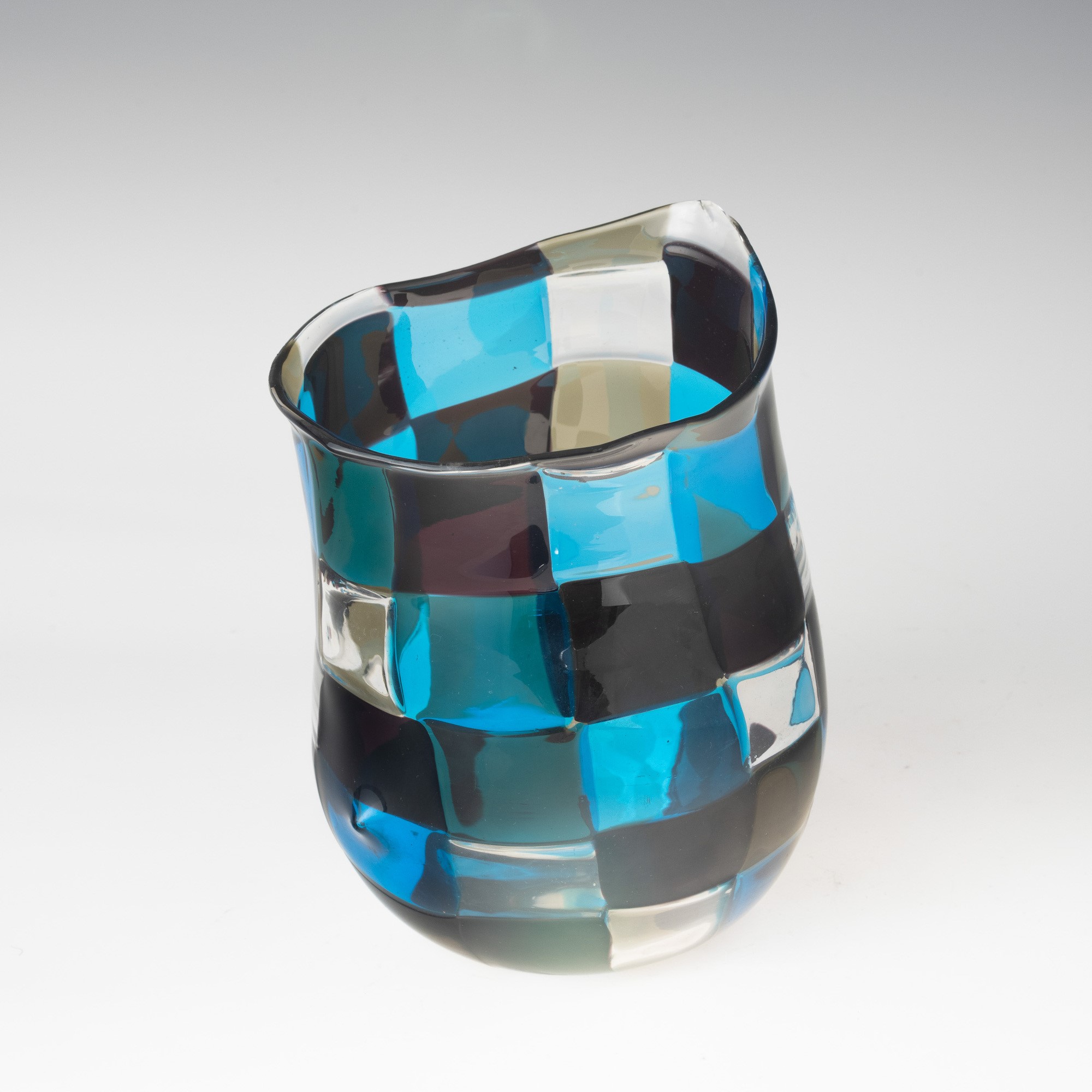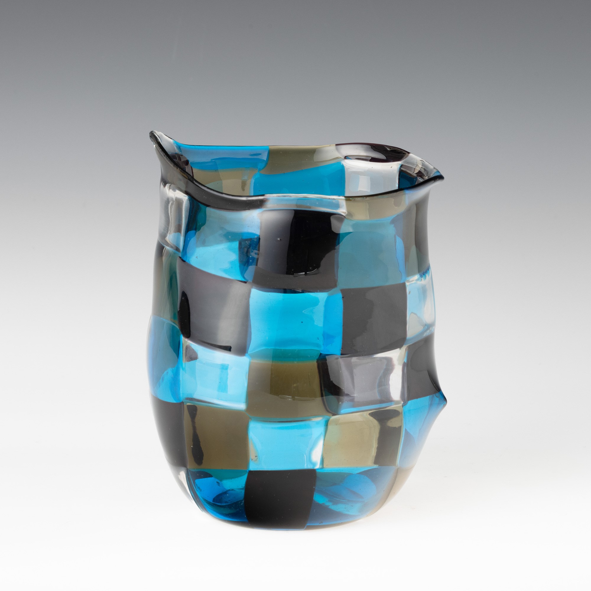 Raro vaso serie Pezzati di forma asimmetrica con bordo irregolare in vetro soffiato con decoro di tessere multicolori. Firma all’acido Venini Murano Italia.
