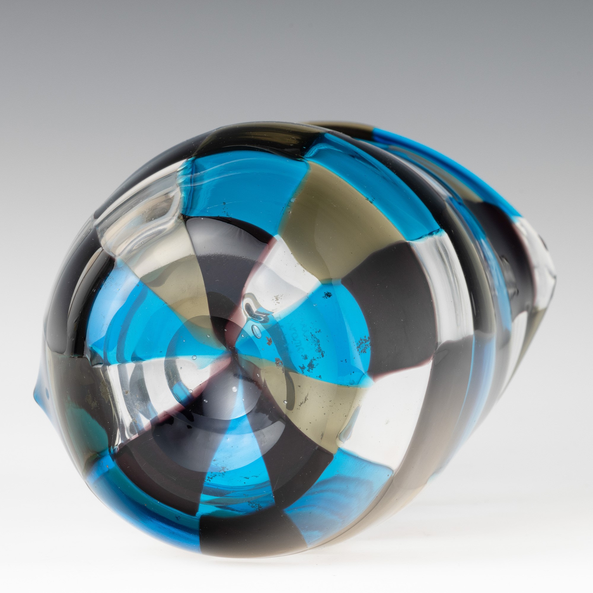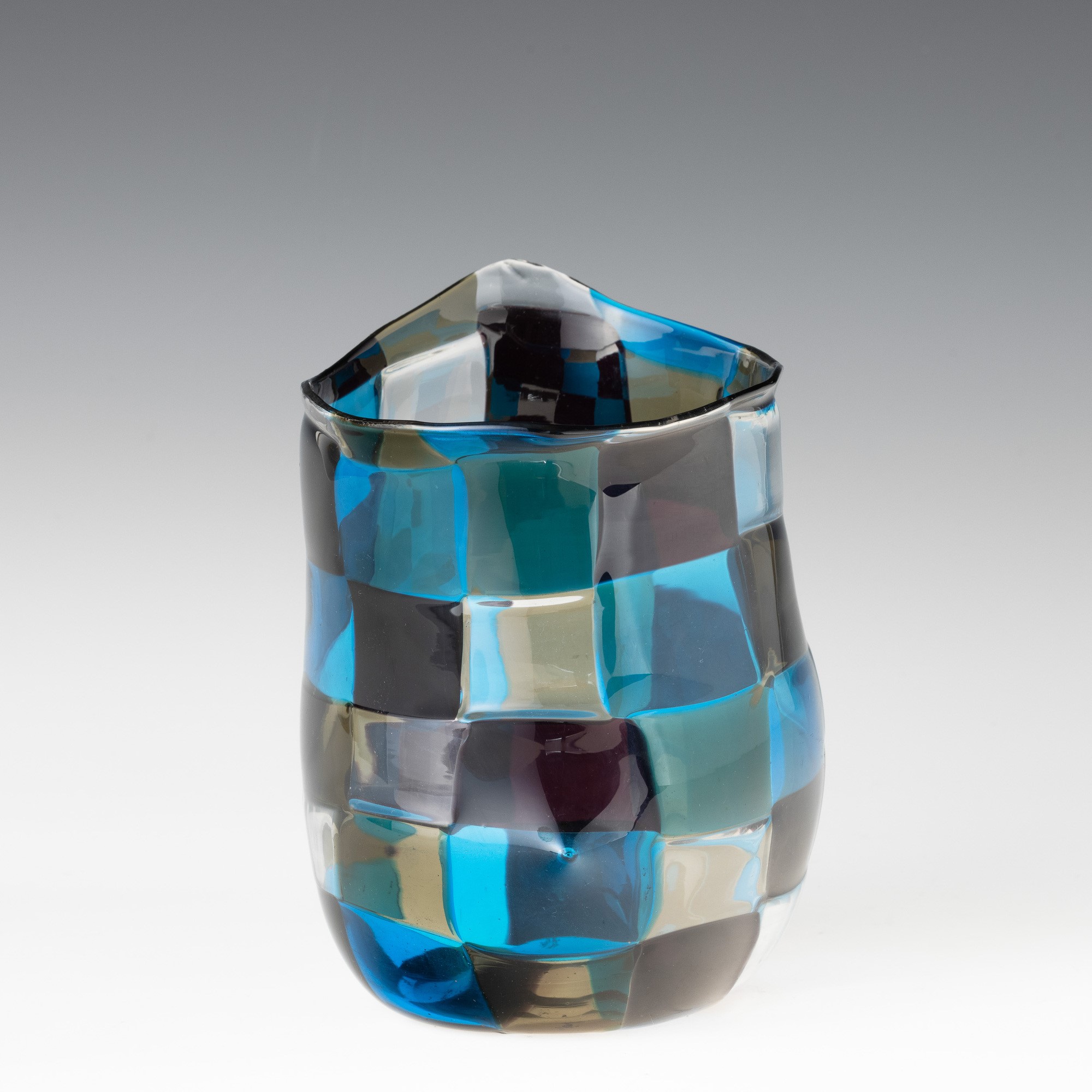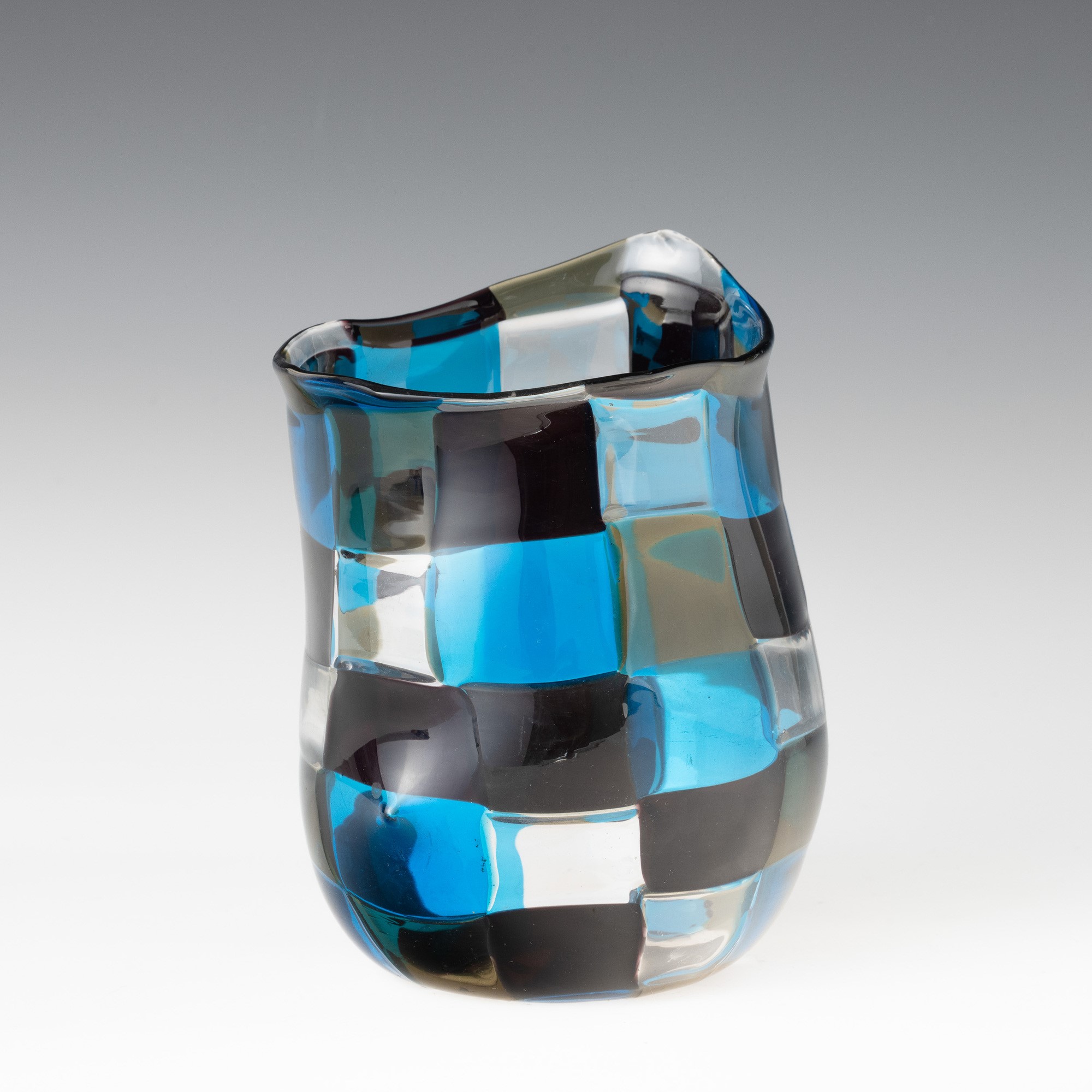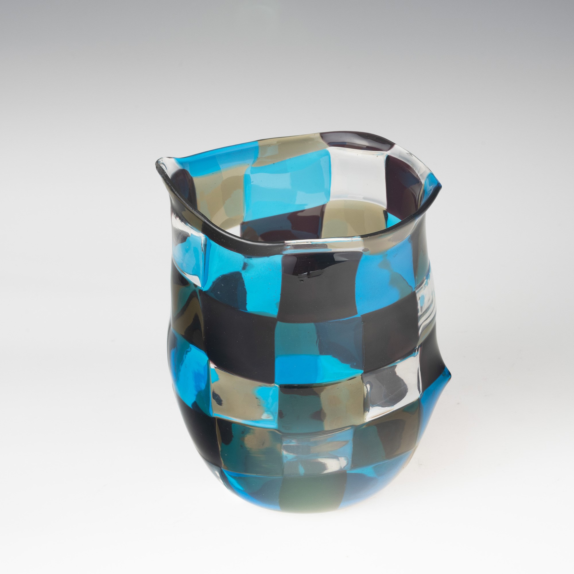 Raro vaso serie Pezzati di forma asimmetrica con bordo irregolare in vetro soffiato con decoro di tessere multicolori. Firma all’acido Venini Murano Italia.