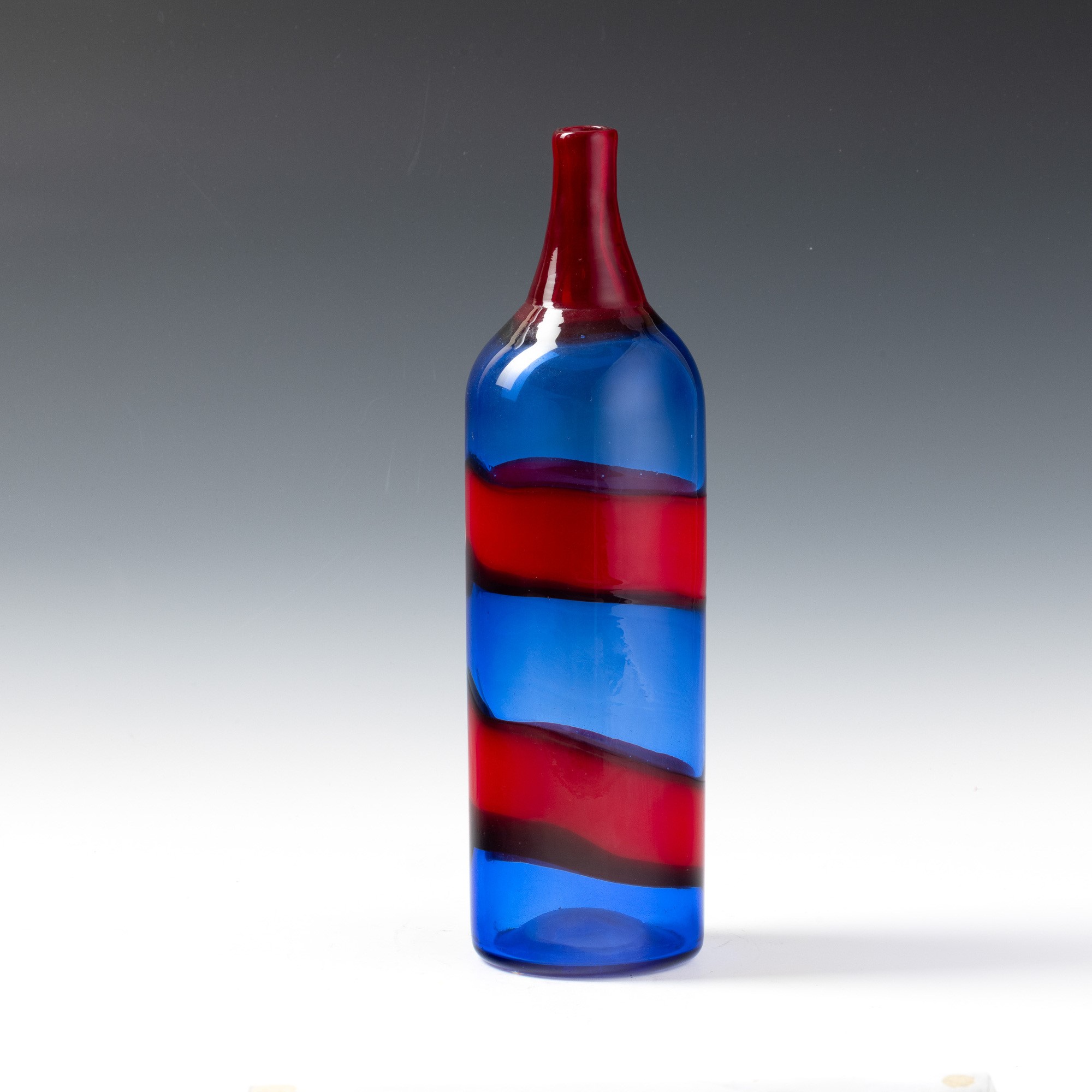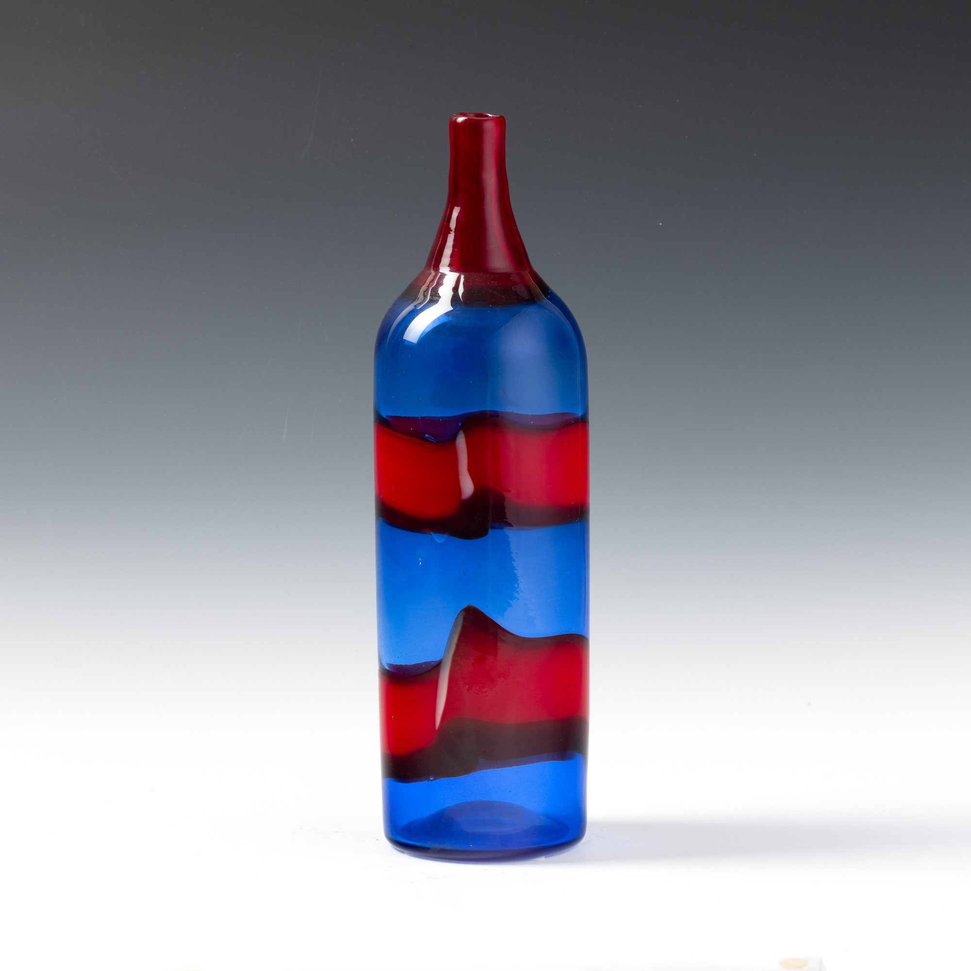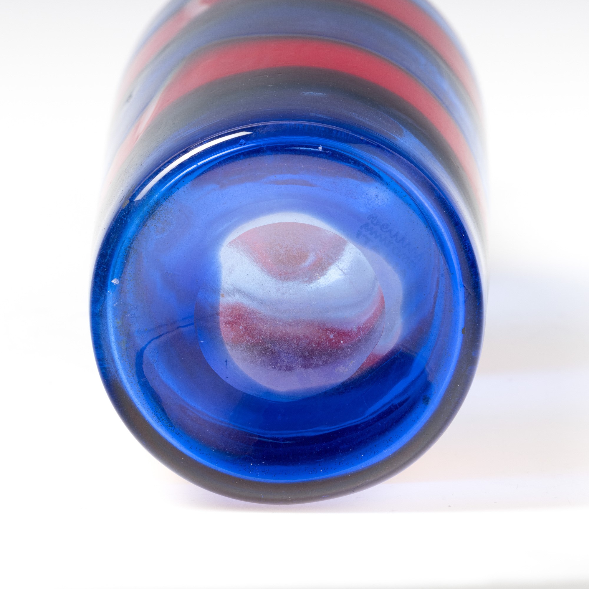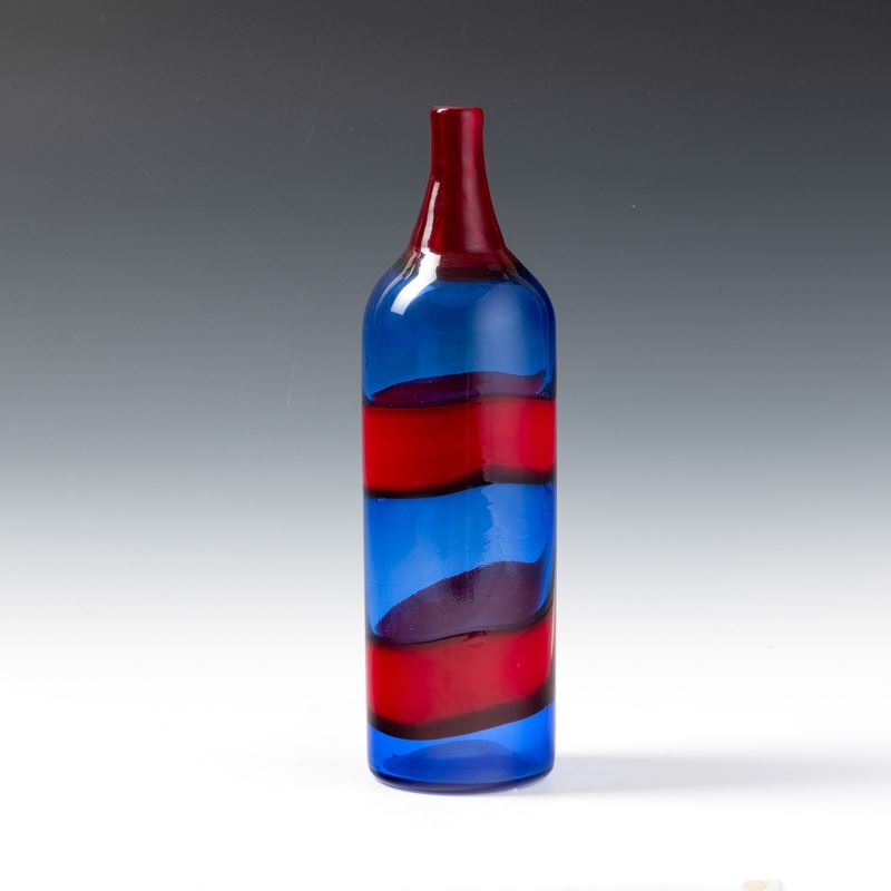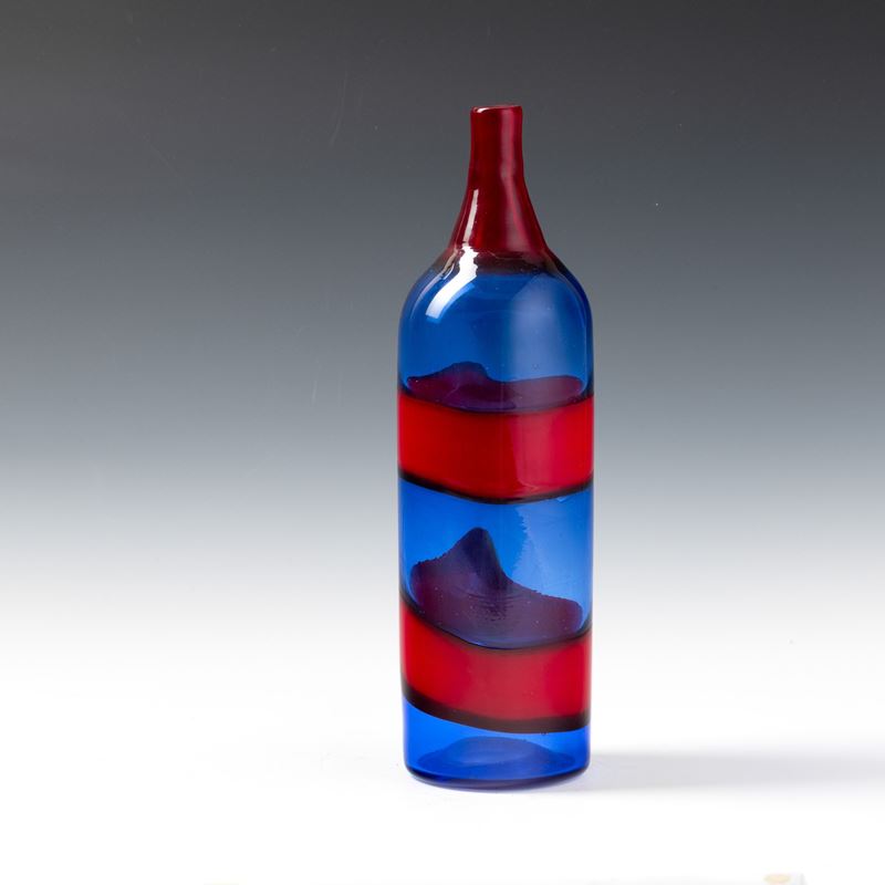 Vaso a bottiglia in vetro soffiato blu con decoro di fasce orizzontali rosso opaco sul corpo e rosso trasparente sul collo.